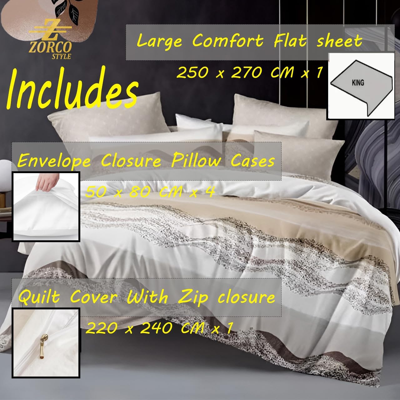 ZORCO STYLE Luxurious 6 Pieces Cotton King Size Bedding Set, Modern and Attractive Duvet Cover Set with Flat Sheet, Quilt Cover, 4 Pillow Cases (Brown)
