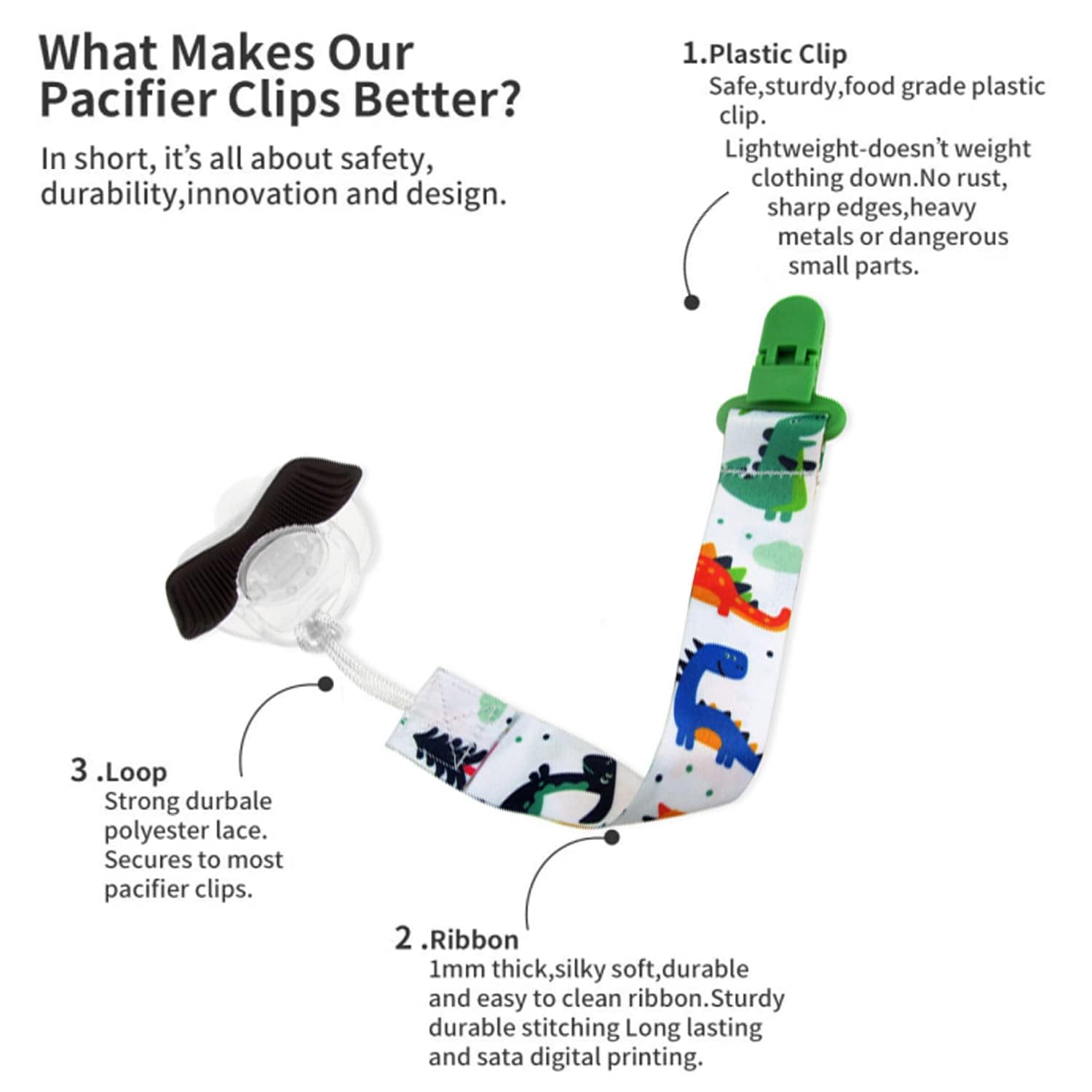 - 👶 NO MORE LOST PACIFIERS - Made of high-quality, soft-to-the-touch, machine/hand washable durable polyester. The high-quality clip ensures the pacifier stays securely attached. Unlike other metal clip chains, these are equipped with a baby-proof plastic clip that is non-toxic.