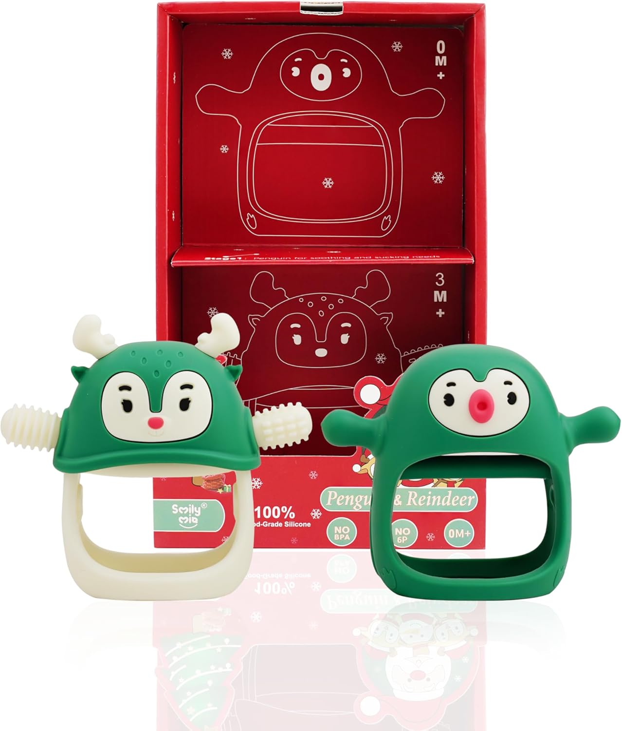 For 0-6Months Babies, sucking is calming. So for 0-6months, best infant toys should be able to be put into the mouth and work as a pacifier. The penguin is designed for sucking, works like a charm especially for breastfed babies. Baby's tooth start to grow inside from 3month, so for 3-6months babies, best teether should meet two requests: sucking, as well as teething pain relief.