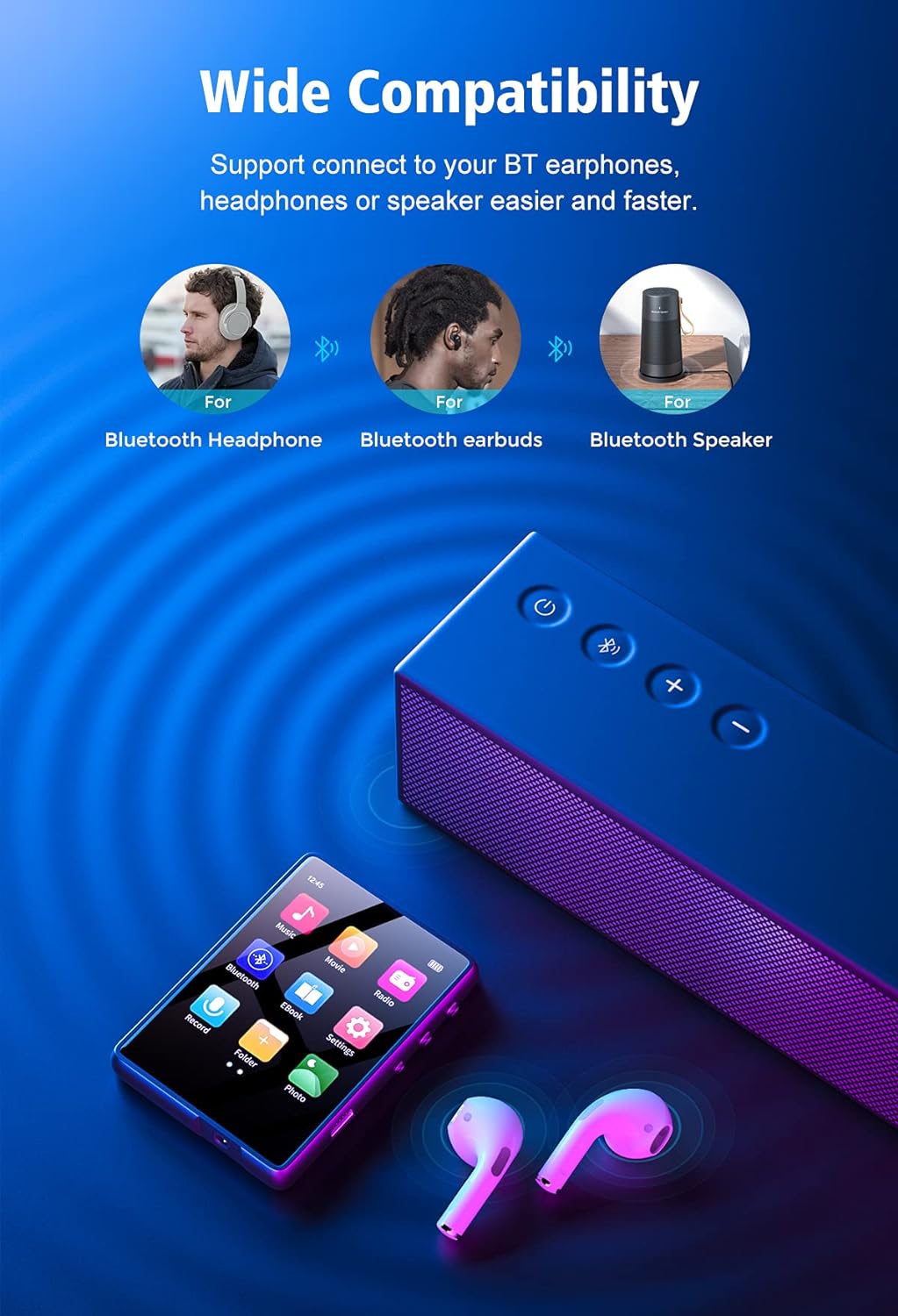بلوتوث 5.3 محدث: دمج معيار Bluetooth 5.3 ، يوفر مشغل mp3 هذا اتصالا سريعا ومستقرا. كل ما عليك فعله هو استخدام جهاز يدعم تقنية Bluetooth ، مثل سماعات الرأس ومكبرات الصوت. لاحظ أنه لا يمكن إقران مشغل MP3 هذا بالهواتف المحمولة أو أجهزة الكمبيوتر.