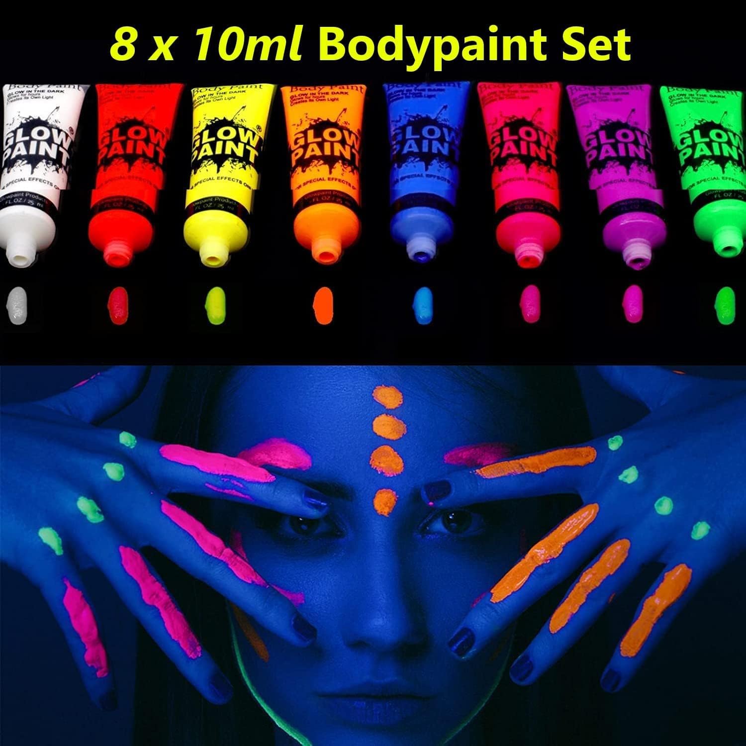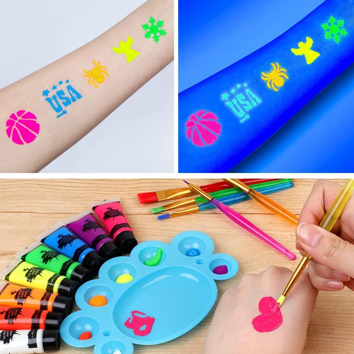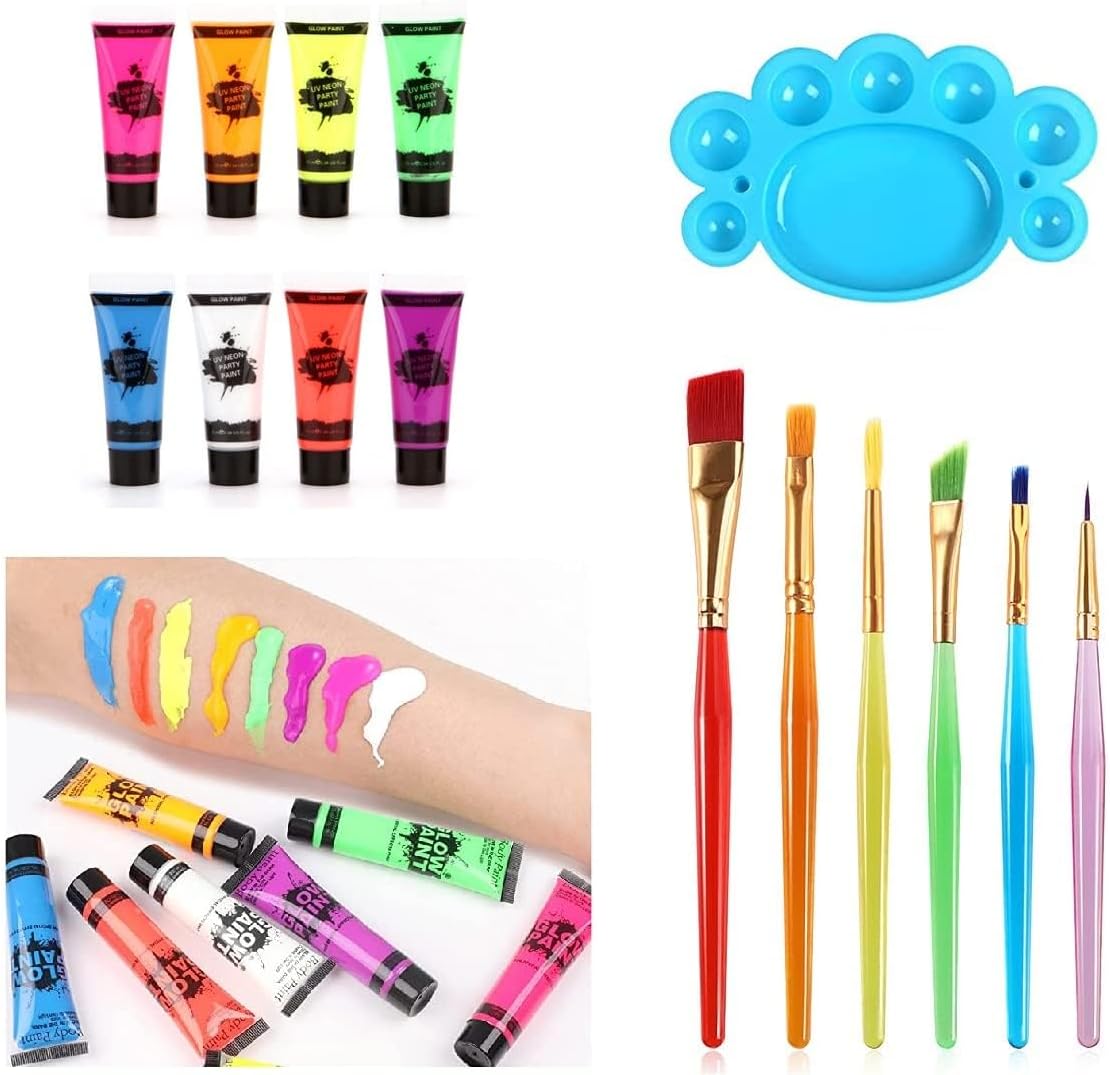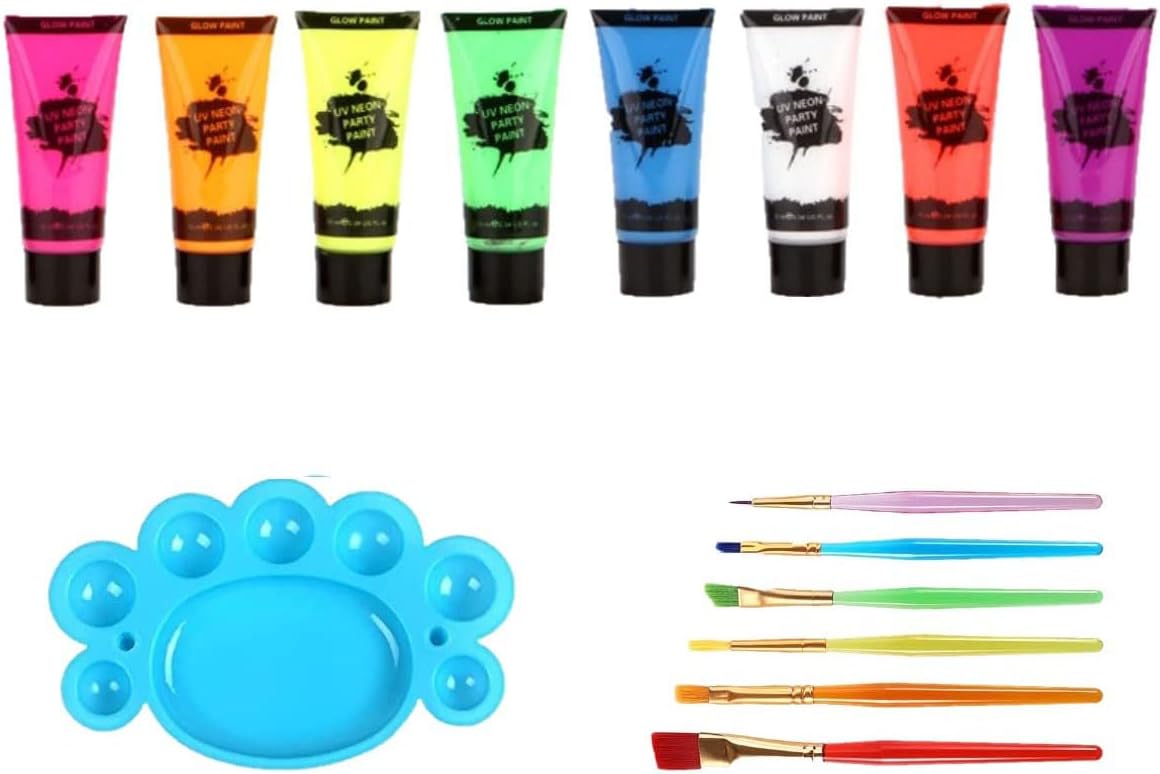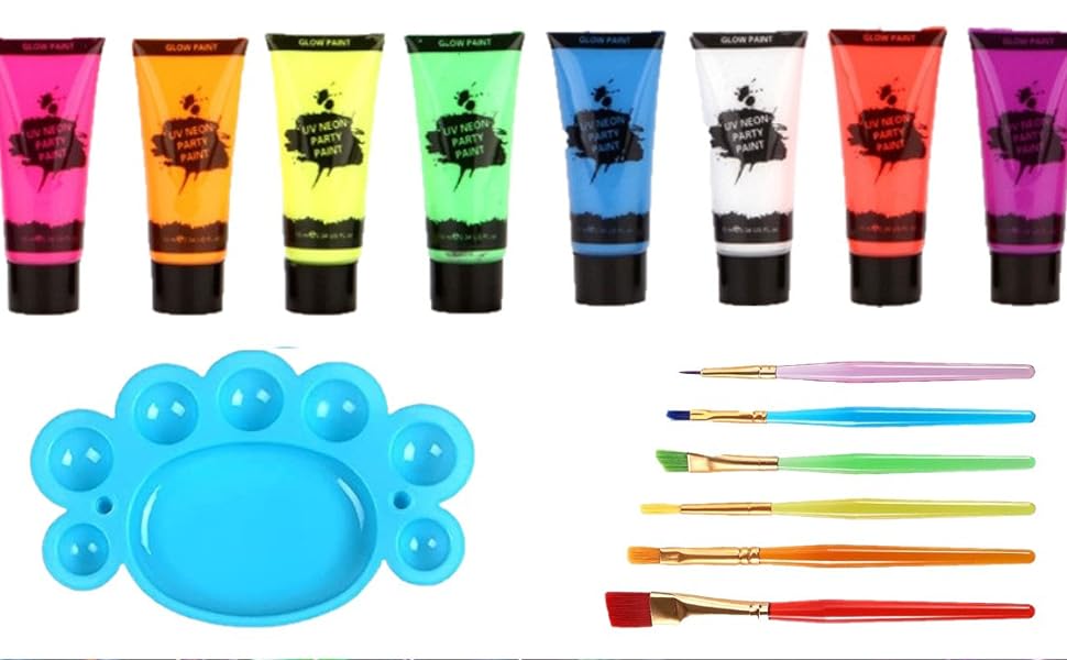✨️【8 UV body Paints with Brush and Palette】Our UV boby and face painting set contains 6 brushes, a colour palette and 8 tubes of neon body threads (10 ml each) in different colours. All-in-1 glow body painting set, simple and practical makes you an eye-catcher at the neon party.