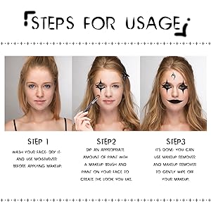 - 【EASY TO APPLY AND WASH OFF】This face paint is easy to apply and can be easily applied to the skin with a sponge, brush or fingertips. When you need to remove makeup, you can remove it with cleansing oil or olive oil, wipe it off with a paper towel, and wash it with facial cleanser and water.