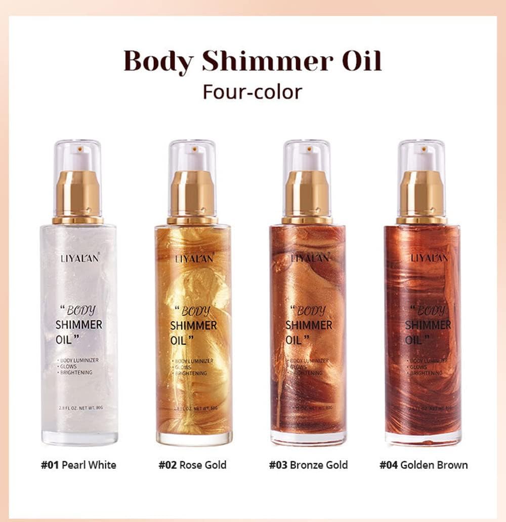 Natural Ingredients This shimmer body oil is made of natural oils, botanicals and a hydrating marine extract, light moisturizing texture and will not cake or settle into fine lines or wrinkles. It can also enhance the elasticity, texture and vibrancy of skin.