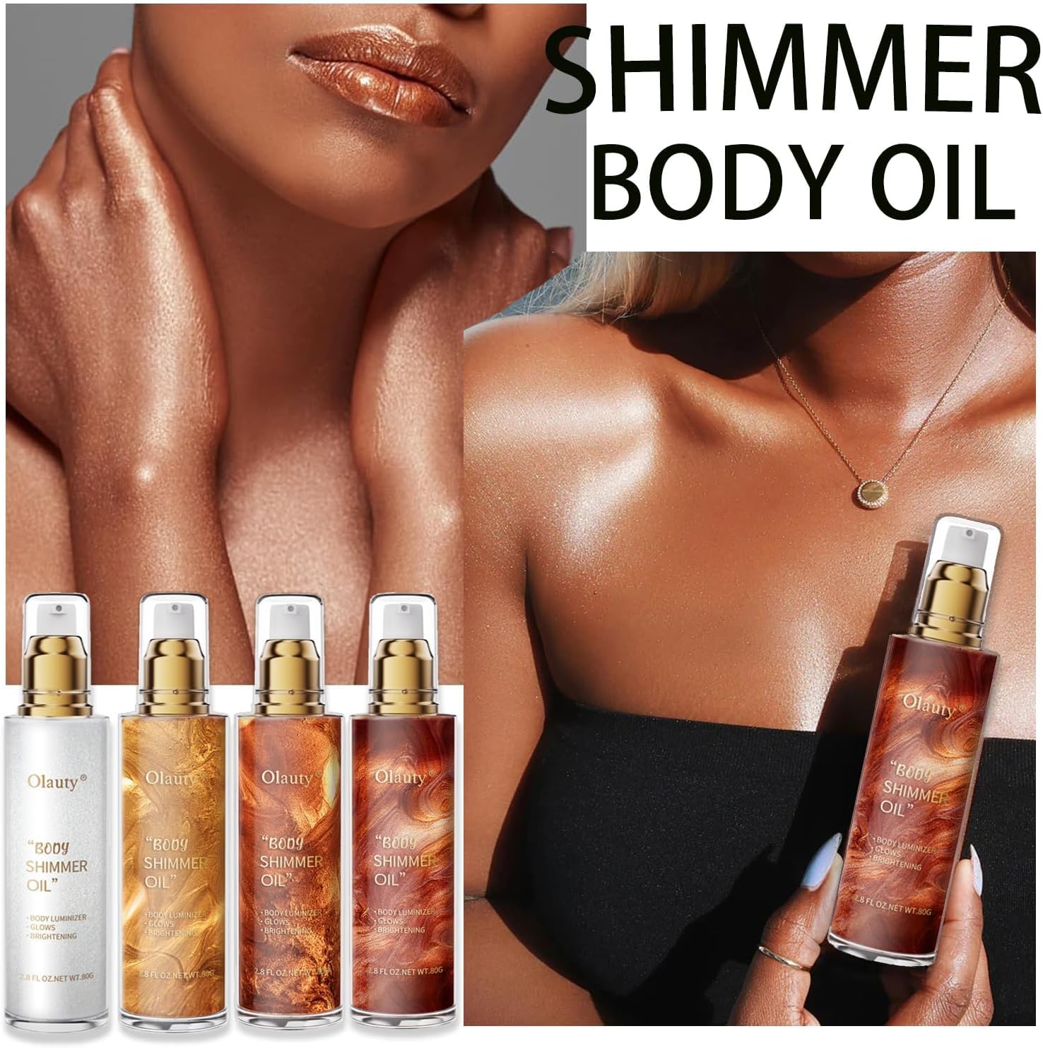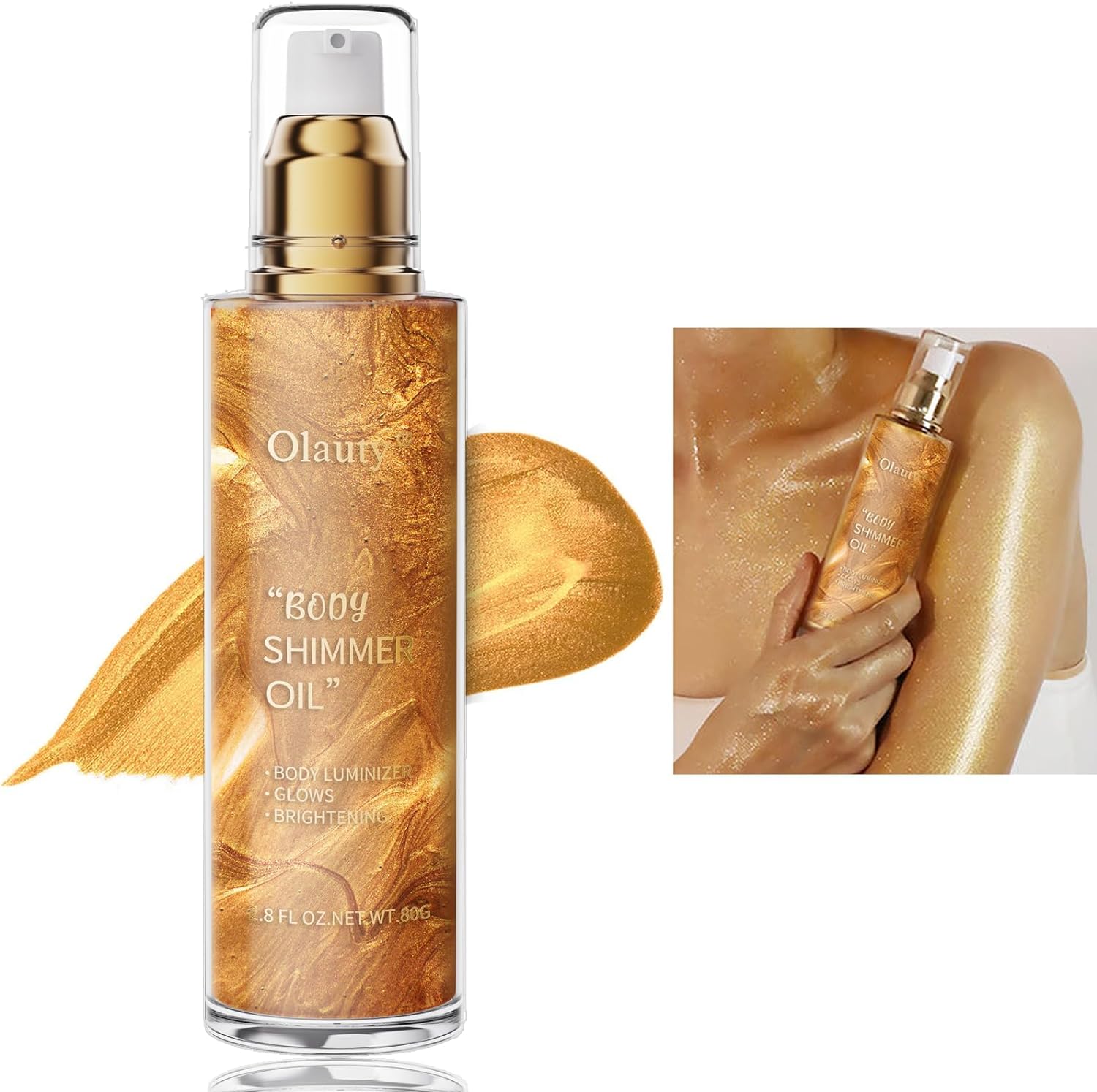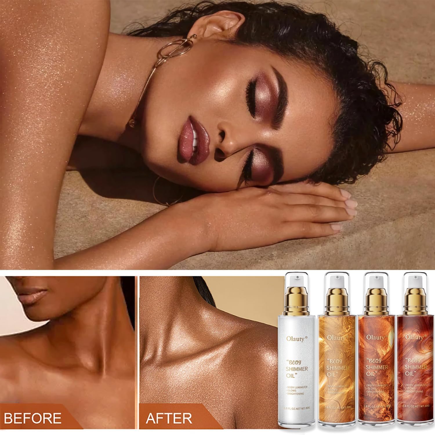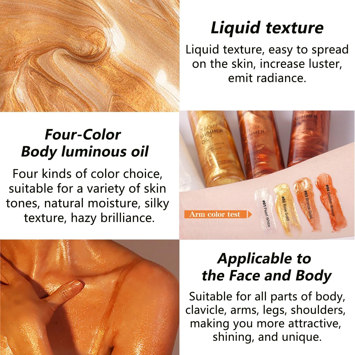 【Natural Ingredients】This body shimmer oil with moisturizing formula, light texture and won't cake or settle into fine lines or wrinkles. When used, this body luminizer creates a shimmer glow and provides good coverage for a smooth, shimmering finish.