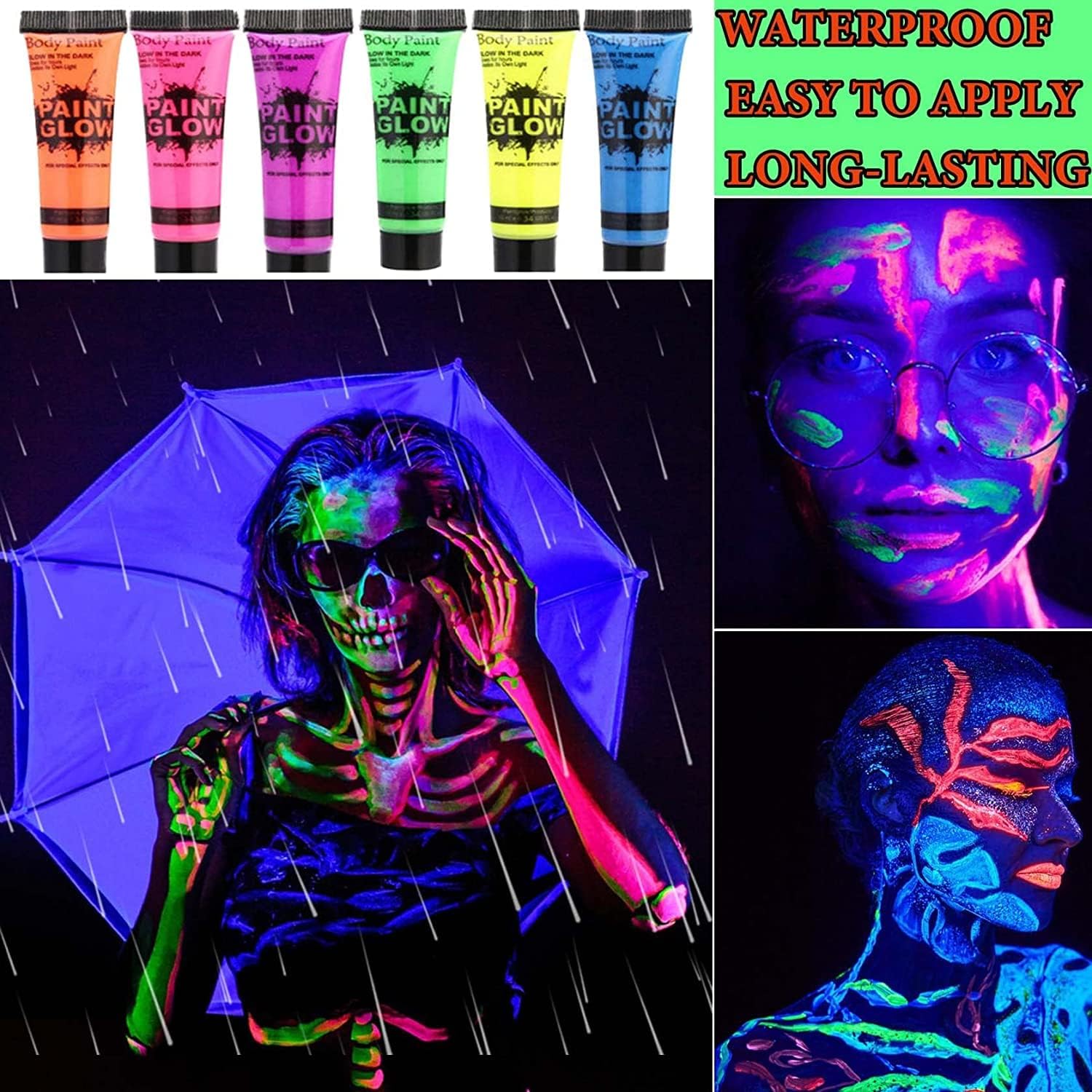 SYOSI Glow in Dark Face Body Paint, UV Blacklight Neon Fluorescent Blacklight Neon Face Body Paints, Easily Cleanable Face Body Paint Set Neon Body Makeup Glow in the Dark Party Supplies, 6 Pcs