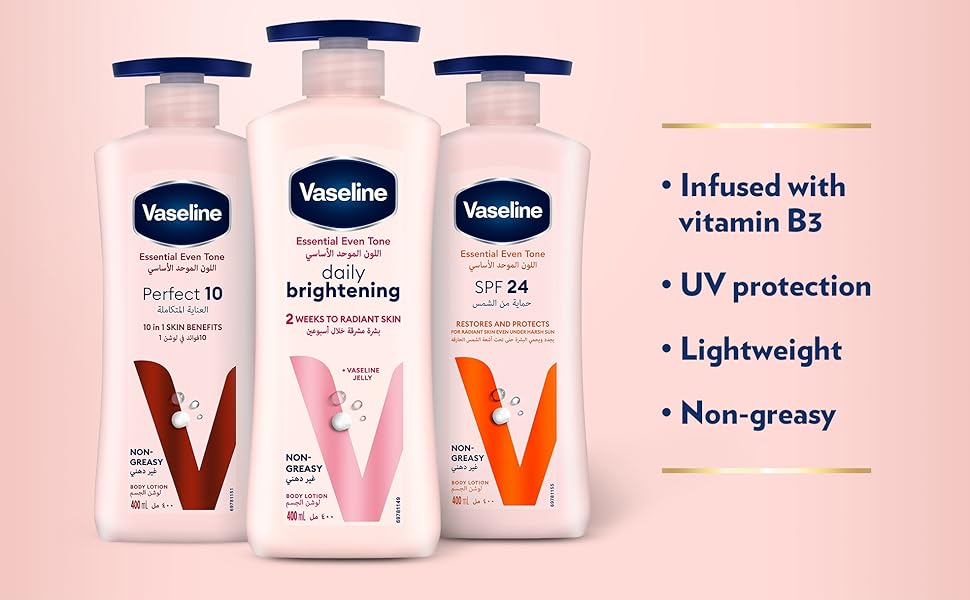 Contains droplets of Vaseline jelly which helps restore skin from within, leaving it radiant and visibly more even-toned