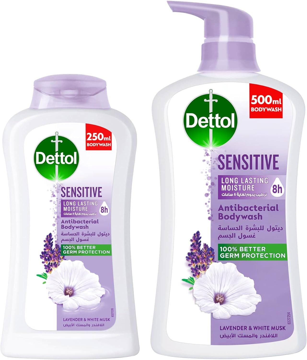 Dettol Sensitive Showergel & Bodywash, Lavender & White Musk Fragrance for Effective Germ Protection & Personal Hygiene, 250ml and 500ml (Pack of 2) (Packaging may vary)