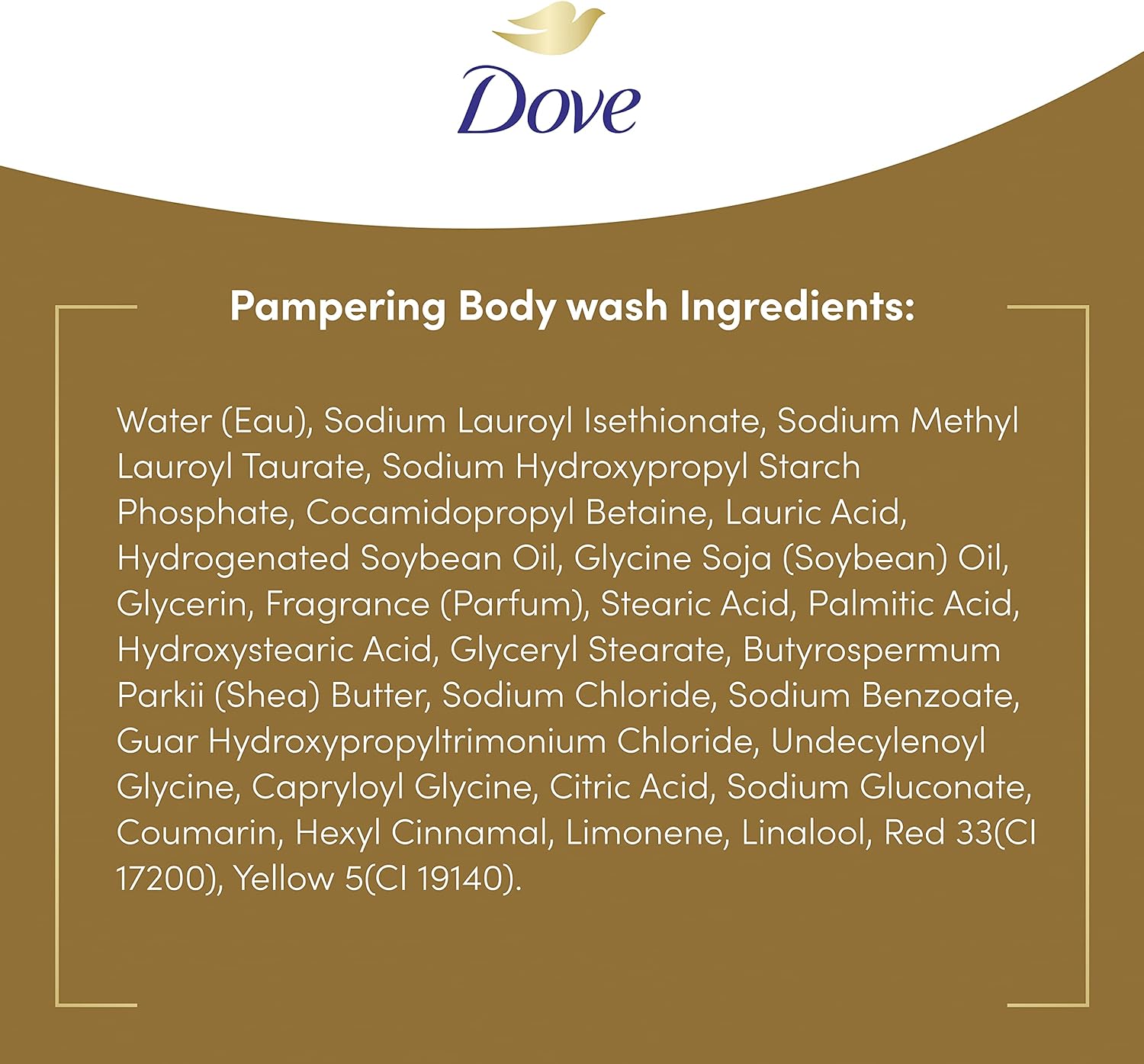 PLANT-BASED MOISTURIZER: Naturally derived cleansers and skin-natural nutrients, Dove Pampering Body Wash is microbiome gentle, so you’ll feel beautifully nourished while maintaining healthy skin.CARE AS YOU CLEAN: The cleansing efficacy and skin care you need, all in one product. Dove Body Wash is also effective at cleansing hands