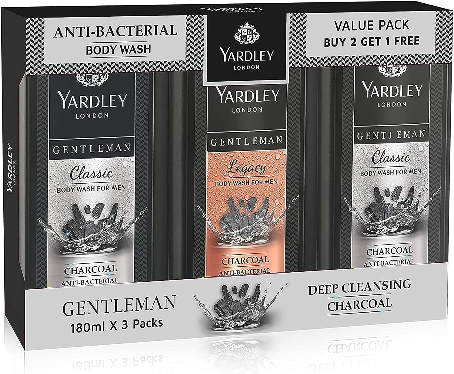YARDLEY LONDON Gentleman Antibacterial Deep Cleansing Charcoal Body Wash 1 Classic +2 Legacy, 180 ml, Pack of 3