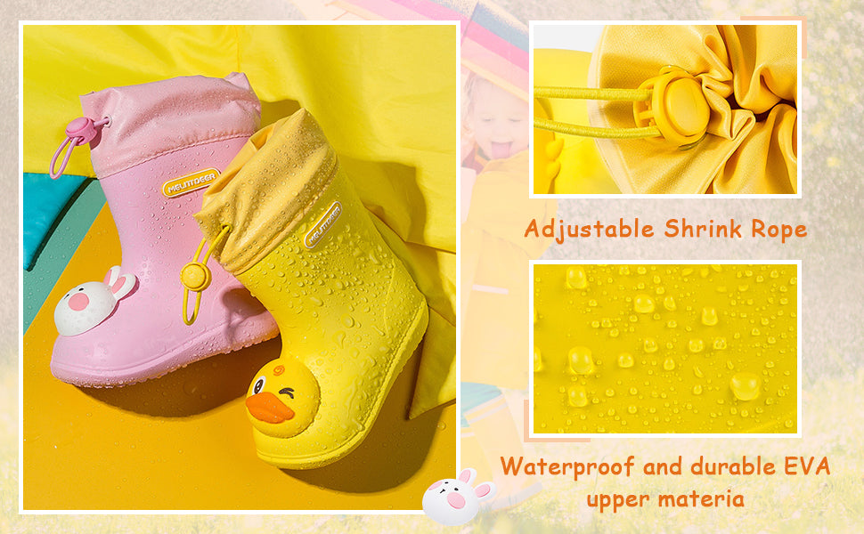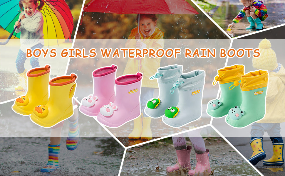 - Easy to clean--Girl wellies. Made of high-quality rubber compound, it can be wiped off with a damp towel or paper towel when dirty. These toddler rain boots are 100% waterproof and suitable for raining and snowing days.