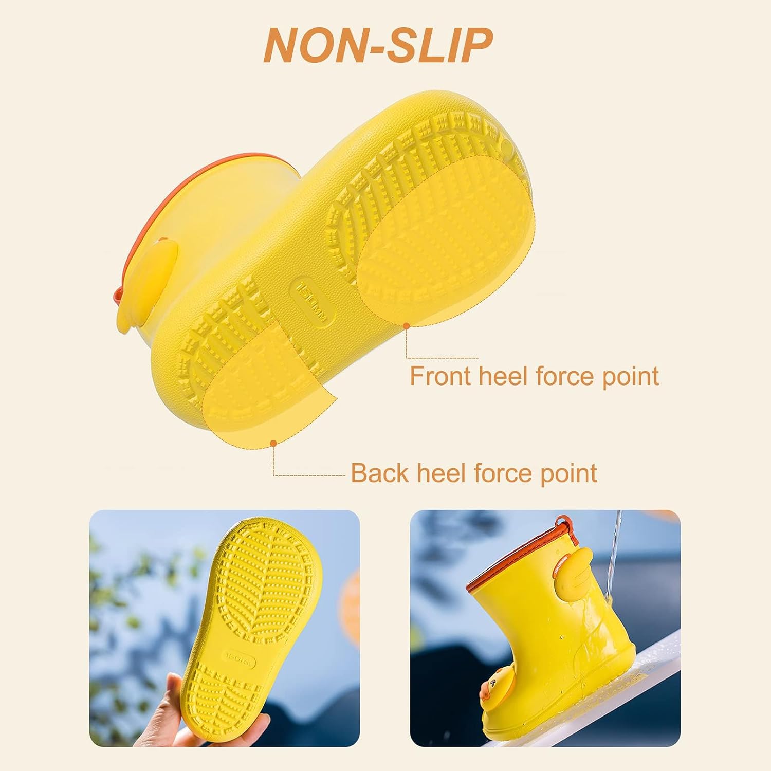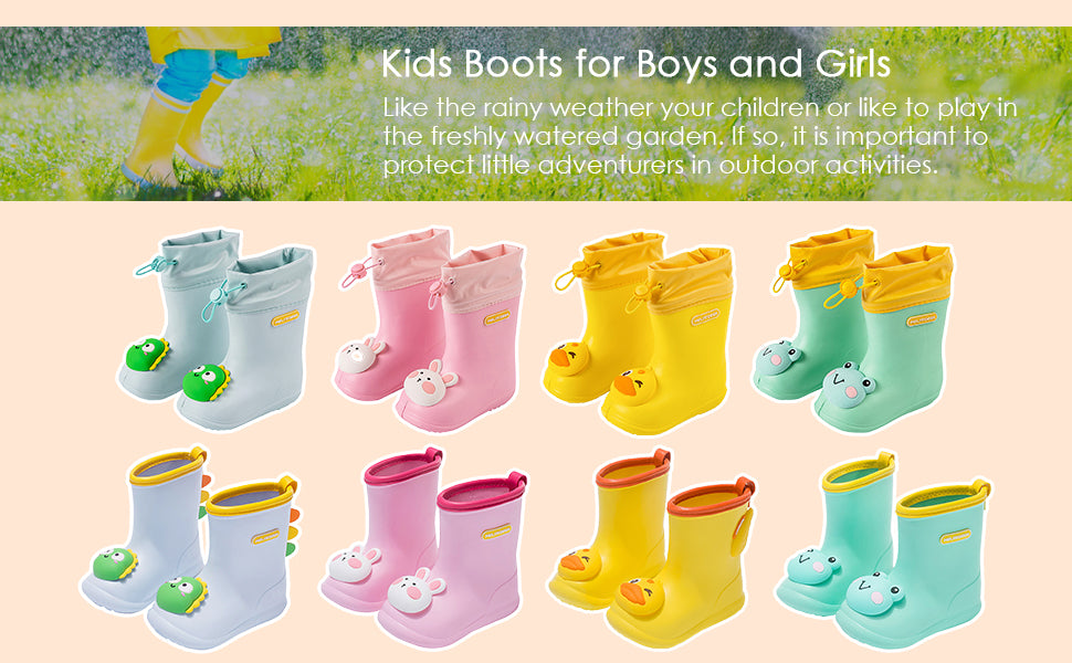 - Protection--Kids wellies. slightly curved soles conform to the curves of your child's feet, taking care of your child's feet every time you walk. The sleek exterior protects the toddler rain boots from tracking dirt and soil.