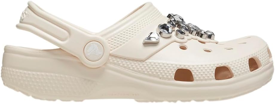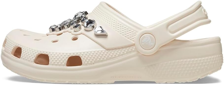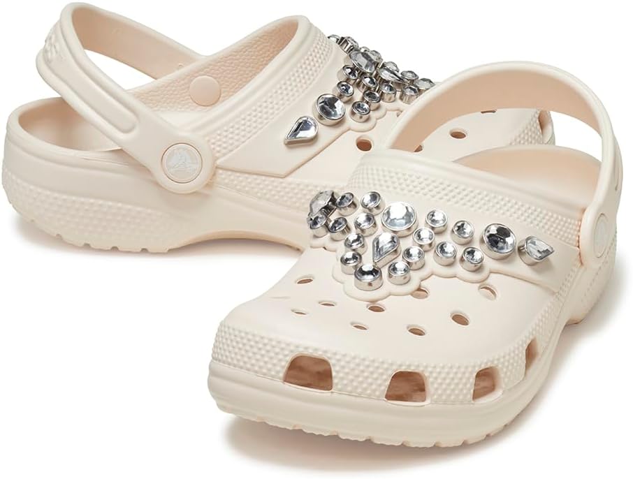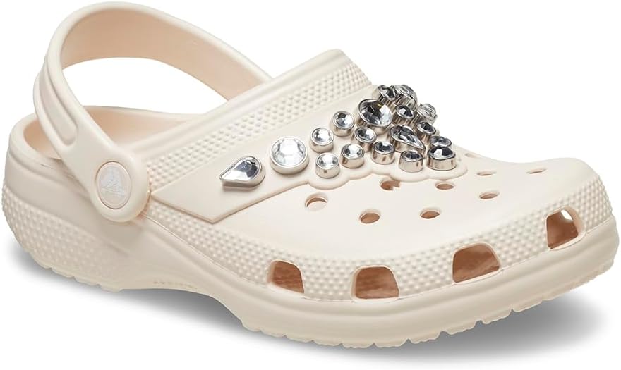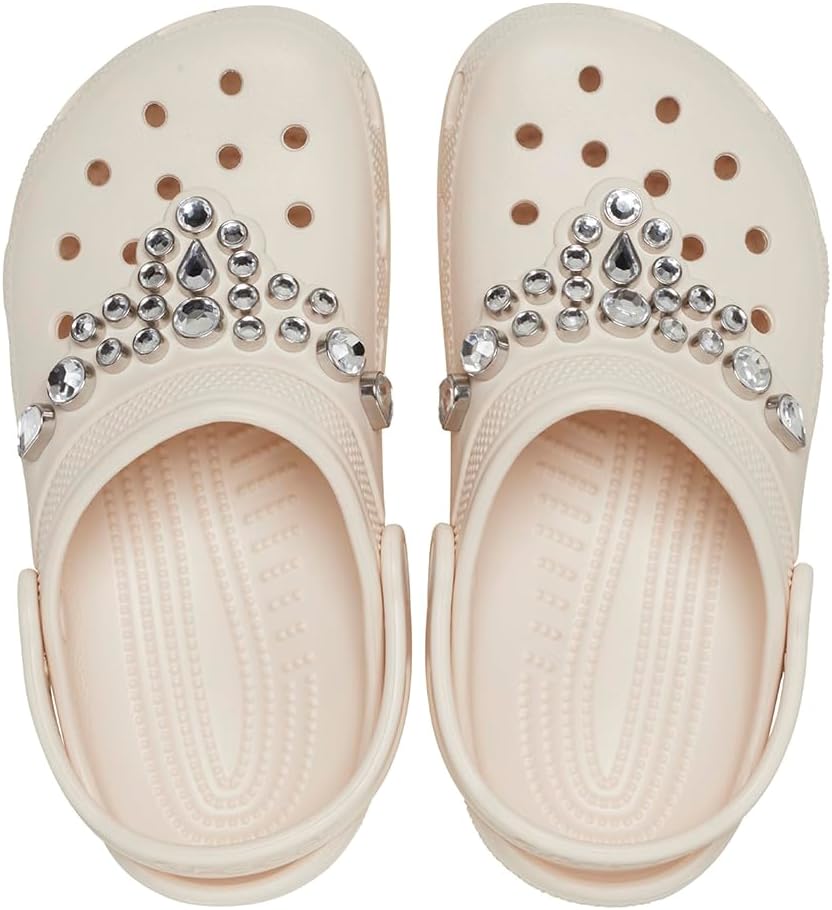 - Clear gemstone fixed patch resembling a tiara Incredibly light and fun to wear Ventilation ports add breathability and help shed water and debris Easy to clean and quick to dry Pivoting heel straps for a more secure fit Customizable with Jibbitz charms Iconic Crocs Comfort: Lightweight. Flexible. 360-degree comfort.