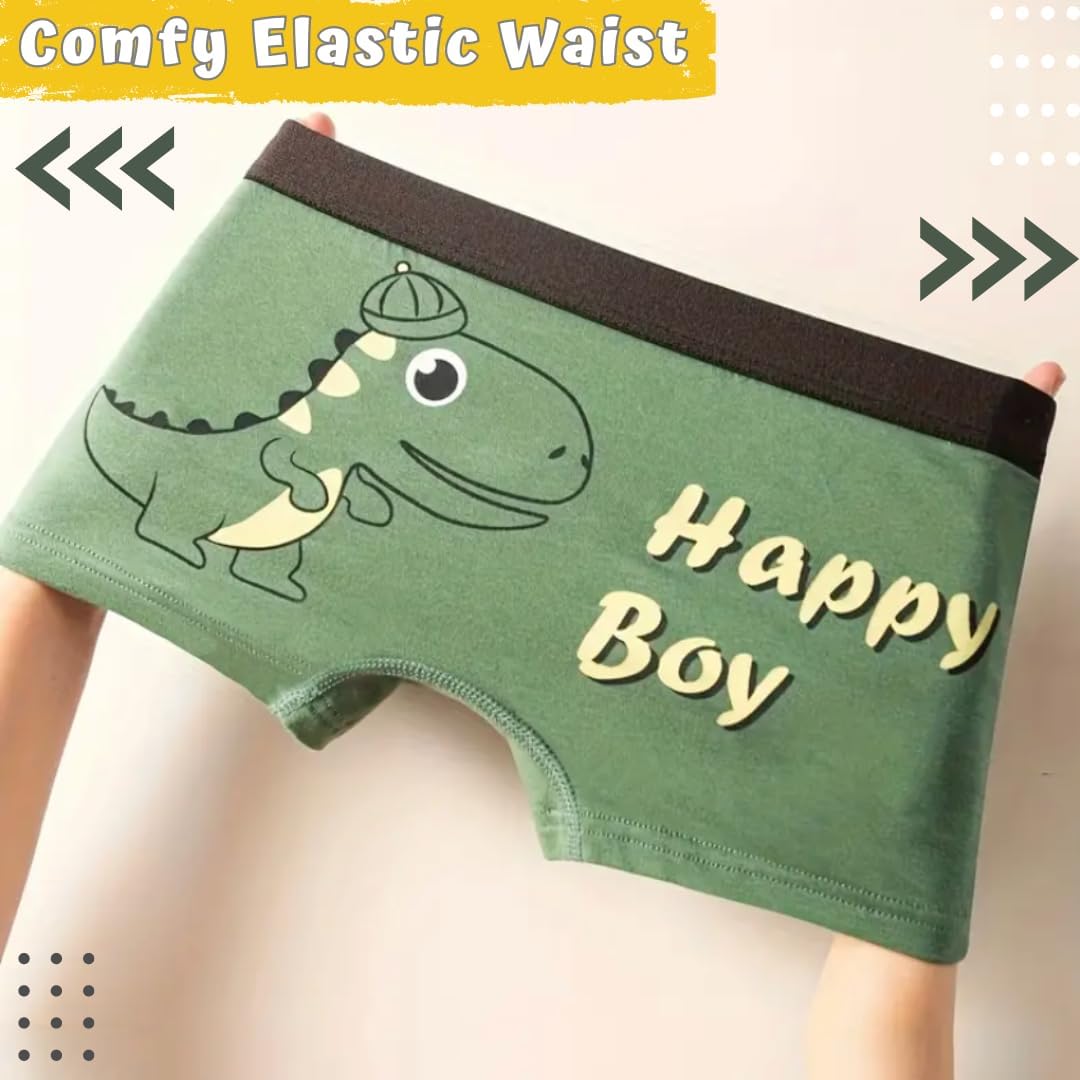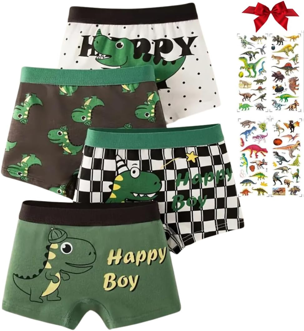JollyGem Boys' 4-Pack Pure Cotton Boxer Briefs with Dinosaur Designs and Bonus Stickers! 95% Cotton, 5% Spandex Boys Shorts Underwear Best Gift for Boys