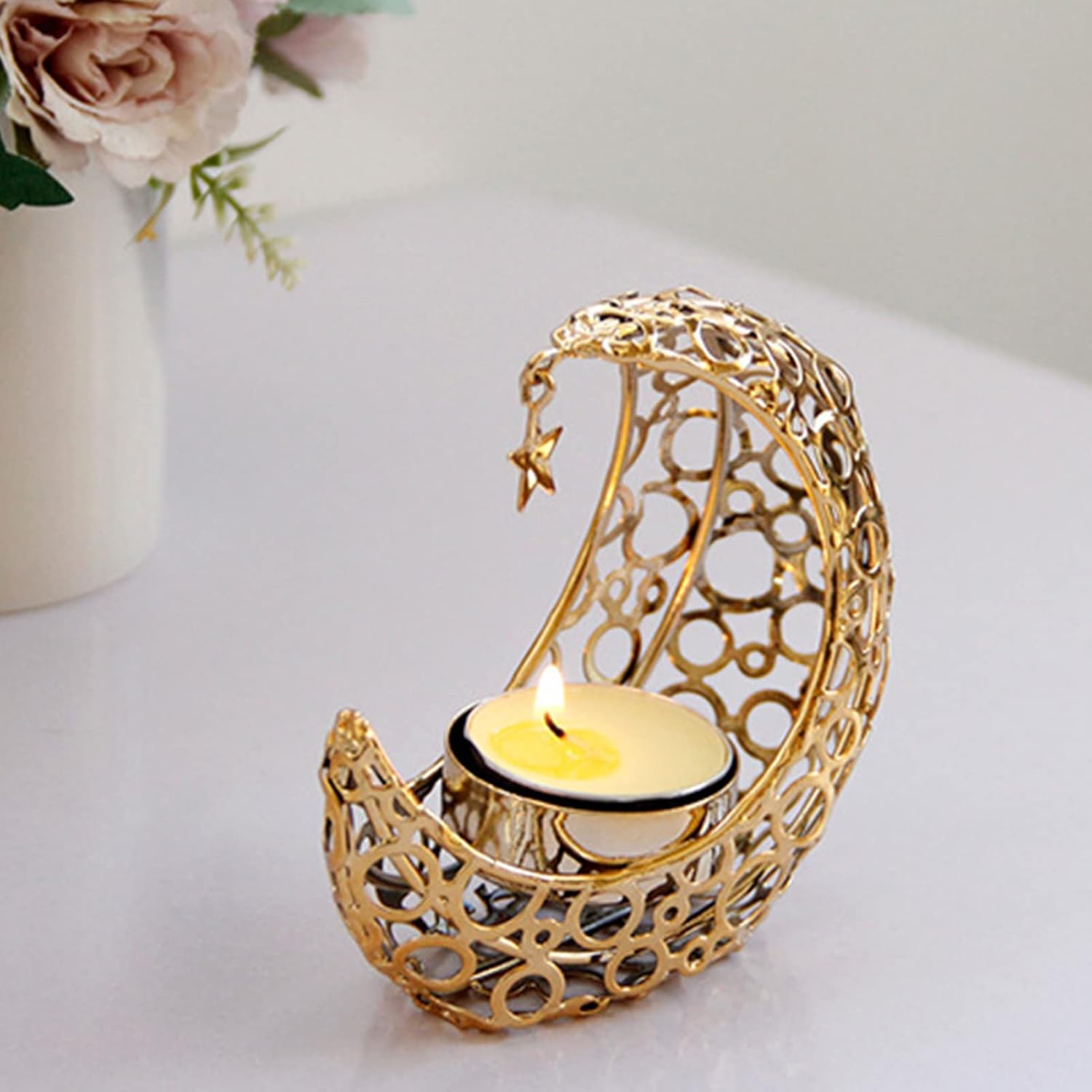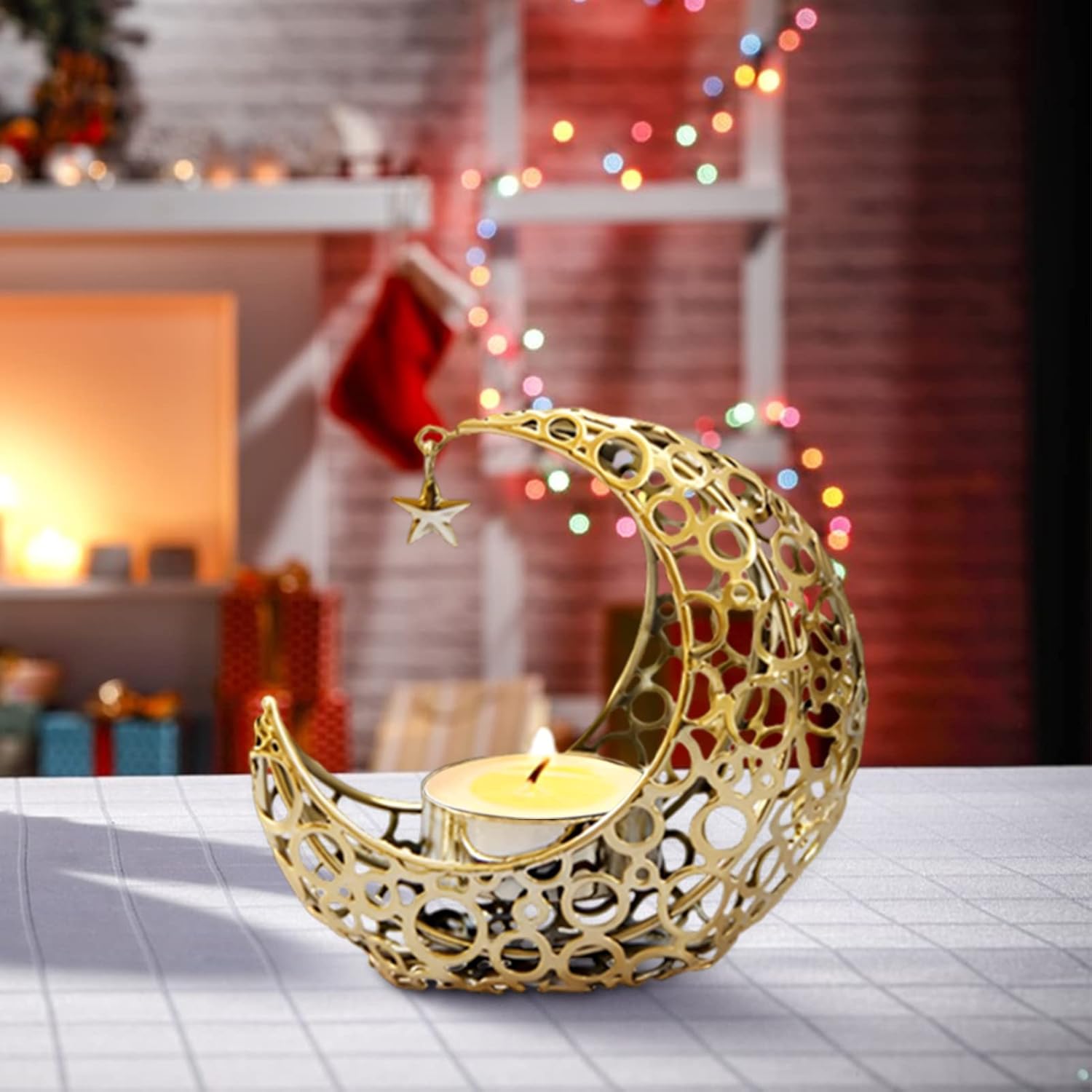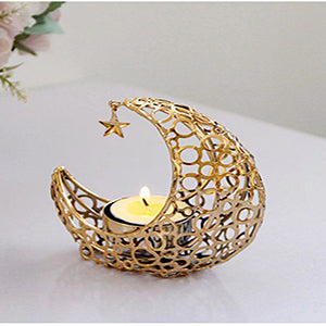 Gold Metal Moon-shaped Candle Holder, with A Hanging Star Holder, by Sweet seven, Suitable for Tea Lights and Votive Candles, Ideal for Wedding, Party Table Centerpiece Decorations