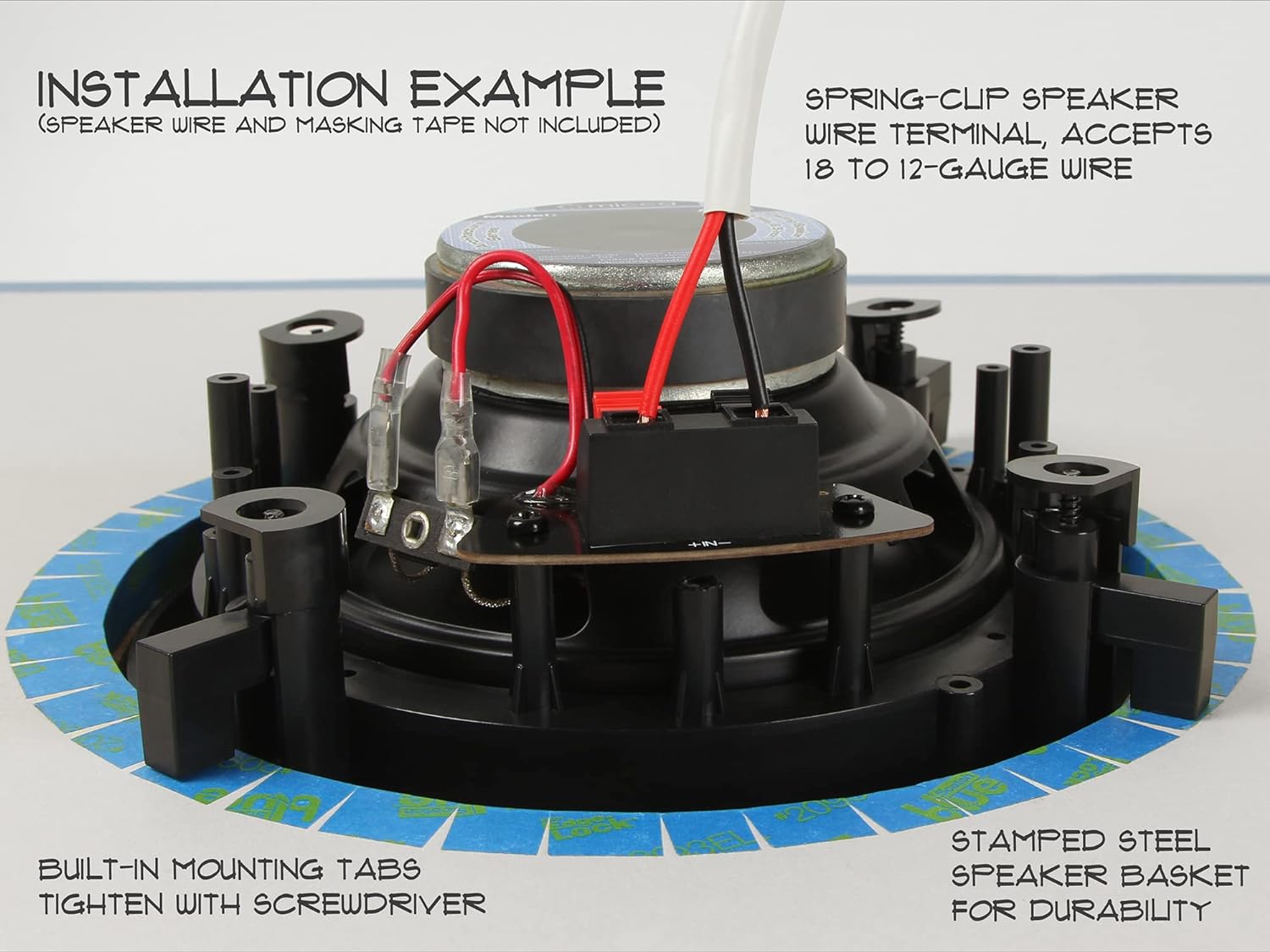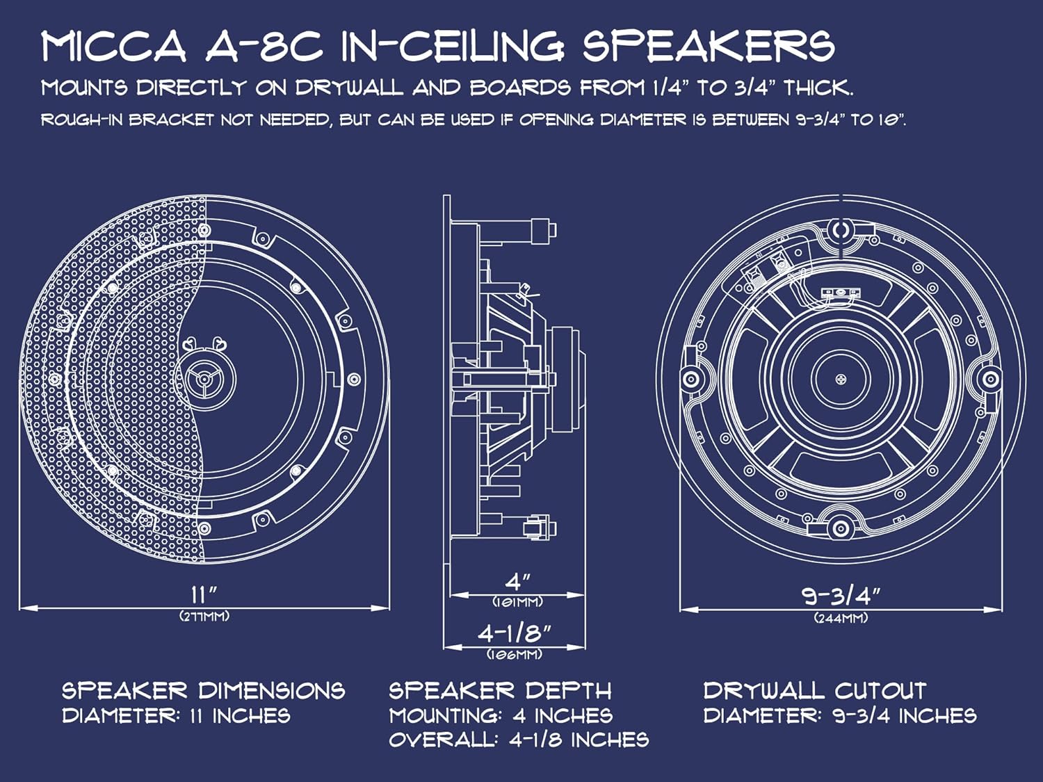 EASY TO INSTALL - Micca in-ceiling speakers have built-in mounting tabs that grab securely onto drywall or wood panels with no need for additional brackets or backing boxes. The instruction sheet provides detailed installation steps, as well as recommendations on mounting location and speaker wire selection.