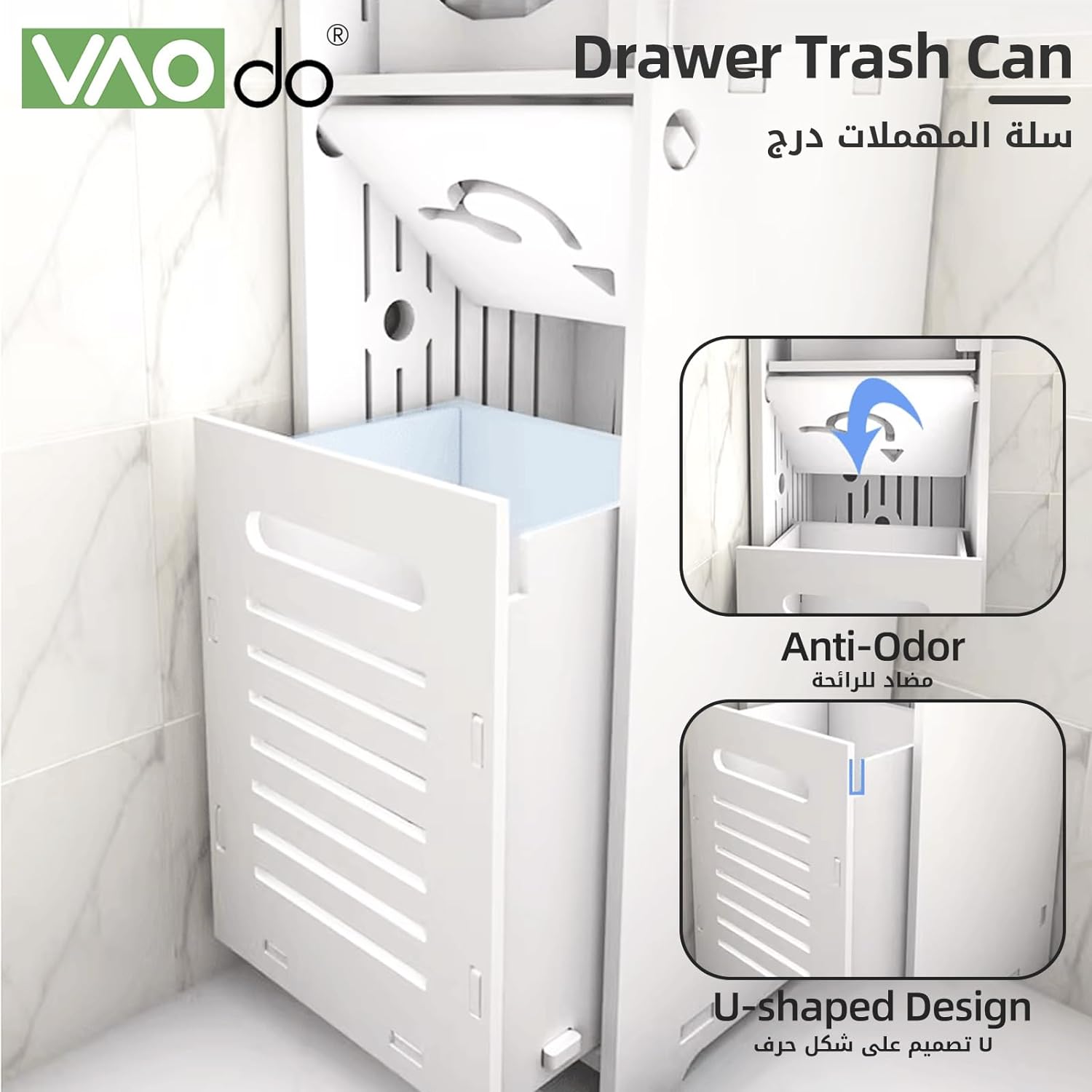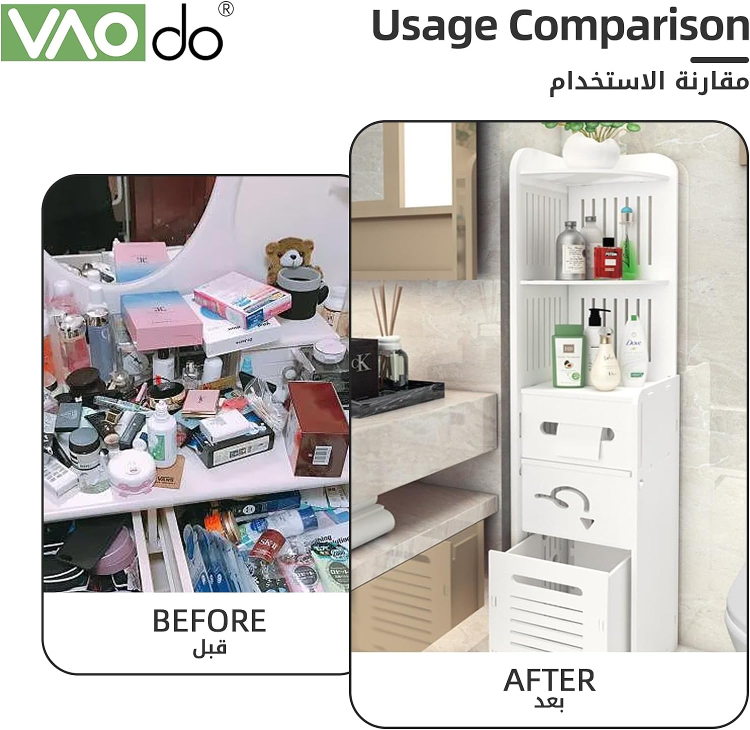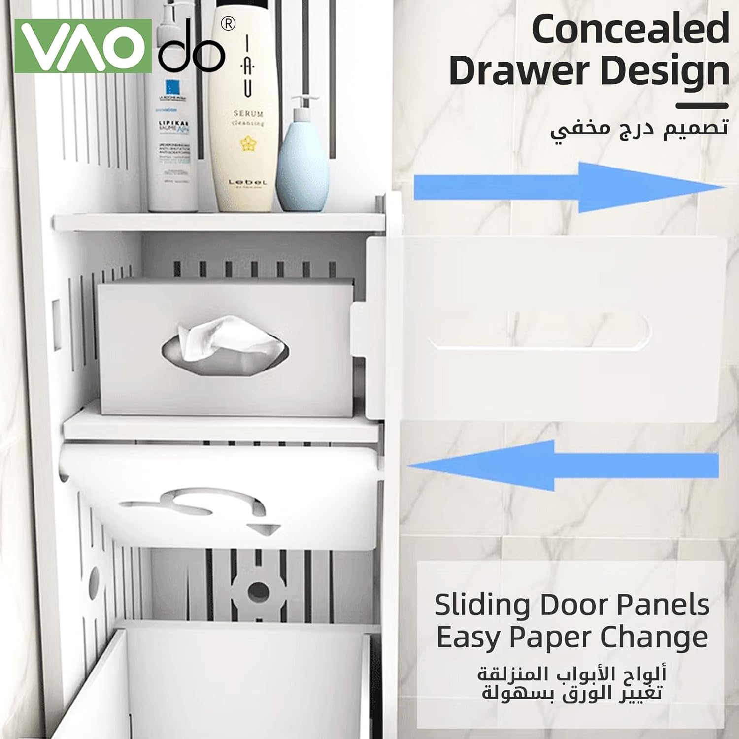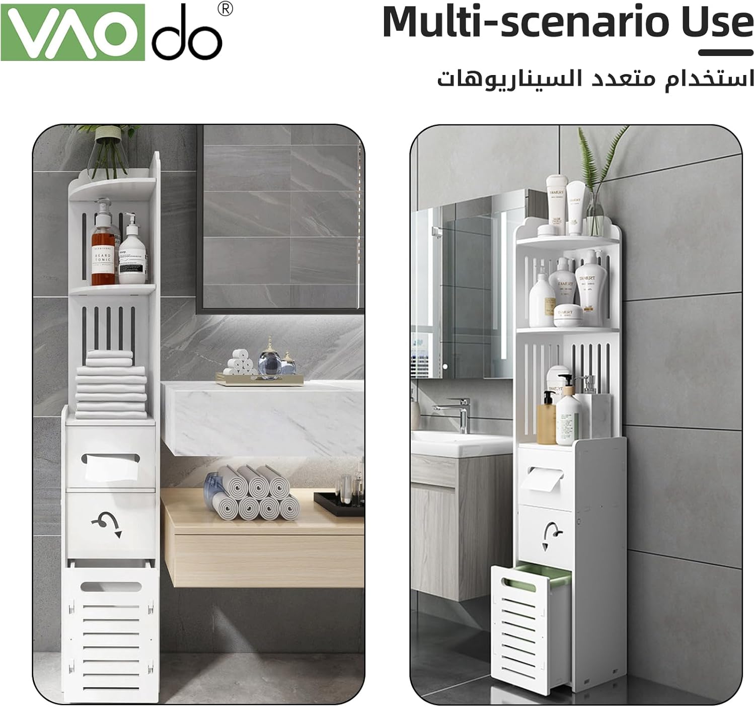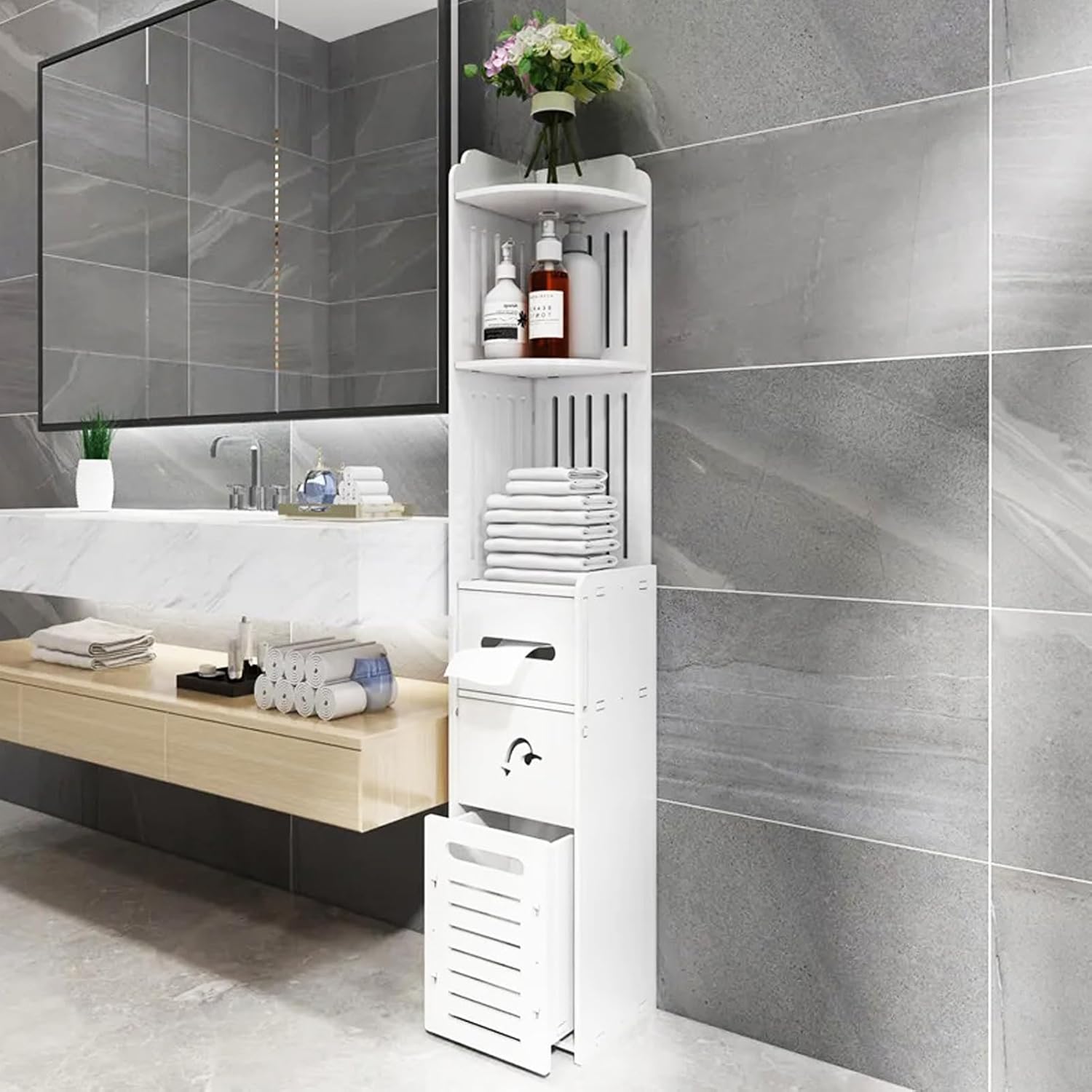 【Large Capacity】VAODO bathroom corner shelf has a total of 5 floors, with a push-pull drawer box and a small storage cabinet, you can store items according to your preferences, no matter how many items you have, you can also store them.