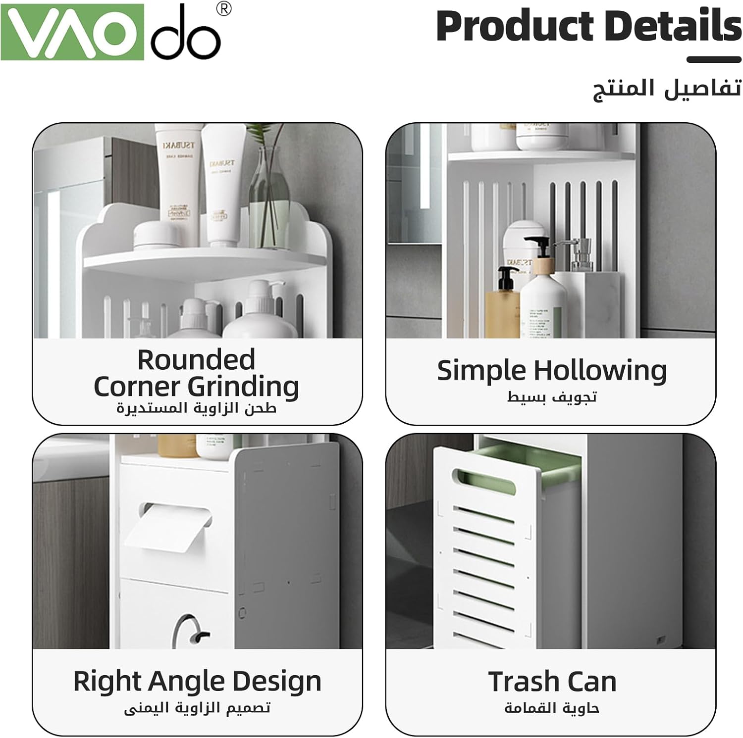 VAODO Bathroom Multi-Level Corner Cabinet, Standing Freestanding Bathroom Storage Cupboard,Bathroom Toilet Paper Holder, Organize Shelf, with Trash Can, Small(90cm Tall, Trash Can)