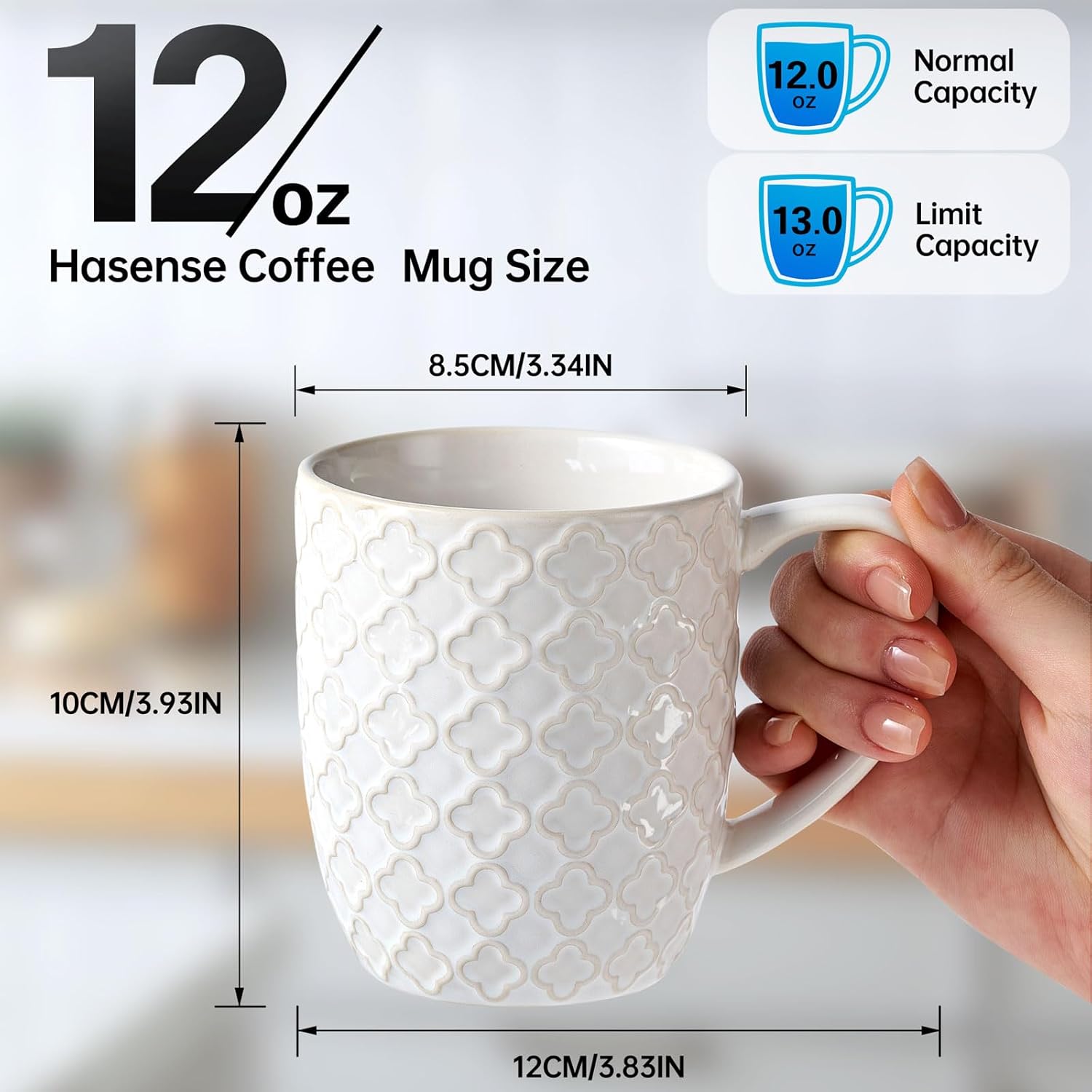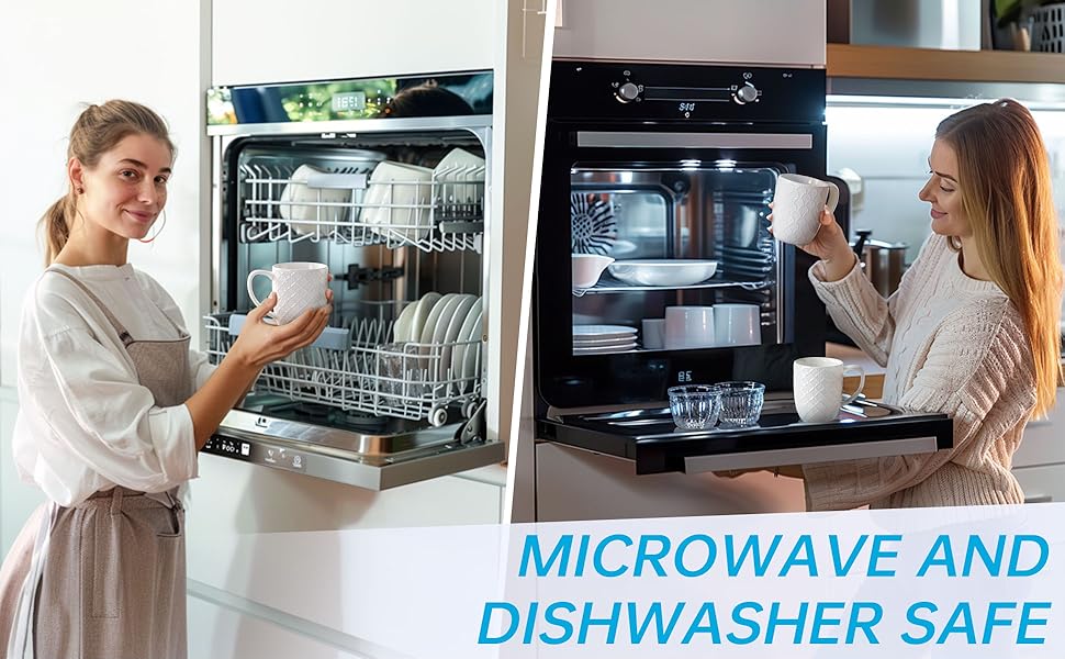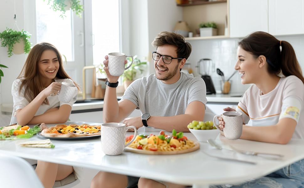 DAILY DELIGHT IN EVERY SIP: The coffee mug shape with the unique embossing is an innovation of our coffee cups.Our elegant mugs, with a smart 350ml size(top to the rim), offer the perfect weight and sturdiness for your daily caffeine fix. Crafted with commercial-grade quality, this set ensures your morning brew tastes even better. Whether it's iced coffee, latte, or tea, enjoy every sip with our chic design, adding sophistication to your kitchen.
