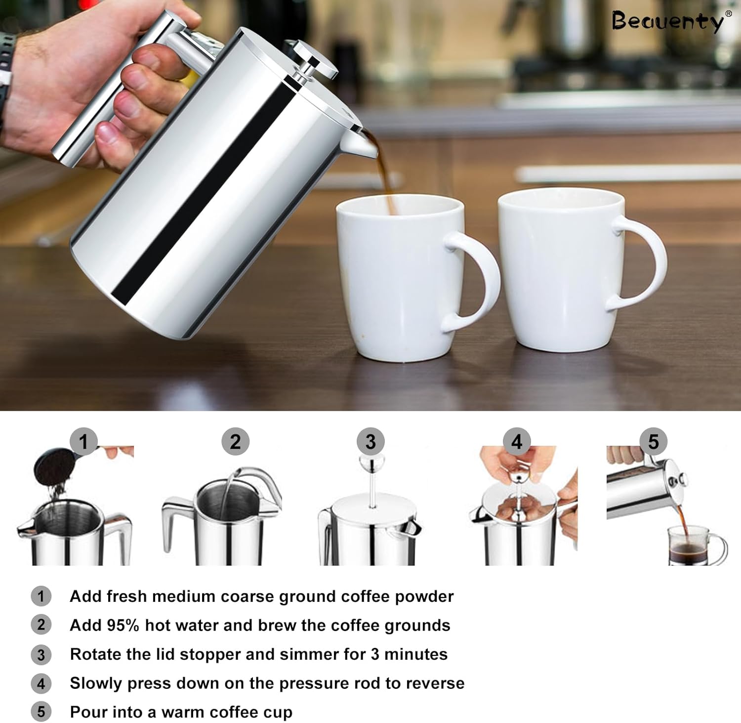 【Enjoy Delicious Coffee or Tea】Making a cup of coffee takes just 5 steps whether you are an expert or a beginner. Easy to operate. Three minute quick brew, enjoy your own hand-made coffee. Tea, milk teas or cold brew coffee are also great with our coffee pot!