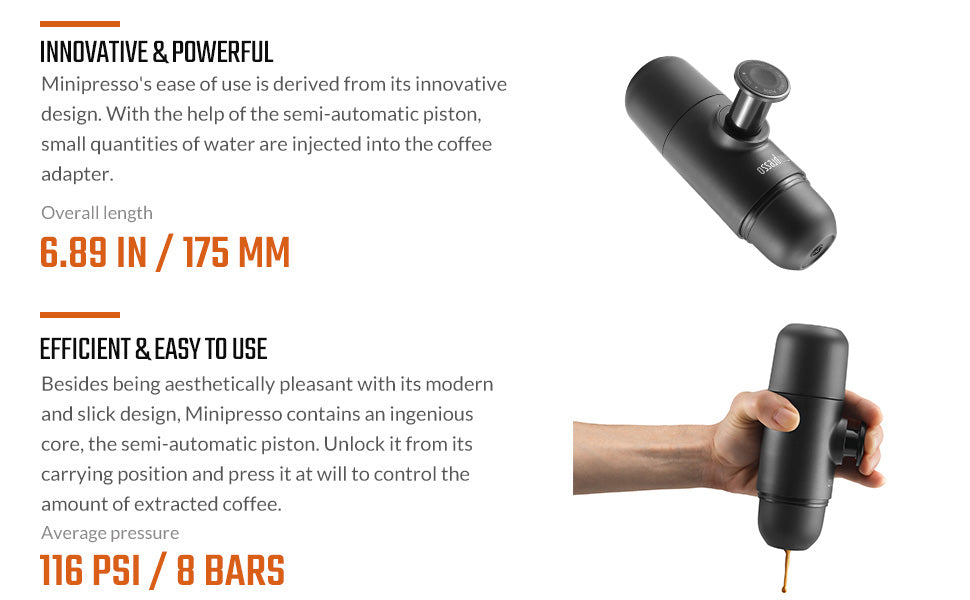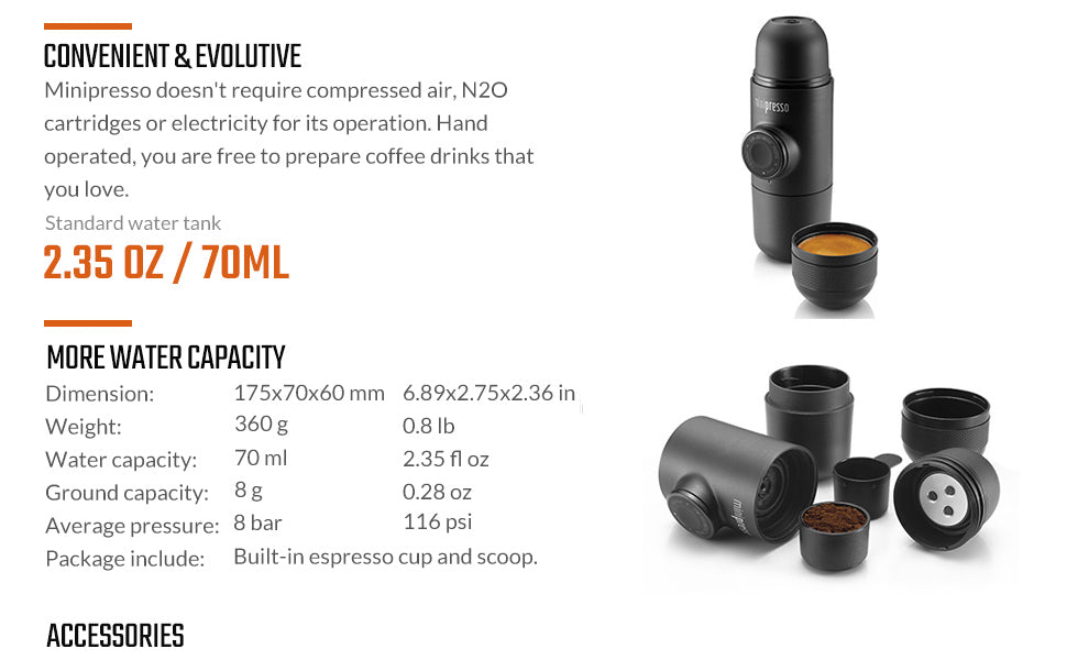Note: Accessories are sold separately! Enhance your Minipresso to get the most from it. Enjoy longer espresso, up to 100ml, and protect it from scratches. You can purchase accessories separately from our store.
