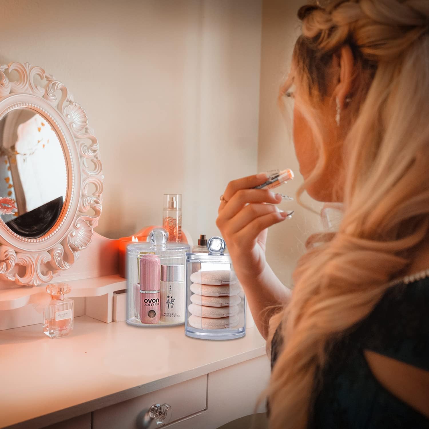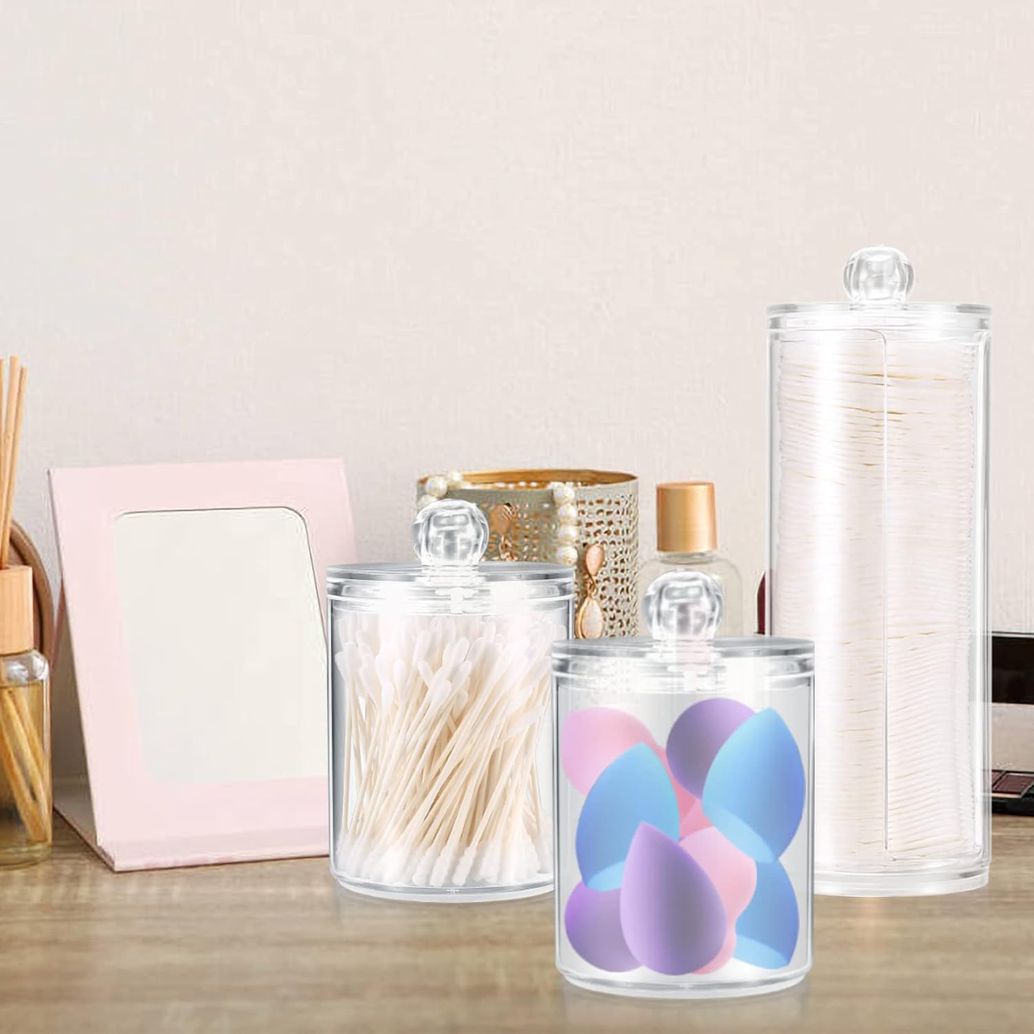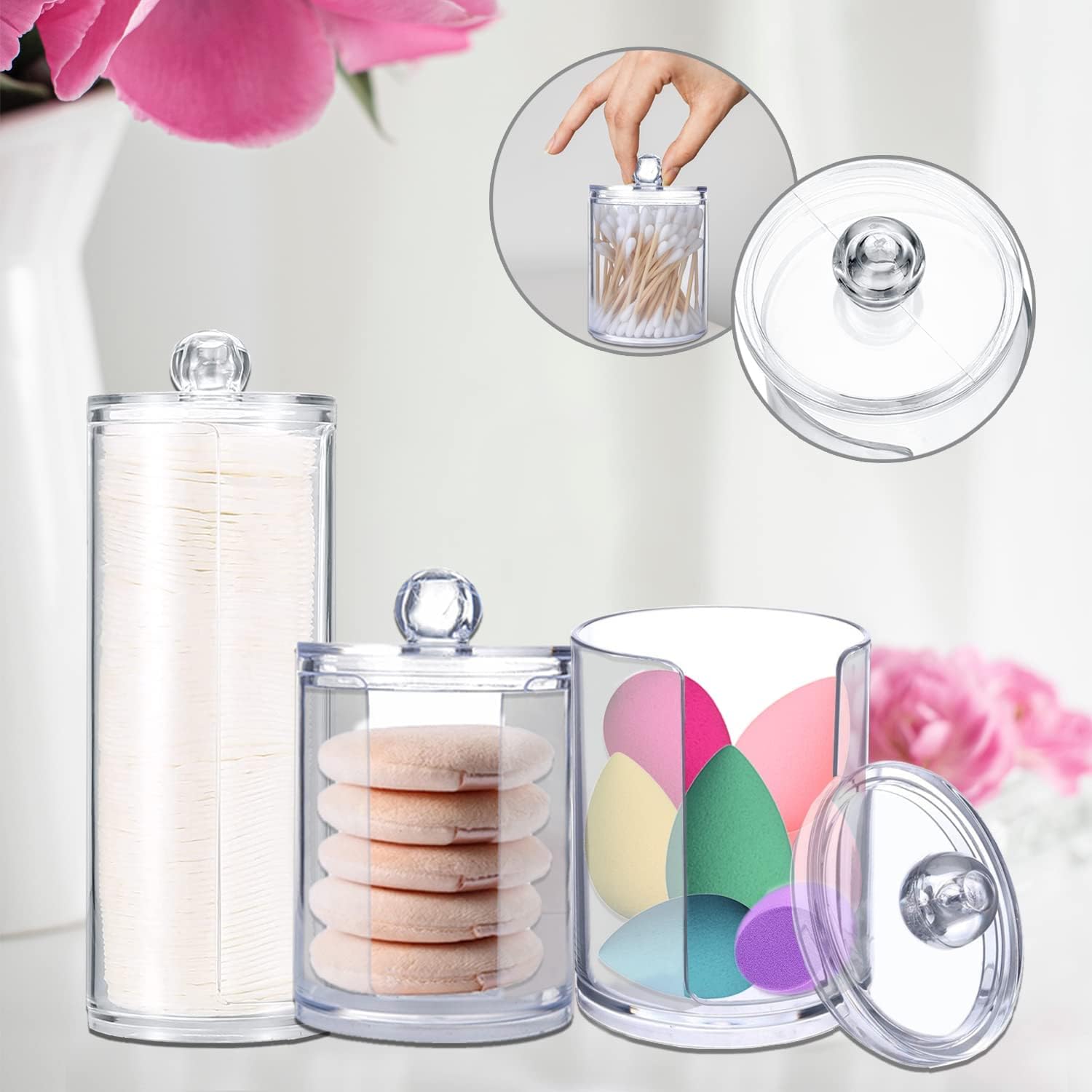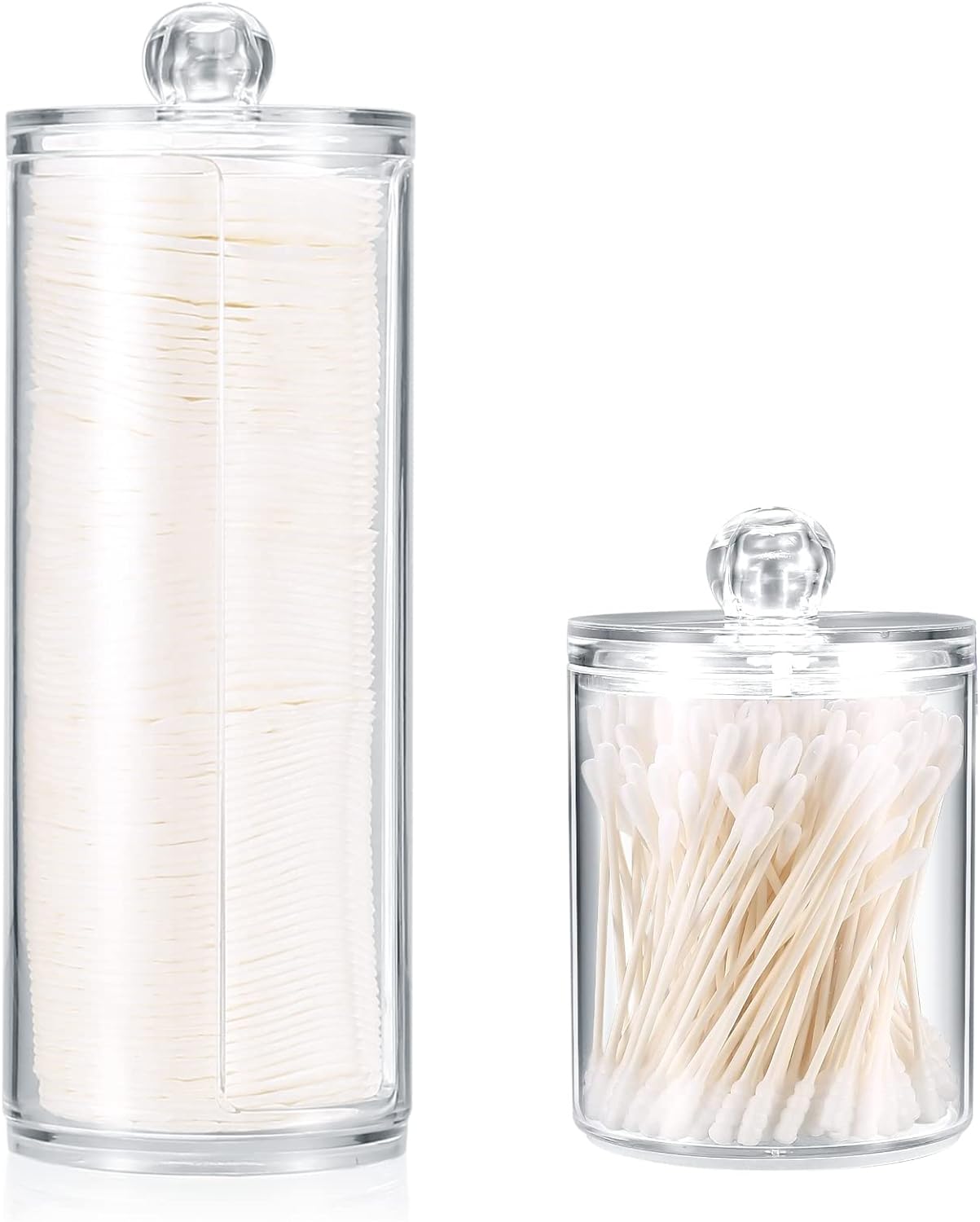 🎀【Easy to clean and use】The transparent acrylic cotton pads canister combines beauty with order. There is enough space to store cotton swabs, and easy to wipe clean with soap and water. Very suitable for use in dressing tables and bathrooms. The unique design keeps it clean and easy to remove and store items.