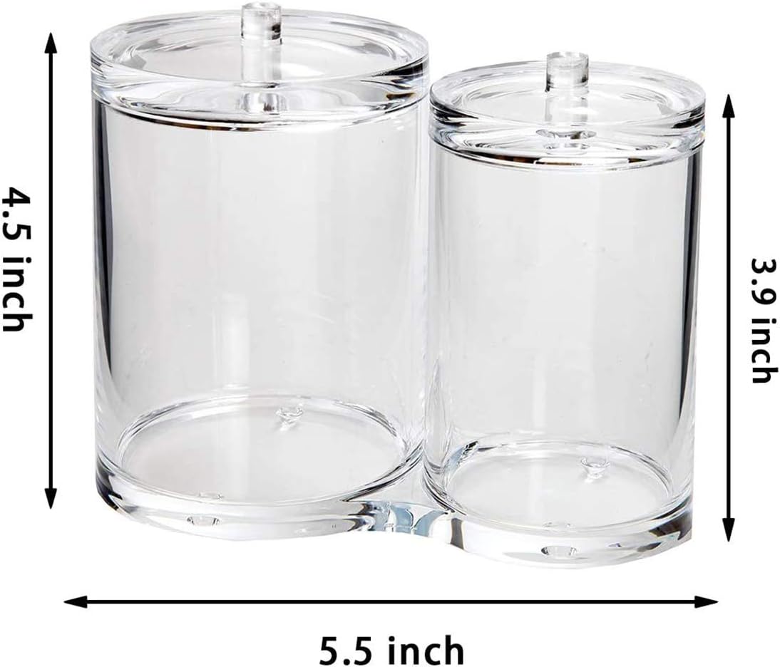 Acrylic Cotton Swab Holder Cotton ball holder Storage with Lids Material: Acrylic Item dimension:larger compartment measures 4.5*3.3*3.3inch,Internal high 3.4inch,Smaller compartment measures 4.1*2.6*2.6 inch,Internal high 3.8 inch Package dimension:5.3*3.5*2.7 inch Package included: 1x Acrylic cotton swab dispenser. Feature: Made of high quality material,the cotton swab holder is stronger,healther,environmental-friendly and odorless. Easy to clean:It is easy to clean with soapy water. Save space:one item with two compartments. Help to keep your makeup tools tidy and neat. Dust-proof Design:The lid can keep dust away and the knob is easy to pick-up. Note Because it is made by the assembly line, the product will have slight scratches,this is a normal phenomenon.