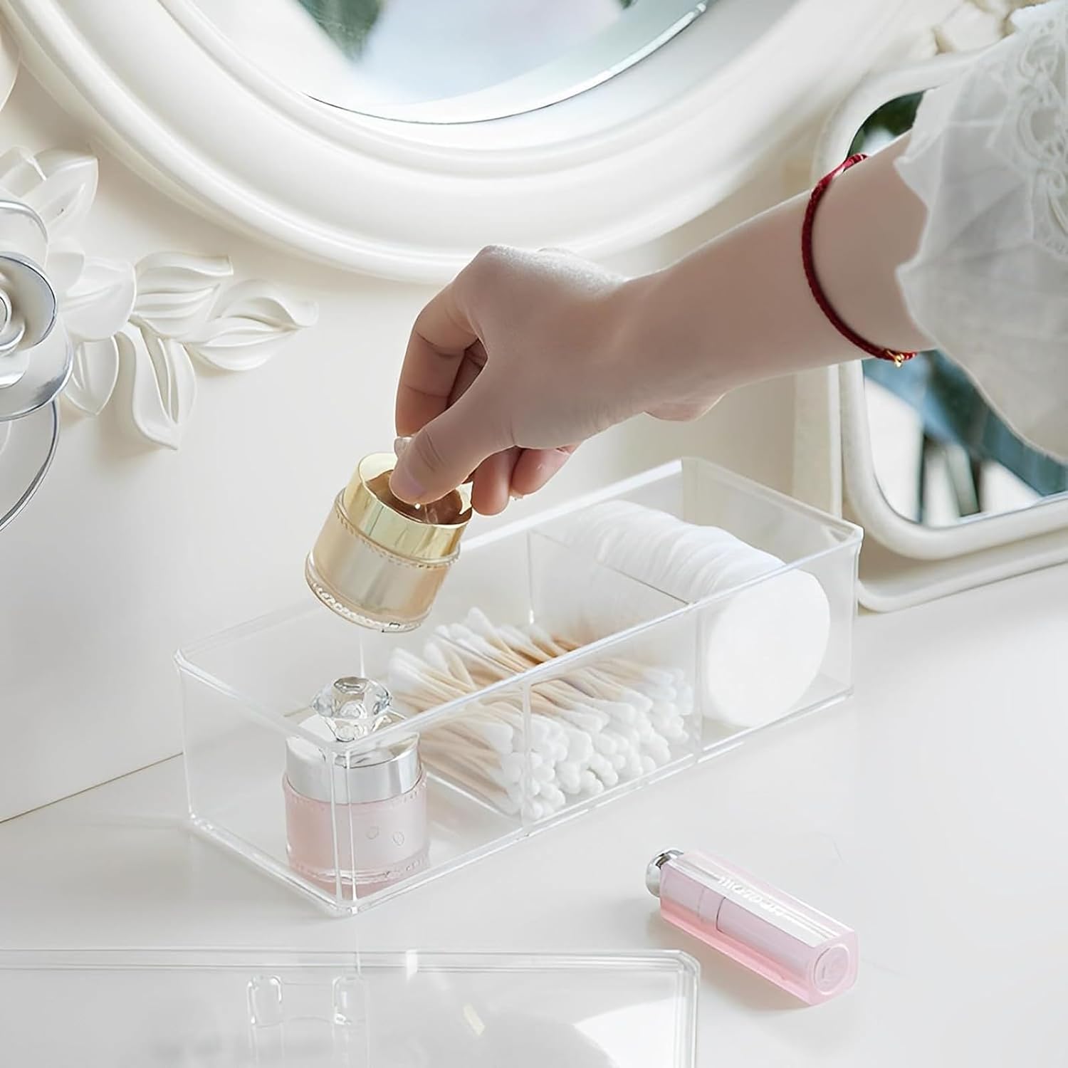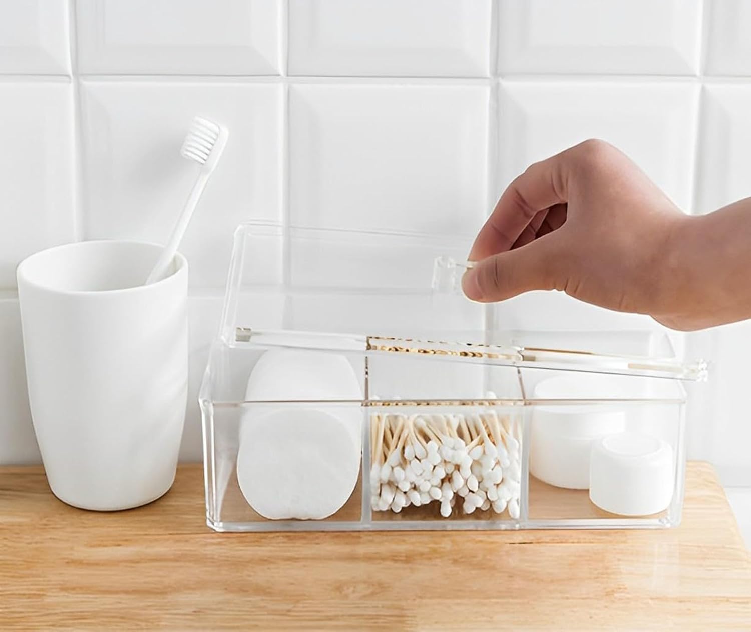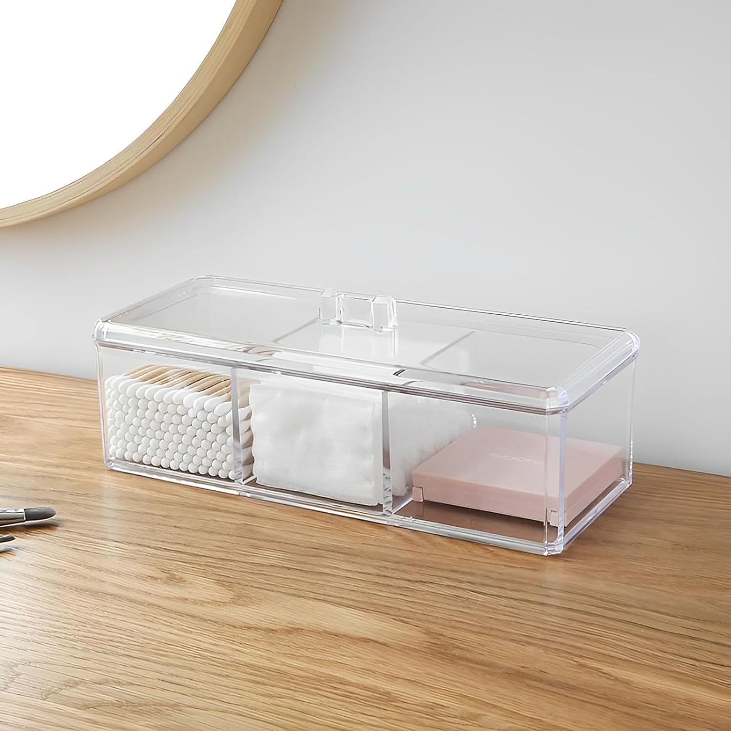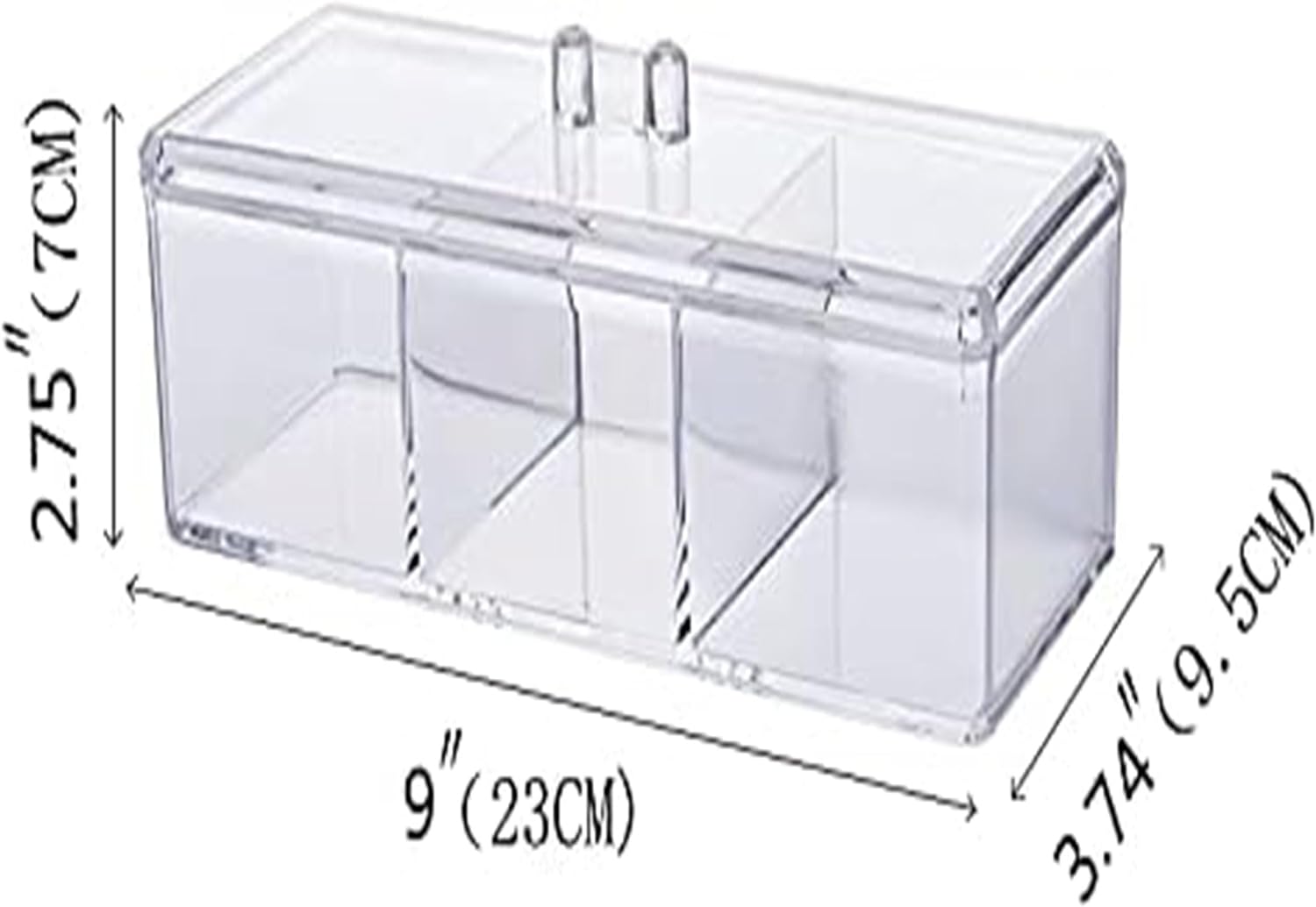 Tazweeq Qtip Holder, Rectangle Cotton Ball, and Swab Holder, Organizer with Lid, Dustproof,Waterproof,Clear Acrylic 3 Compartment, Cotton Pad Container for Cotton Swabs, Make Up Pads, Cosmetics