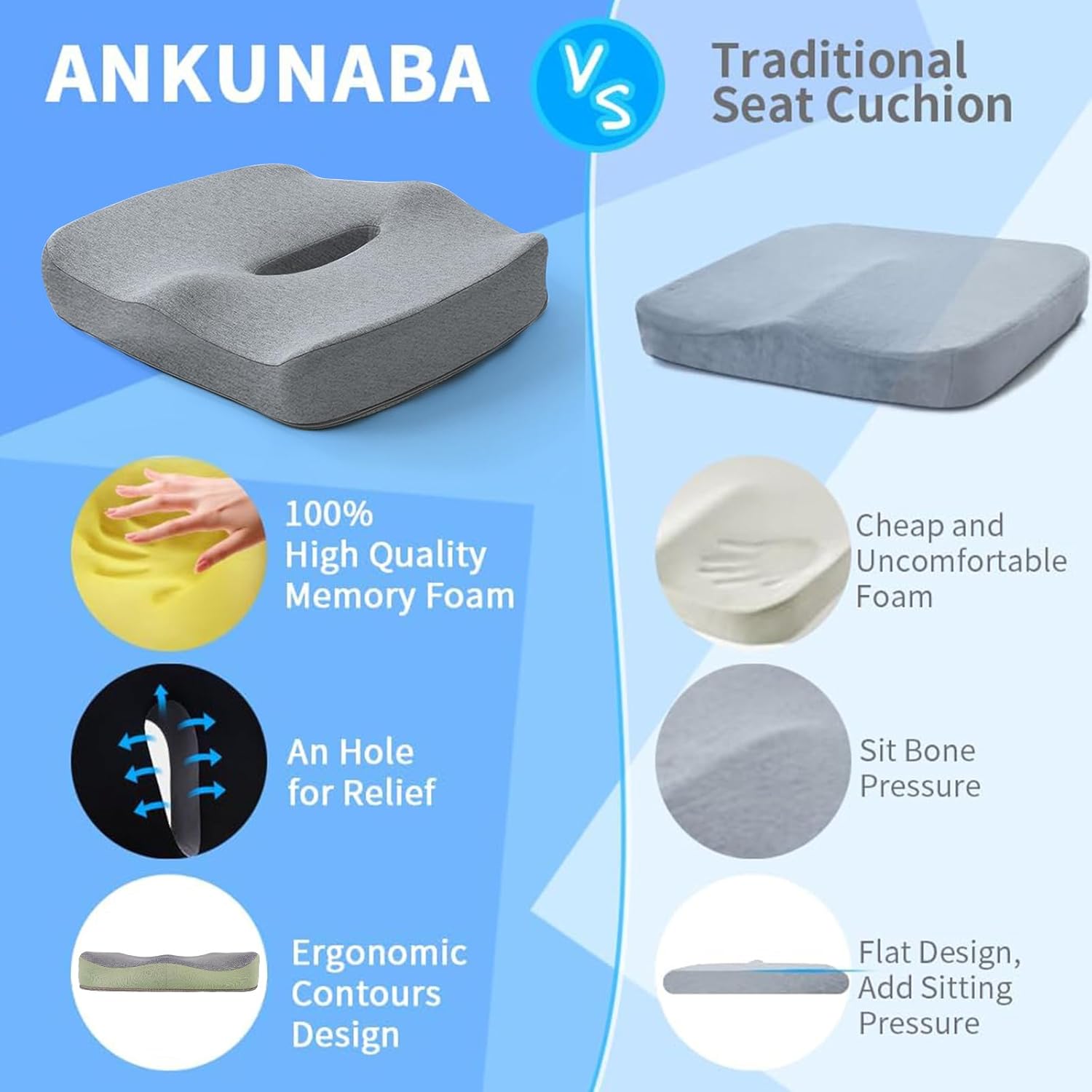 【Ergonomic Design】:Unlike other normal seat cushions, our seat cushion for desk chair has a donut hollow in center to increase the height of edge, which can support and give relief of your coccyx, tailbone, legs and butt. It is engaged in helping relieve lower back and sciatica discomfort after long time sitting. Help alleviate pain and provide the best comfort and support.