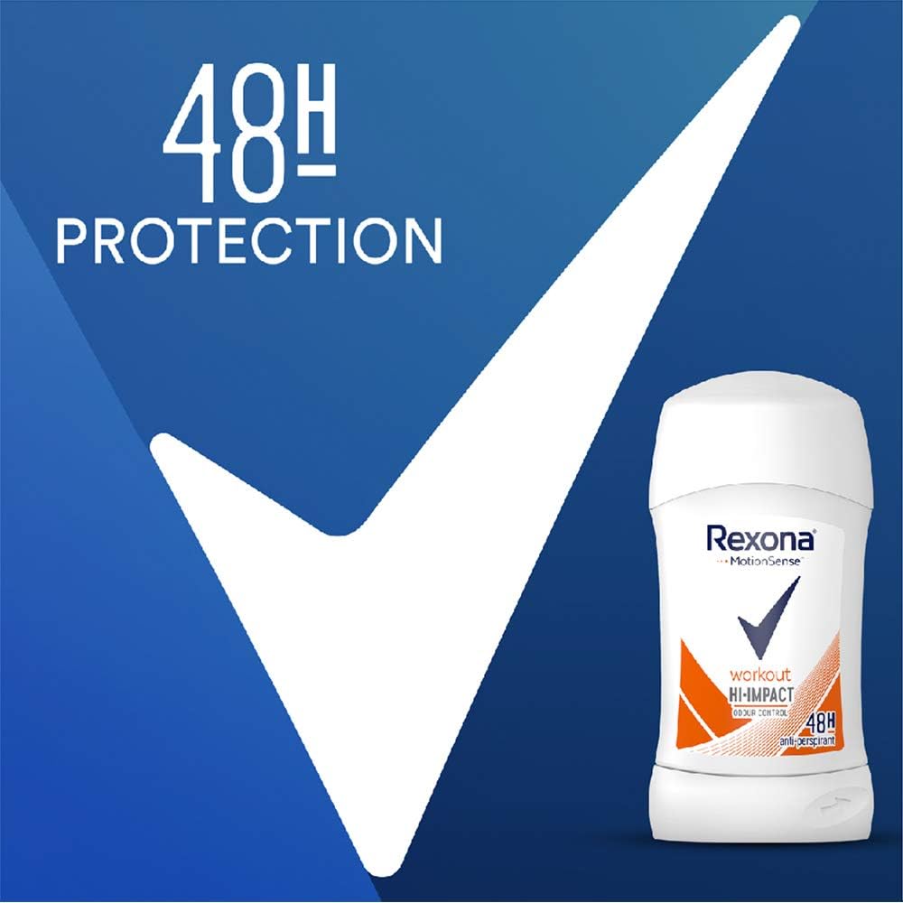 48-HOUR NONSTOP PROTECTION: Rexona Women HI-Impact Workout Antiperspirant Deodorant Stick with 48-hour unbeatable sweat and odor protection for nonstop confidence.