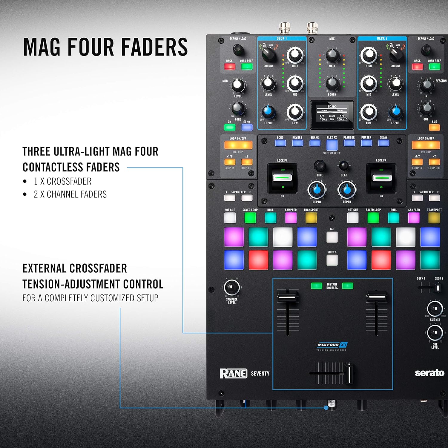 RANE DJ SEVENTY – Two Channel DJ Mixer for Serato DJ with Akai Professional MPC Performance Pads Internal DJ FX and Three Contactless MAG FOUR Faders