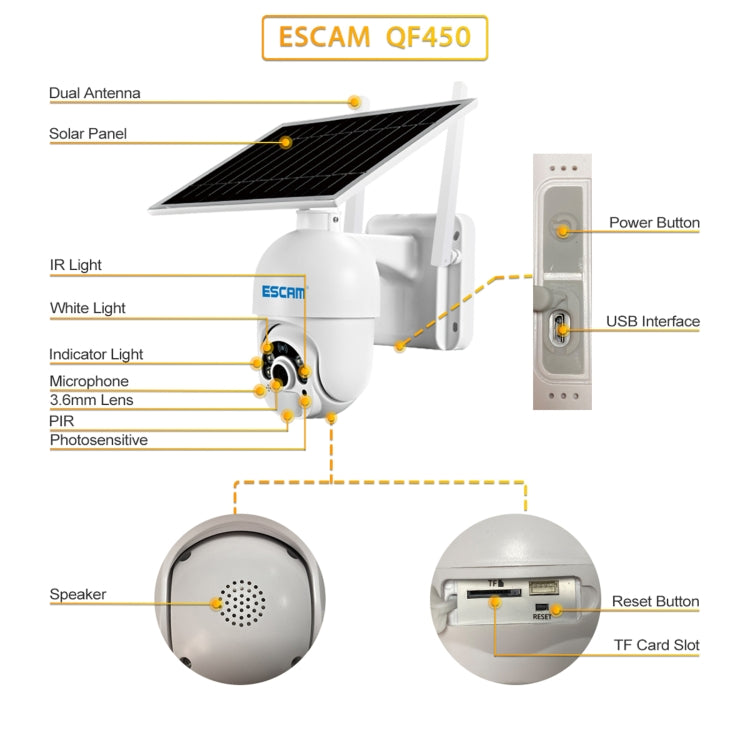 ESCAM QF450 HD 1080P 4G US Version Solar Powered IP Camera with 128G Memory, Support Two-way Audio & PIR Motion Detection & Night Vision & TF Card