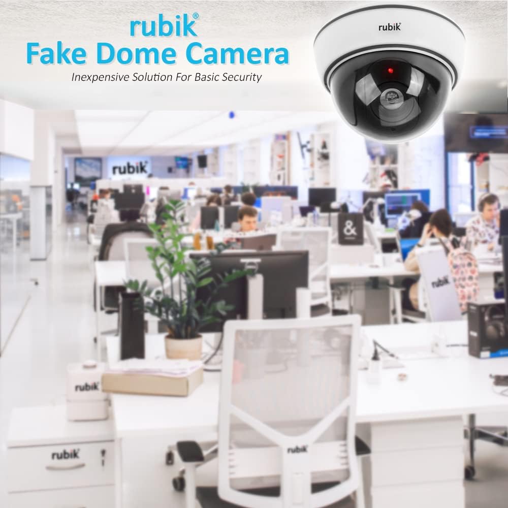 Rubik 2pc Dummy CCTV Camera with Flashing LED Light and CCTV Sticker Sign, Fake Surveillance Camera Security Indoor Dome Camera with LED Light (White)