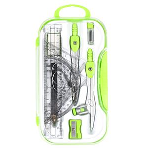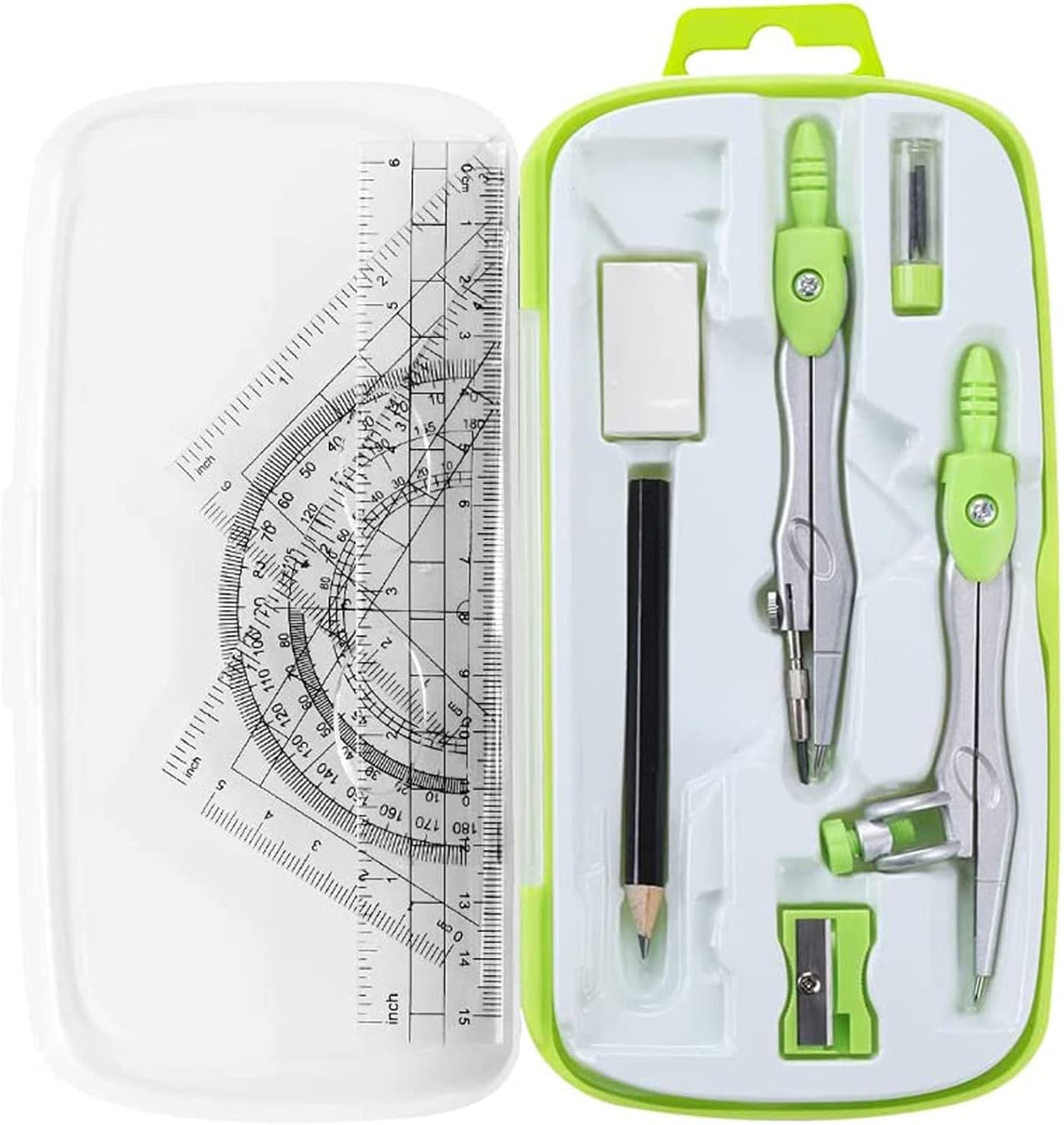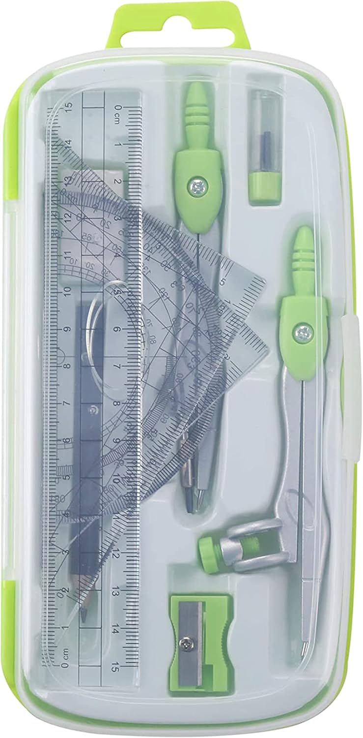 Math Geometry Kit Sets 10 Piece Student Supplies with Shatterproof Storage Box, Includes Rulers, Protractor, Compass, Eraser, Pencil Sharpener, Lead Refills, Pencil, for Drafting and Drawings(Green)