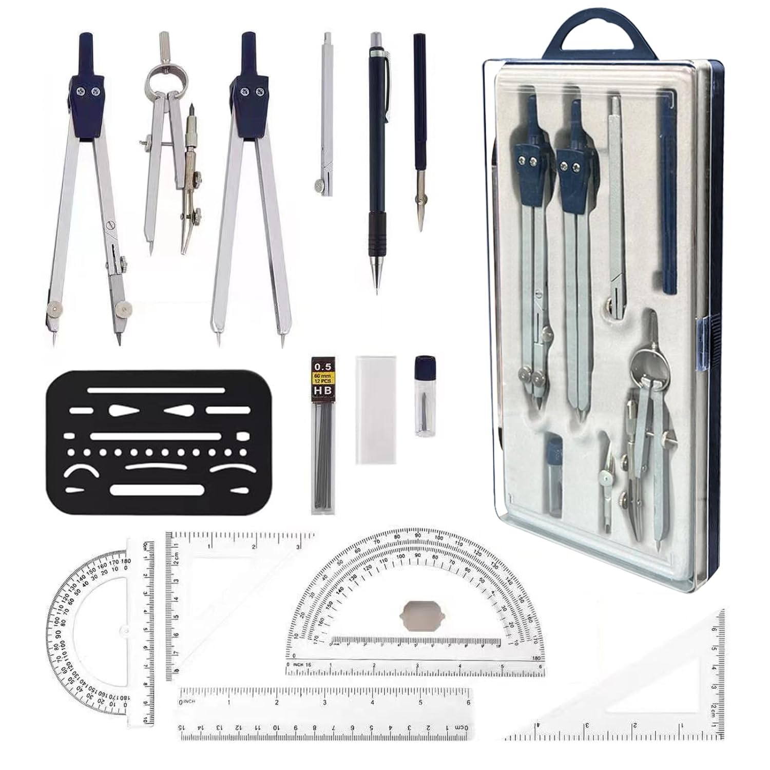 COMPASS GEOMETRY SET contains16Ps for 3 professional compass(divider. bow - compass with extension arm. Spring compass with adjustable duckbill Tracing head.The bow-compass and plot pen can be used this duckbill tracing head.)The extra lead for compasses.mechanical pencil,mini case of 0.5mm HB lead for mechanical pencil,protractor 6”,Protractor 4.5”,erasing shield. clear ruler,45 x 45 degree and 30 x 90 degree set square with a fine case.