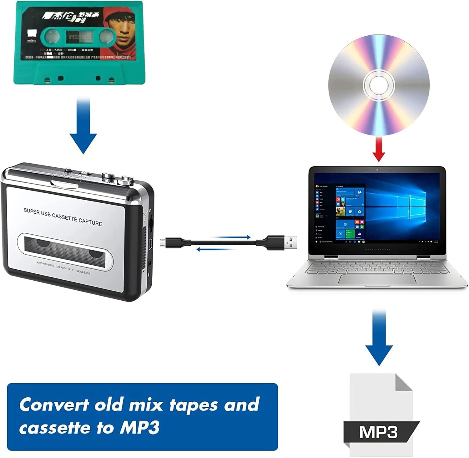 【CONVERTS TAPE TO MP3】 -- Our unique tape recorder quickly converts old cassettes to MP3 format via a USB cable. Also works with laptop CD burners.