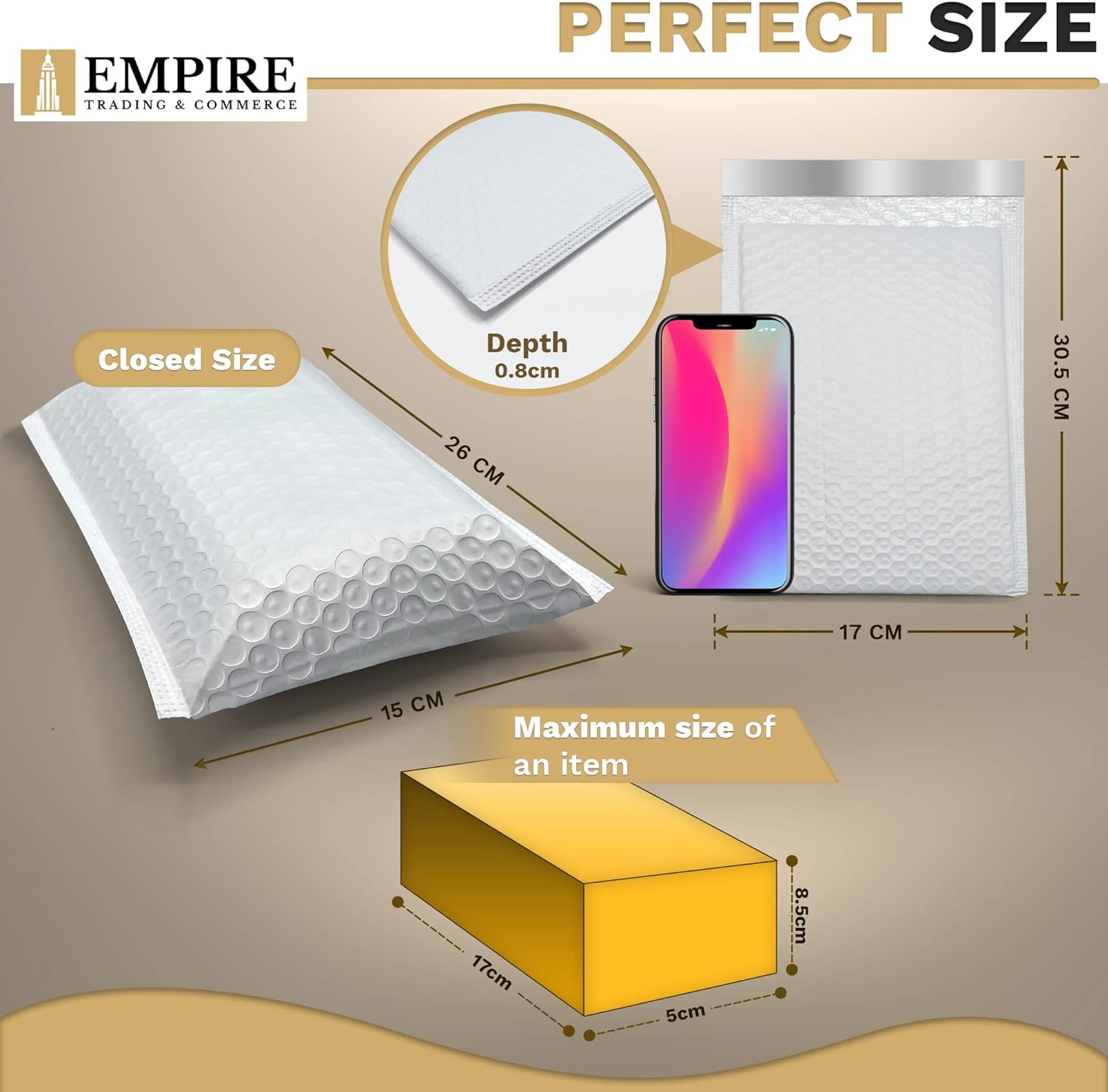 Empire Poly Mailers 50 Pack, Postage Bags, 5/10/25/50 PCS Bubble Mailers Shipping Bags, Waterproof Padded Envelopes with Self Seal Strip, Mailing Bags, Poly Bubble Mailers 17cmx25cm+4cm, White–220GSM