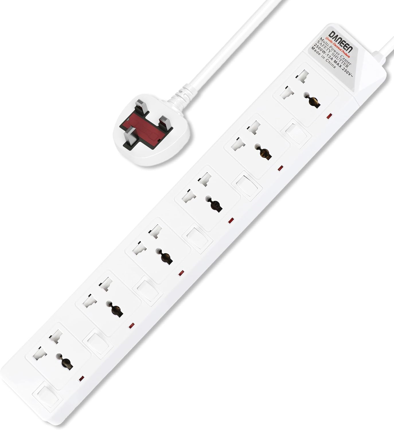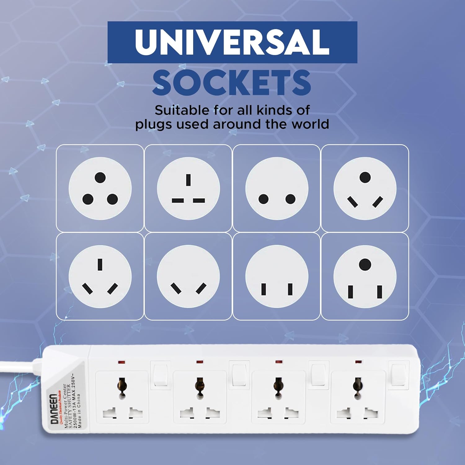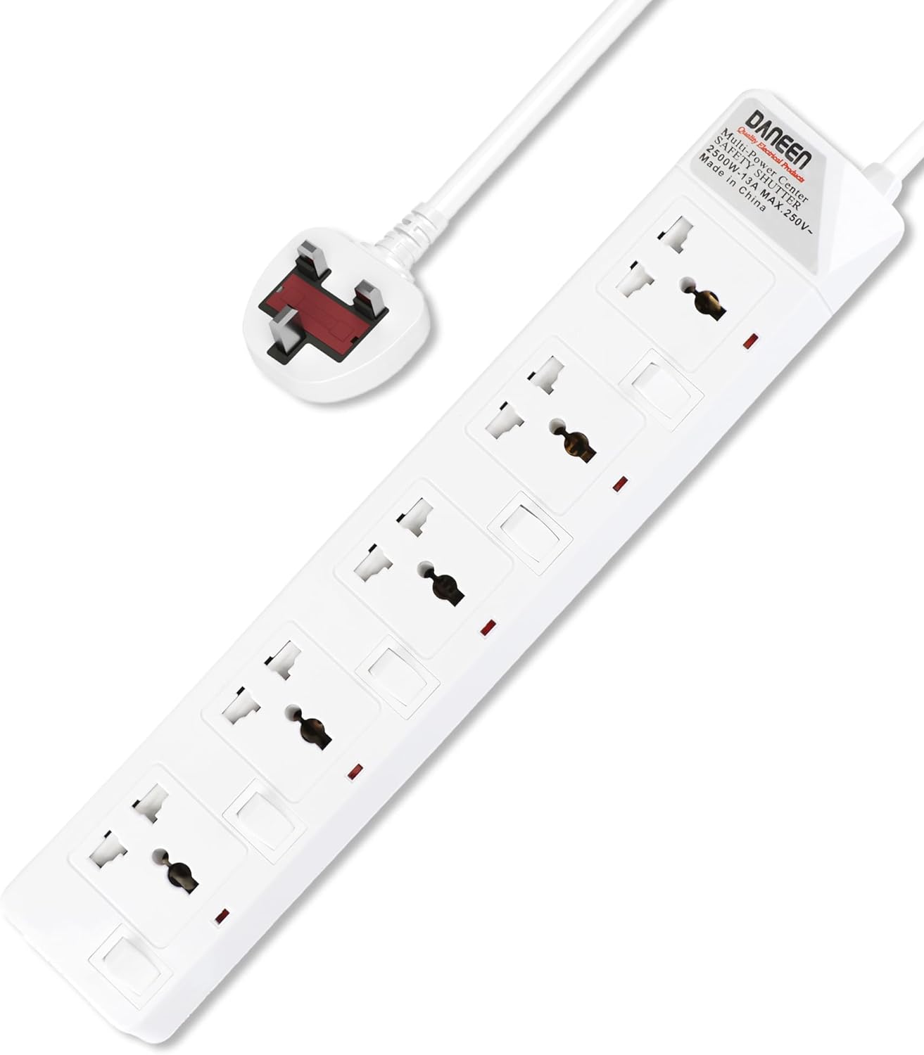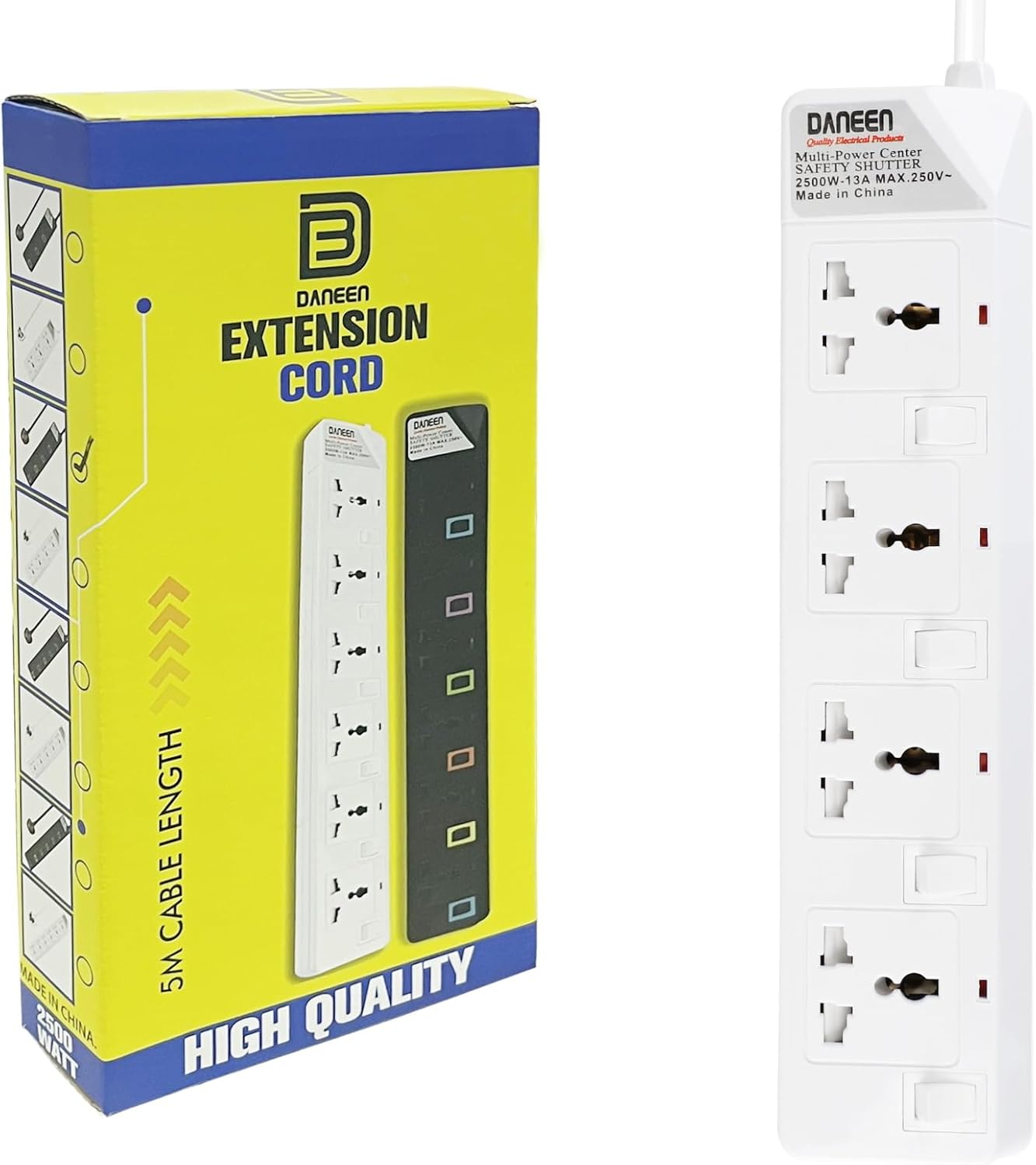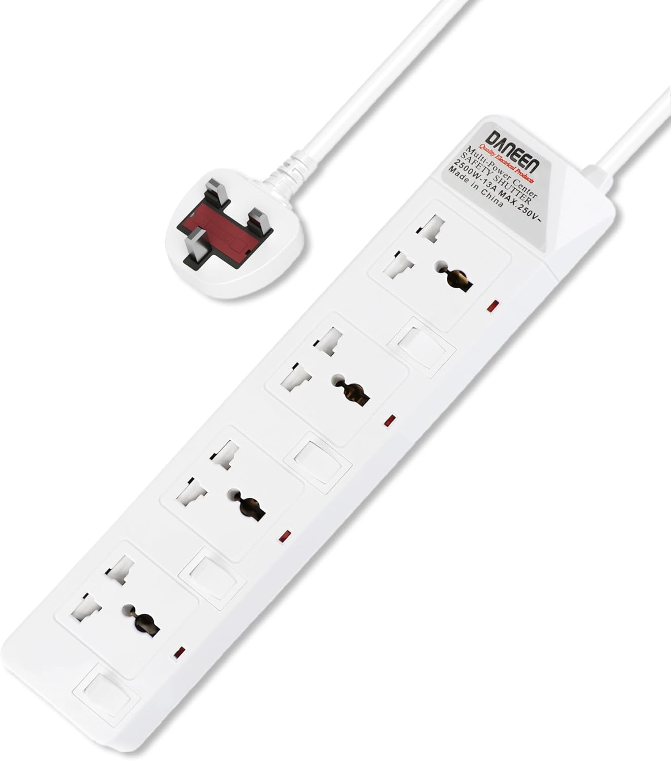 DANEEN Universal Power Extension cord Socket | 5M 3 Core Cable, Individual Switches, 10A Fused UK 3 PIN Plug,2500W capacity| White Surge Earthing capable Outlet Strip (4 Way 5 Meters)