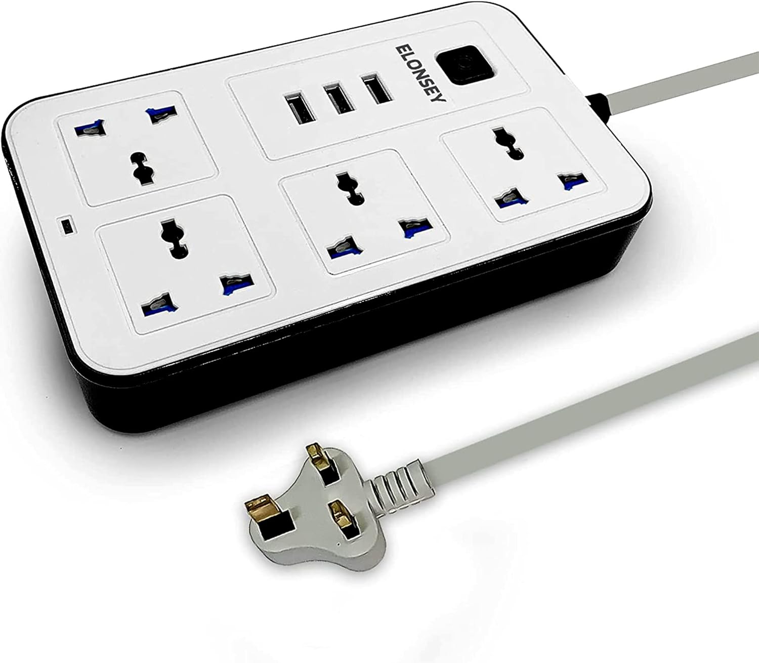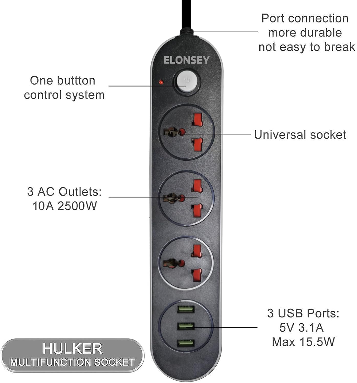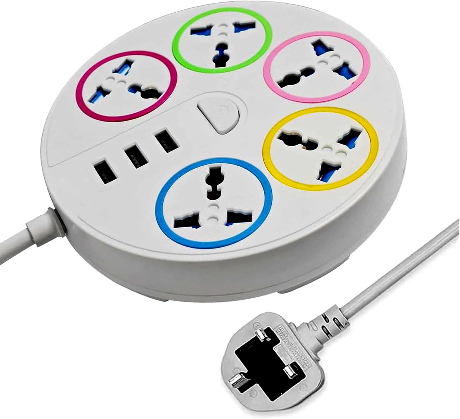 6 in 1 Power Socket Extension: 3 universal outlets, 3 USB A slots in one plug extension enable you to power up 6 devices simultaneously, which is ideal for chaging multiple devices at home, office, garage, entertainment systems. The adapter can provide a rated power of 2500W and the widely spaced sockets are separated enough to fit big plugs without blocking each other.