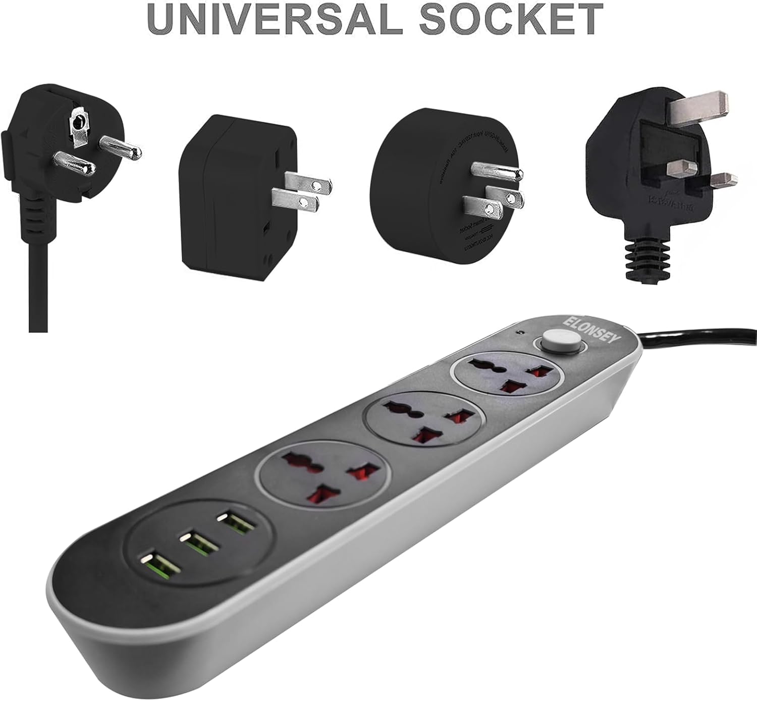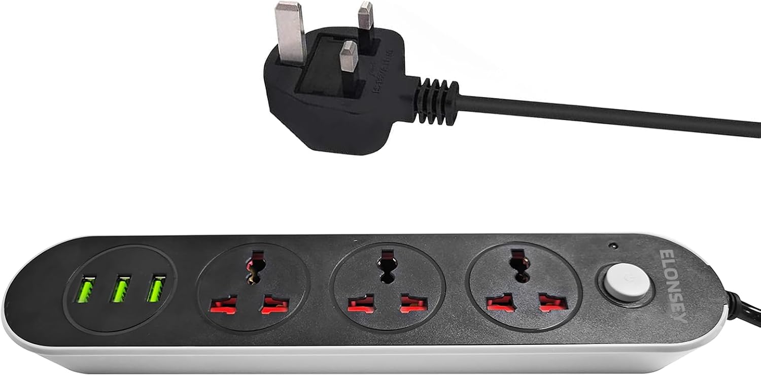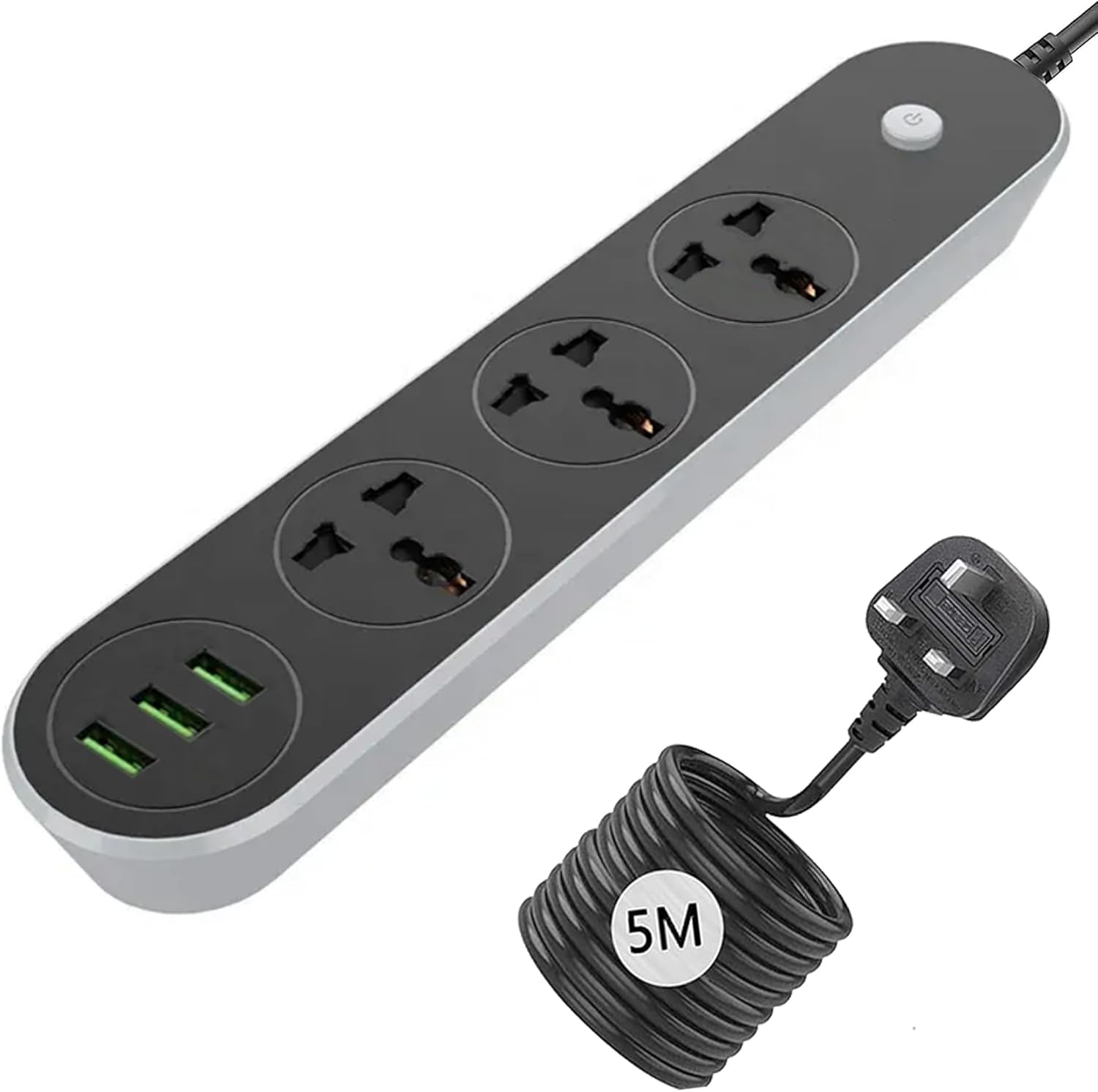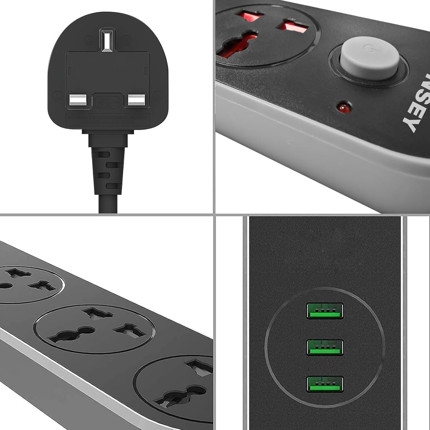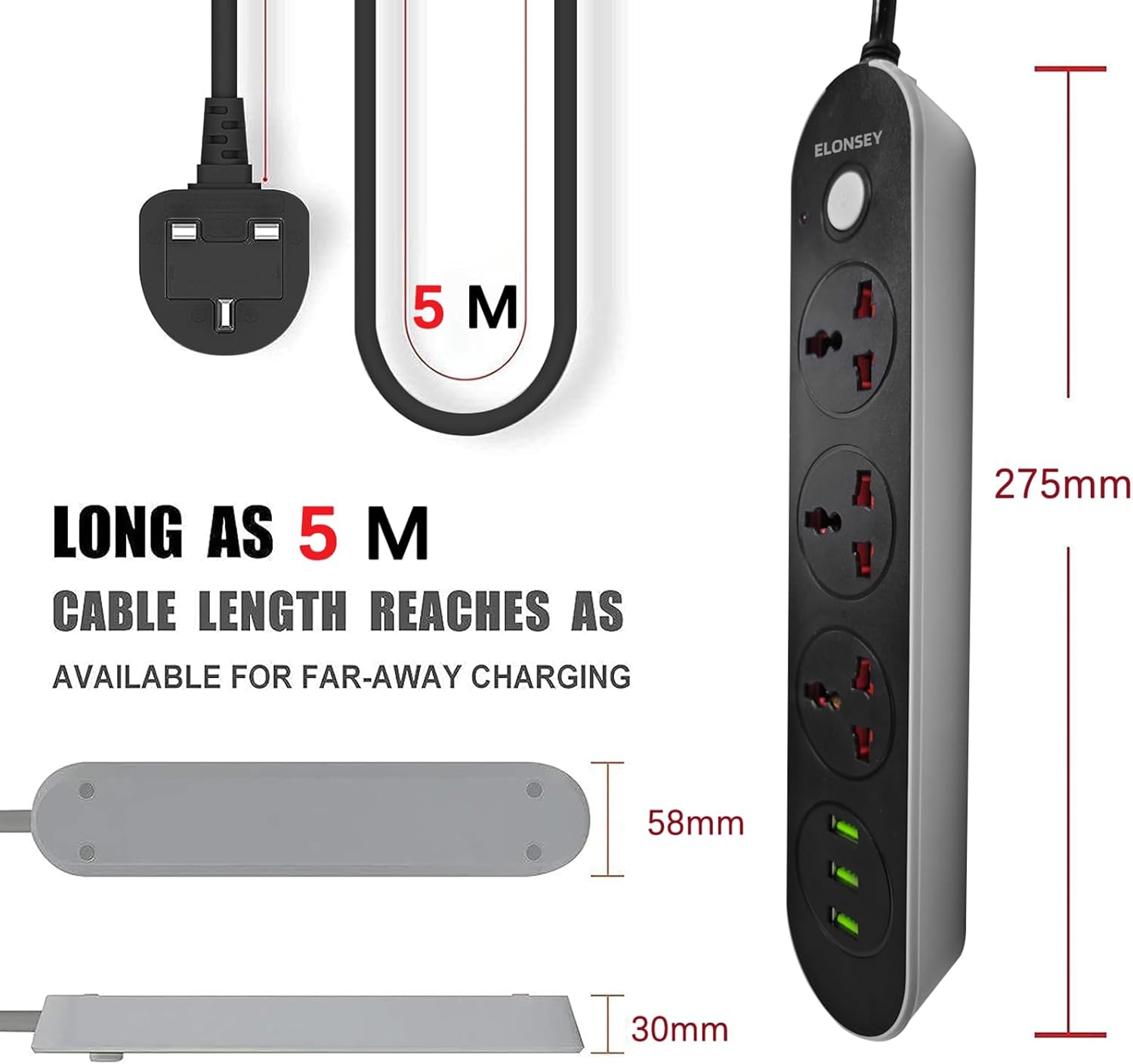 ELONSEY Universal Power Extension Cord 5 Meter, Power Strip with 3 Power Sockets and 3 USB Slots, Extension Lead 5 meter - Black (3 Socket + 3 USB)