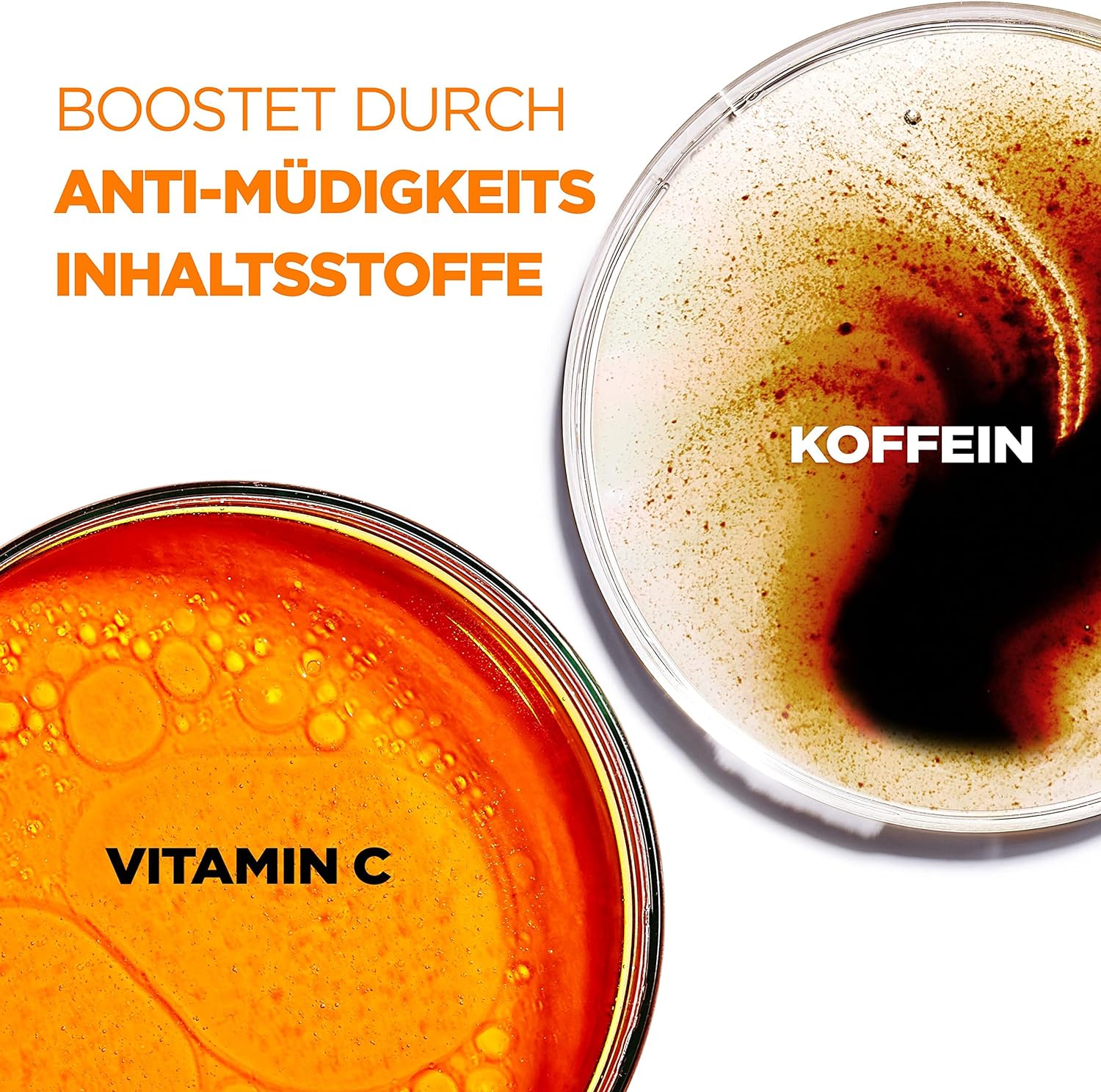 Fast-absorbing care formula with anti-fatigue ingredients, such as vitamin C and caffeine, without greasy residue