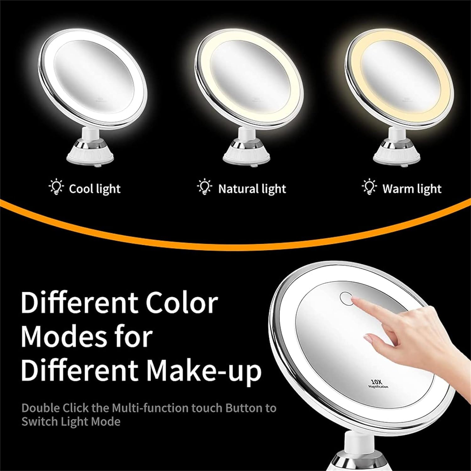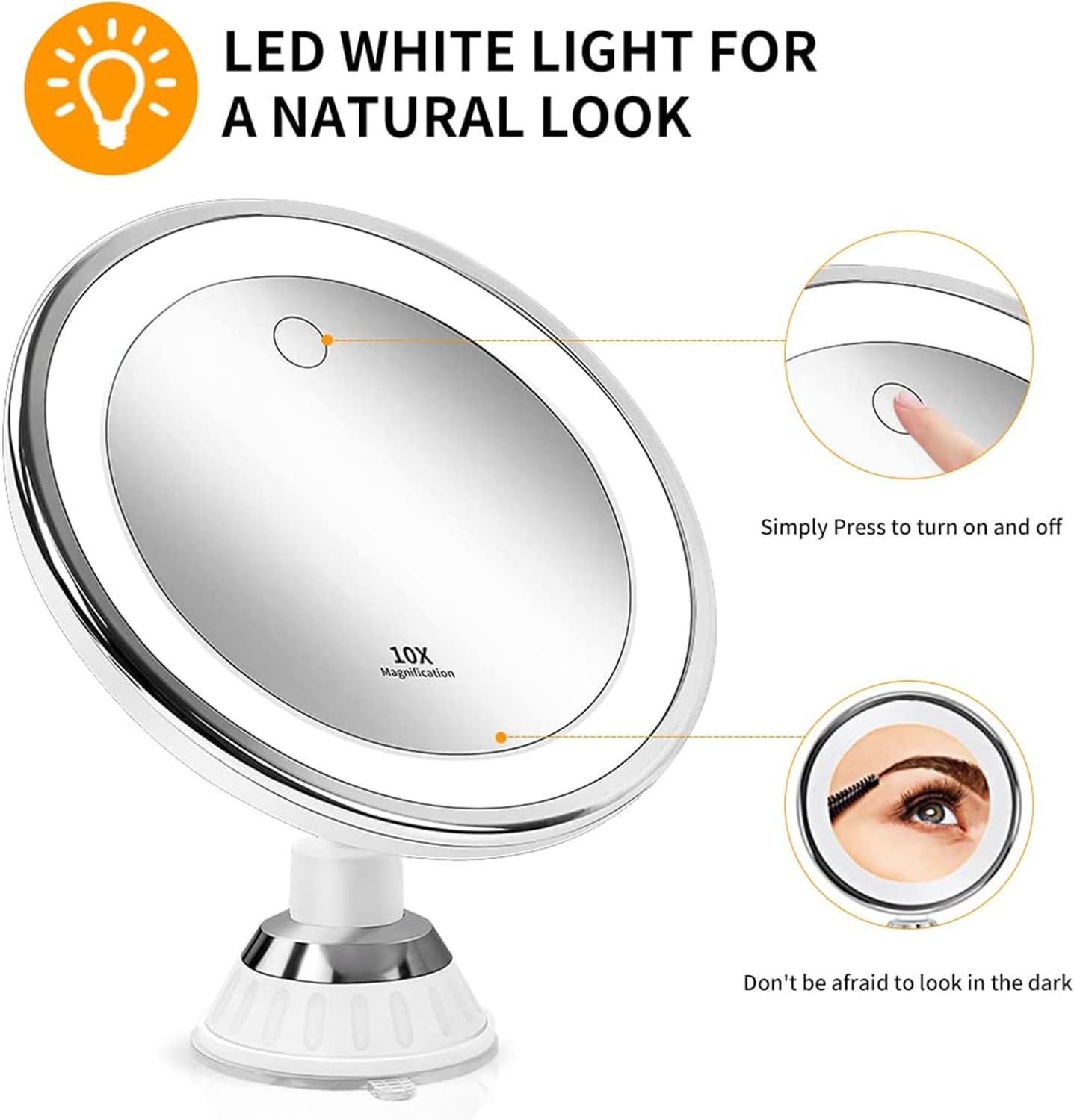 ✅【Three Light Modes】This make up mirror features warm, natural, and white colors, ideal for your makeup session at any time of the day. Magnifying mirror features heavy-duty suction cups that make it easy to attach on any smooth surface and provide you with the optimal resources for eye-catching makeup.