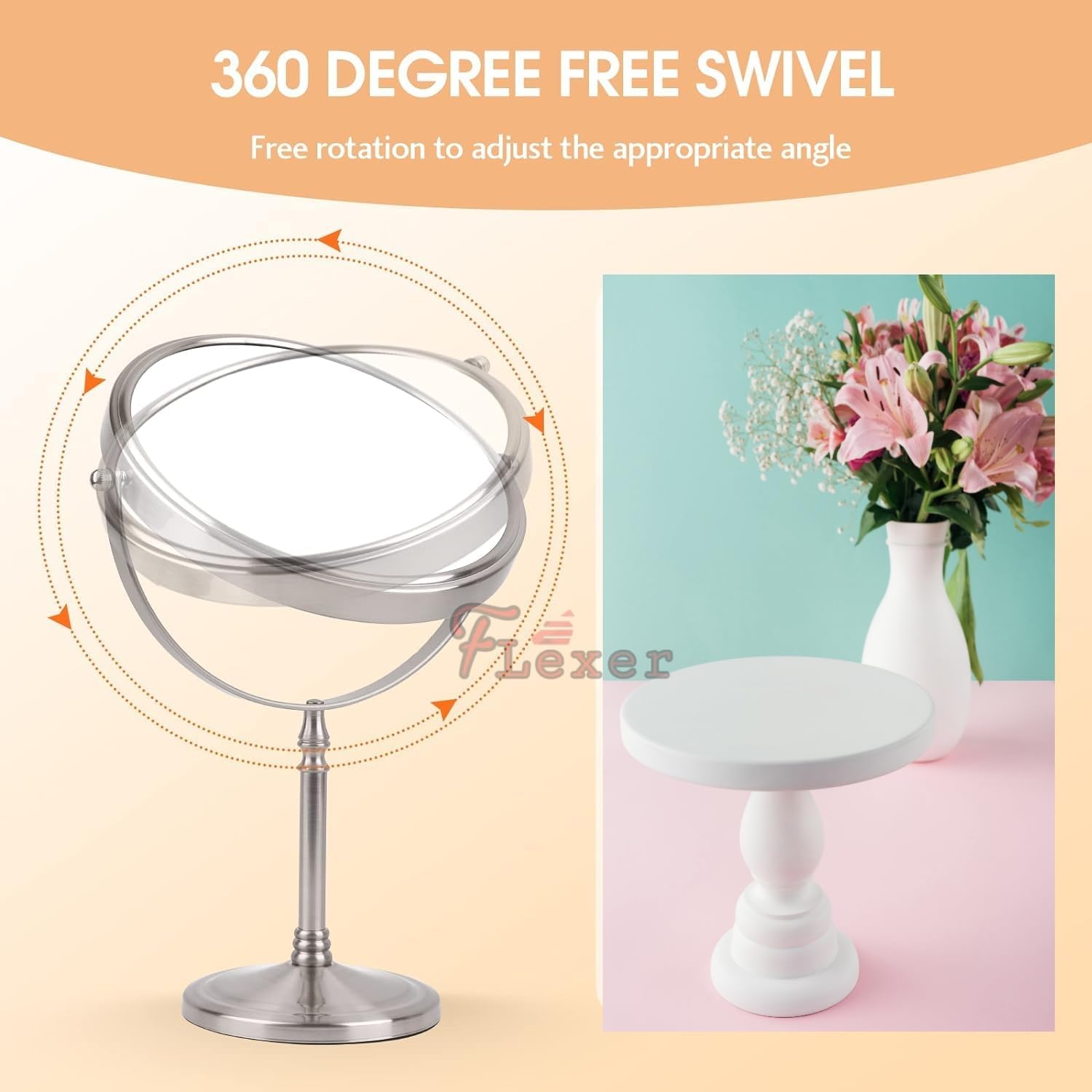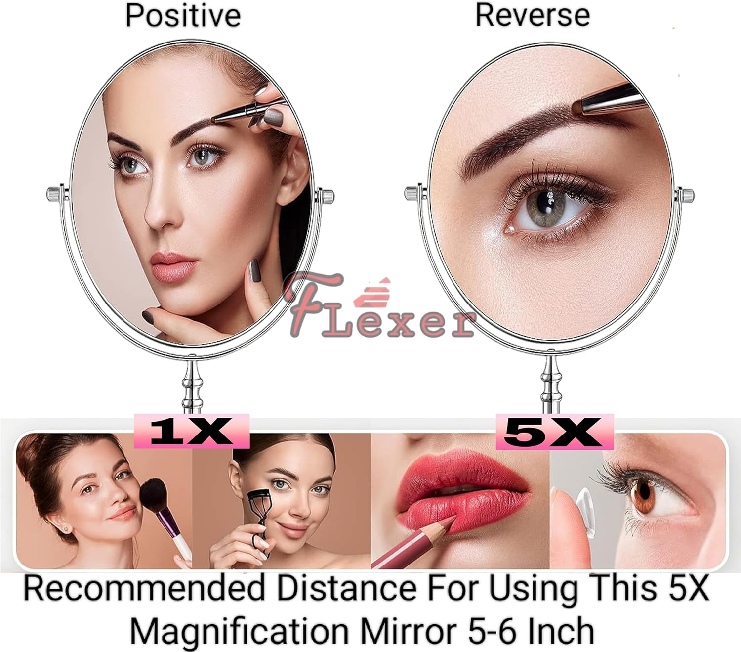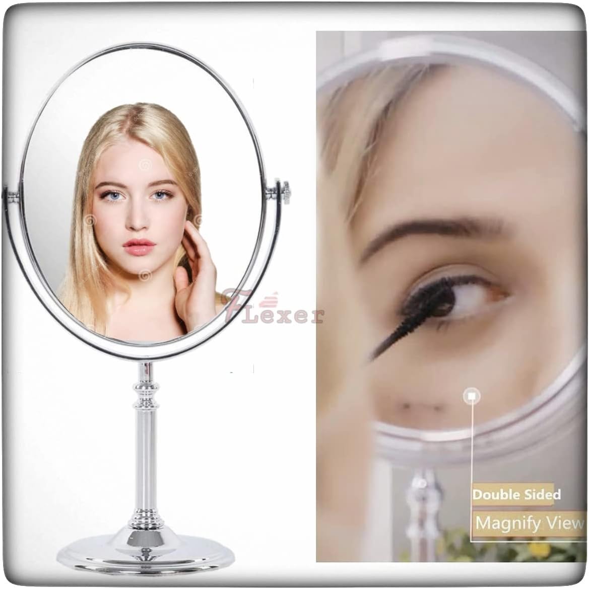 FLEXER Dual Sided Magnifying Mirror 5X and 1X Make Up Mirror Portable Table Mirrors with Stand for Woman & Man Chrome Finish (Silver)
