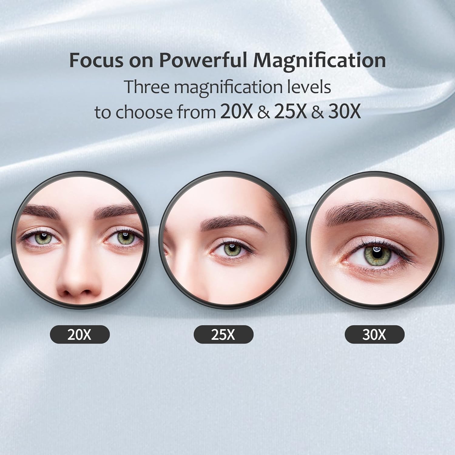30X Magnifying Mirror: 30X magnification is unimaginable, you need to be 3 inches away from the mirror to start using it, if you still can't see you need to get a little closer; in addition you can use it to check the blemishes after makeup, you can also use it to get rid of blackheads and messy eyebrows and beards, both men and women are very practical;
