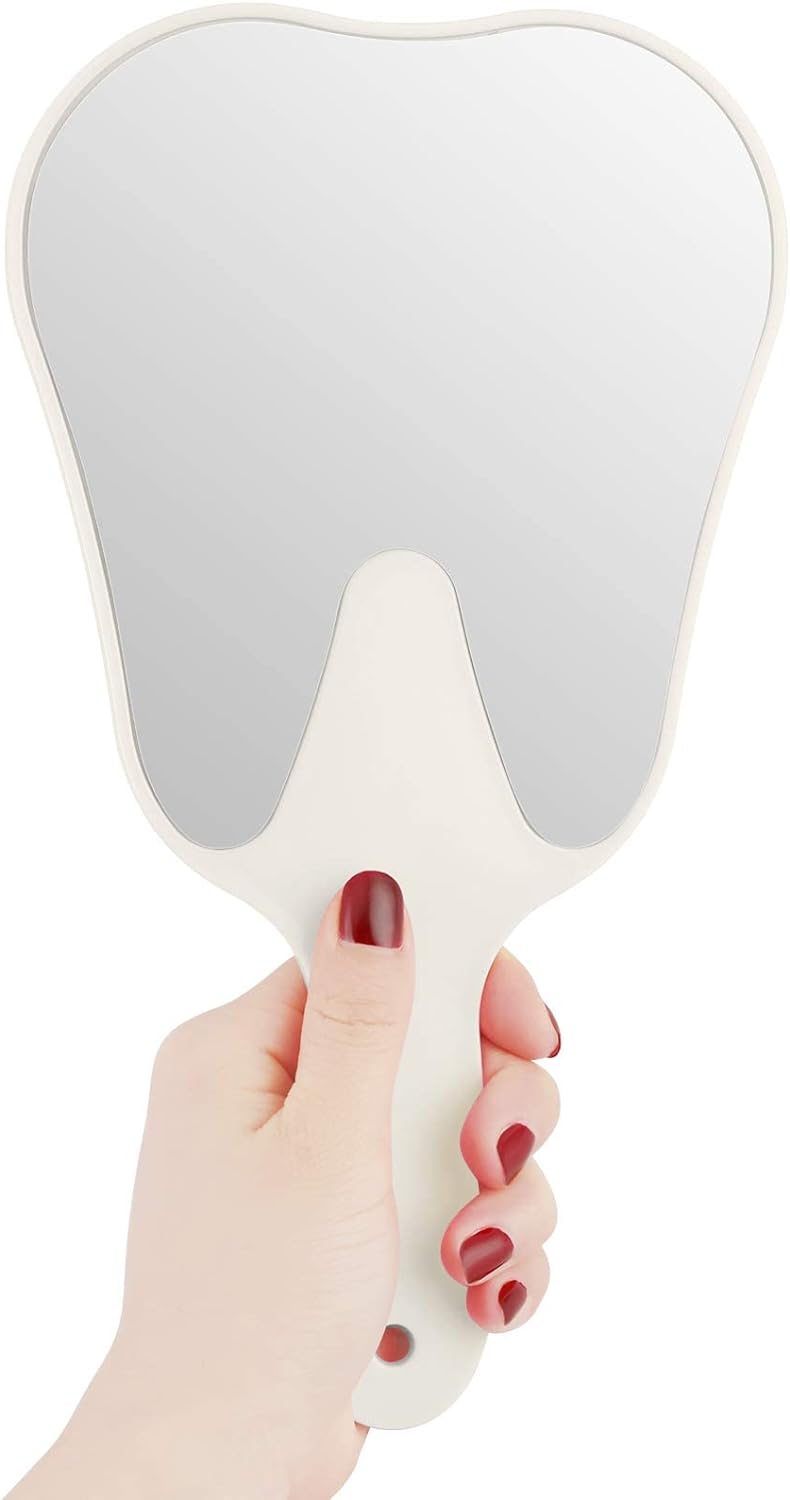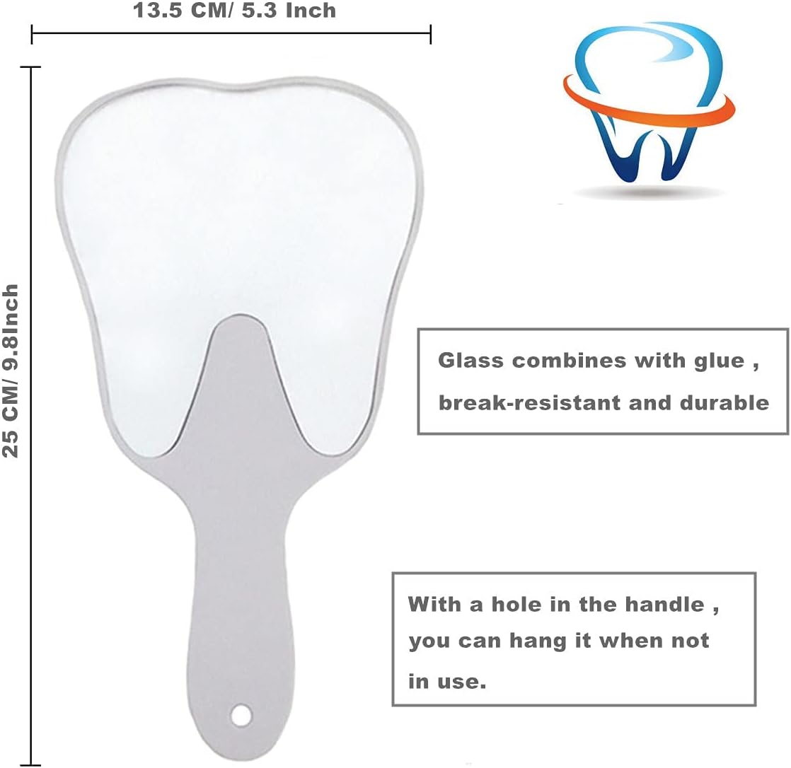 đȘăLightweight and compactăThe tooth-shaped handheld mirror is lightweight and portable, about 24.5 X 13.5 cm / 9.6 X 5.3 inches.