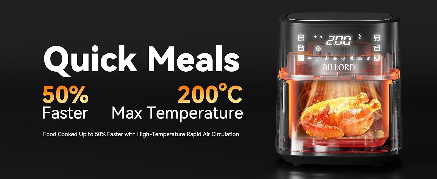 【Precision Temperature Control】 Experience culinary perfection with the Billord Air Fryer's precise temperature control, ranging from 80℃ to 200℃. Tailor the temperature to your ingredients, ensuring flawless results every time. Our smart temperature control simplifies meal preparation, taking the guesswork out of cooking. Contact us and you will receive professional recipes.