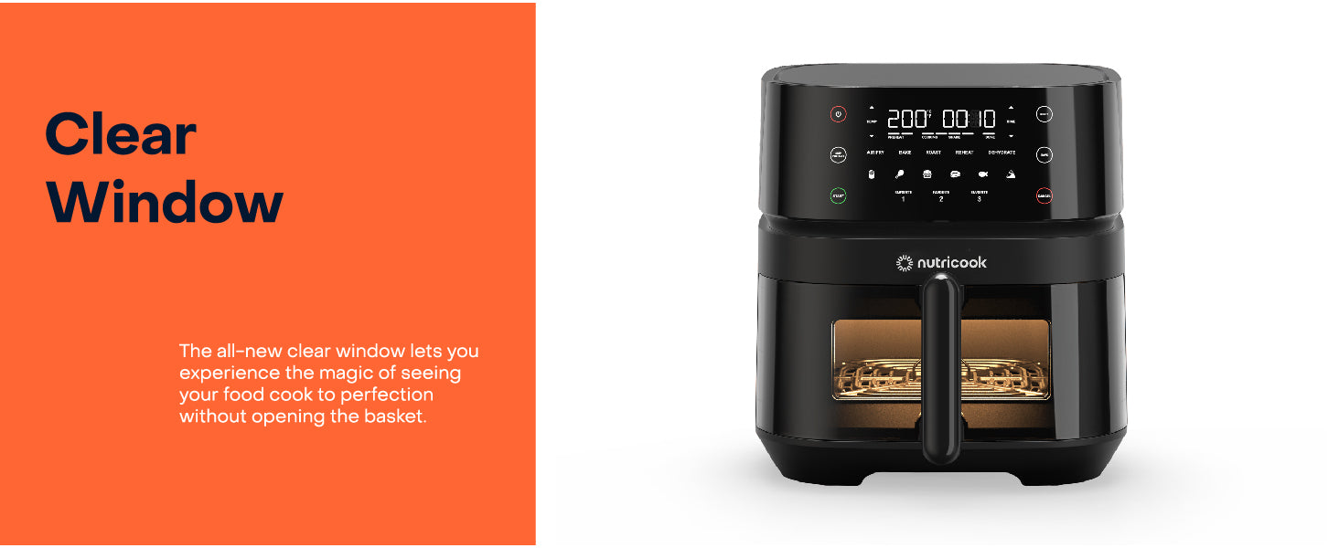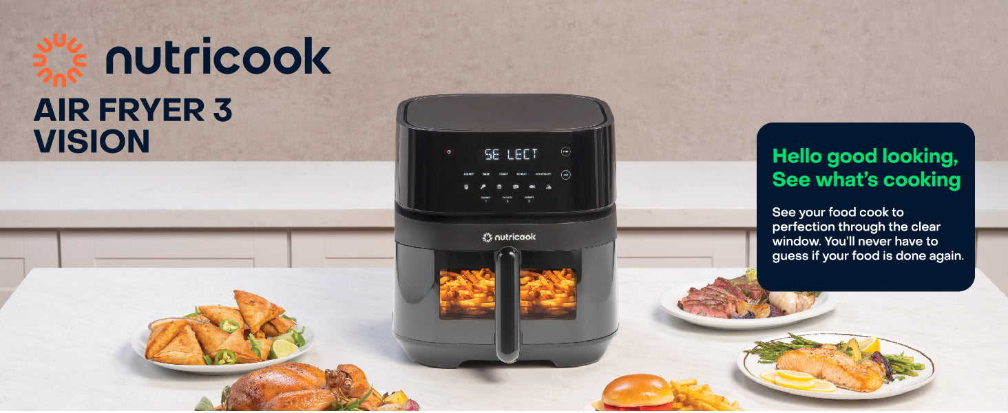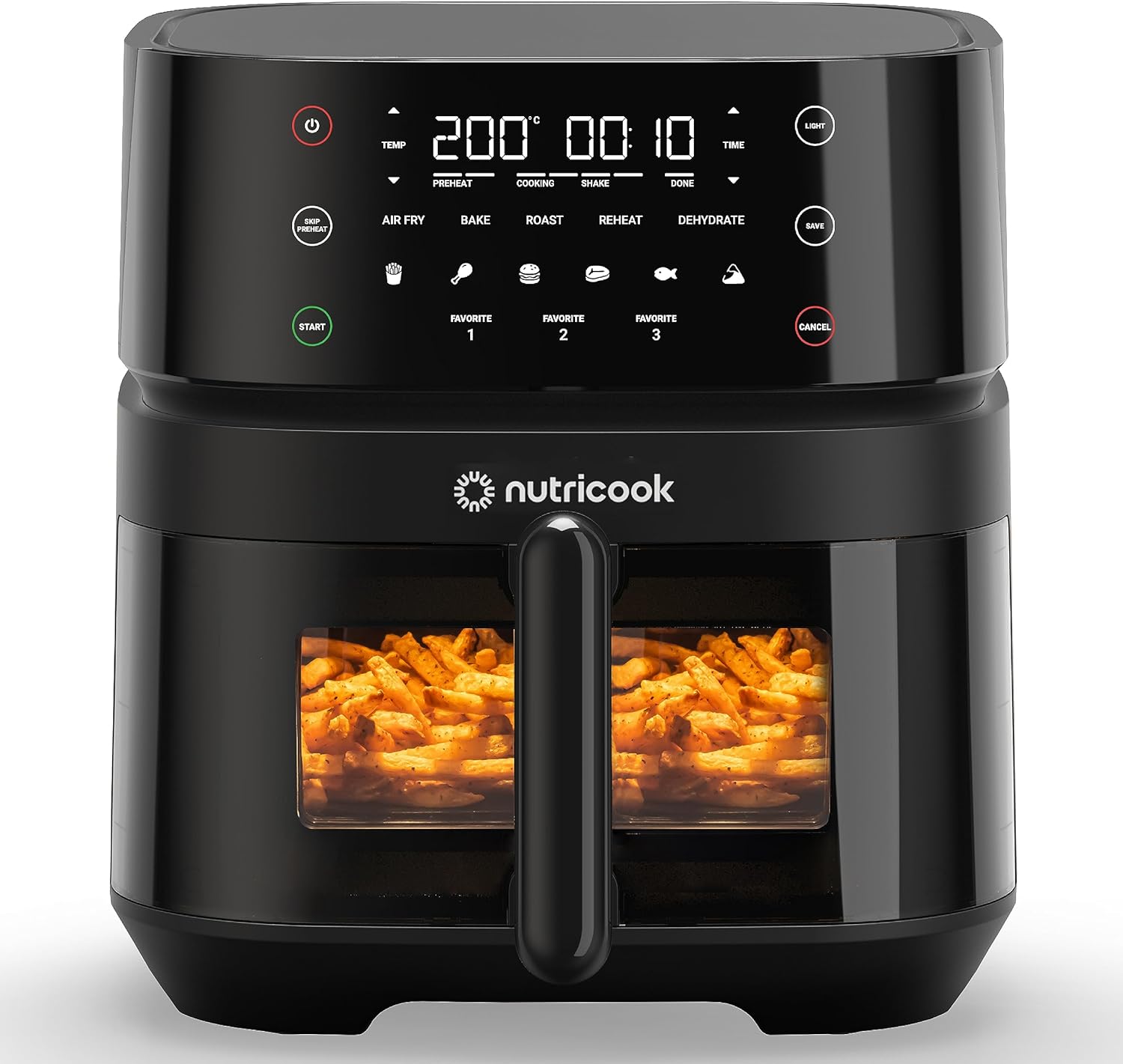 NUTRICOOK AIR FRYER 3 VISION – Our newest air fryer featuring a Clear Window, Internal Light, 11 One- touch cooking programs, Customizable favorite buttons and a sleek design for a next-level air frying experience. Designed in California.