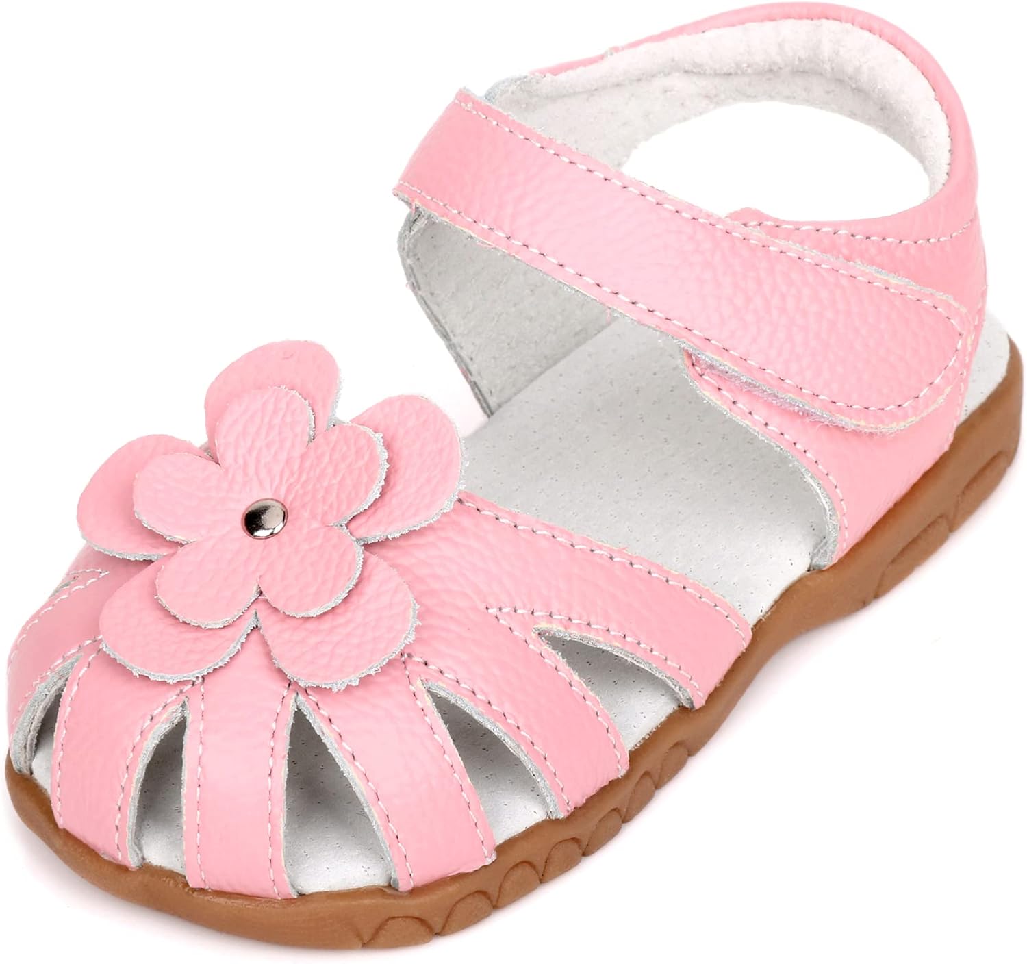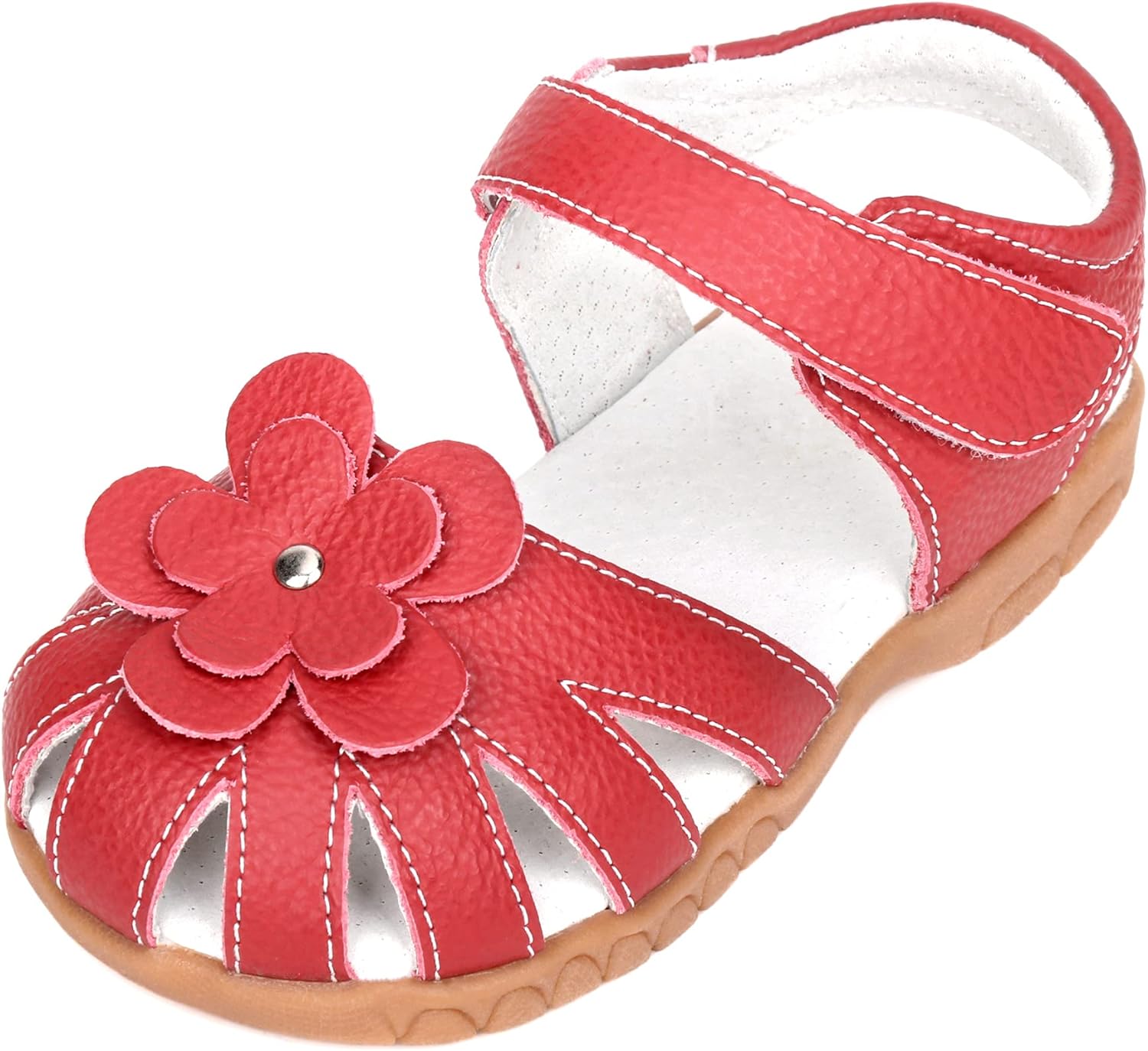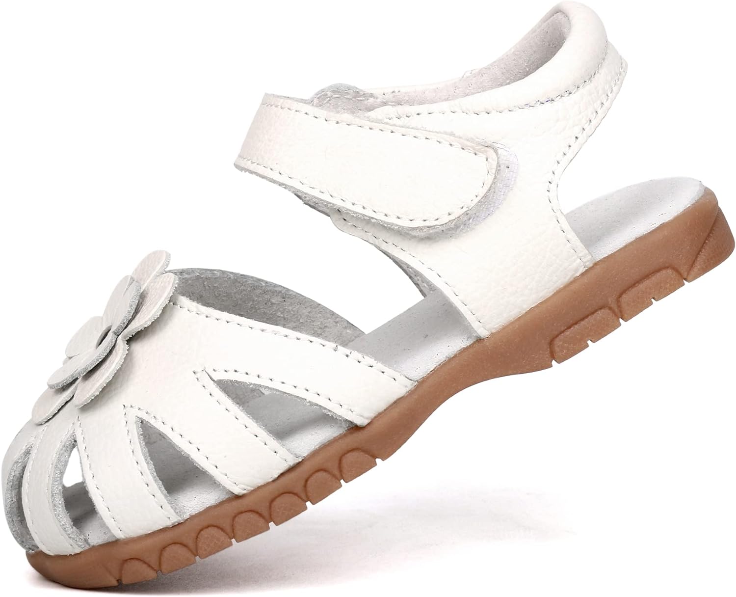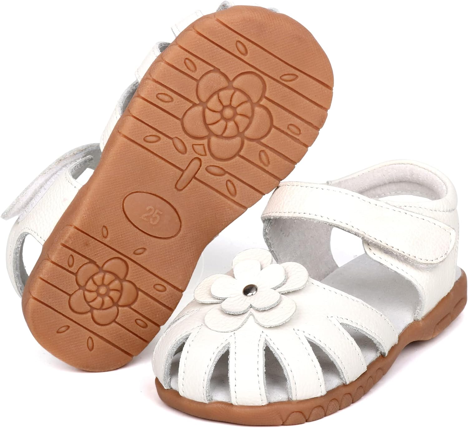 Femizee Girls Genuine Leather Soft Closed Toe Princess Flat Shoes Summer Sandals(Toddler/Little Kid) Casual, Princess, Soft, Lightweight & Comfortable Material: 100% Genuine Leather Upper Pattern: Solid Flower Decor Closure: Hook and Loop Heel Type: Flat Sole: Rubber Style: Toddler Girls Leather Sandals Occasion: School,Outdoor,Holiday,Daily,Wedding... (These Girls Sandals are carry with CN size, We have convert into US size for your selection) CN Size------------US Size---------------Foot Length(IN/CM): 20--------------4 M US Toddler--------------4.69/11.9 21--------------5 M US Toddler--------------4.88/12.4 22--------------5.5 M US Toddler------------5.08/12.9 23--------------6 M US Toddler--------------5.28/13.4 24--------------6.5 M US Toddler------------5.47/13.9 25--------------7 M US Toddler--------------5.67/14.4 26--------------8 M US Toddler--------------5.87/14.9 27--------------8.5 M US Toddler------------6.06/15.4 28--------------9 M US Toddler--------------6.26/15.9 29--------------9.5 M US Toddler------------6.46/16.4 30--------------10 M US Toddler-------------6.65/16.9 31--------------11 M US Little Kid----------6.85/17.4 32--------------11.5 M US Little Kid--------7.05/17.9This Femizee Leather Girls sandals are closed toe designed, with a strap protecting toes from scrapes and stubs, comfortable and durable. Breathable high quality cow leather upper, great for your kids everyday wear, let their little feet stay comfortable and protected all-day long.