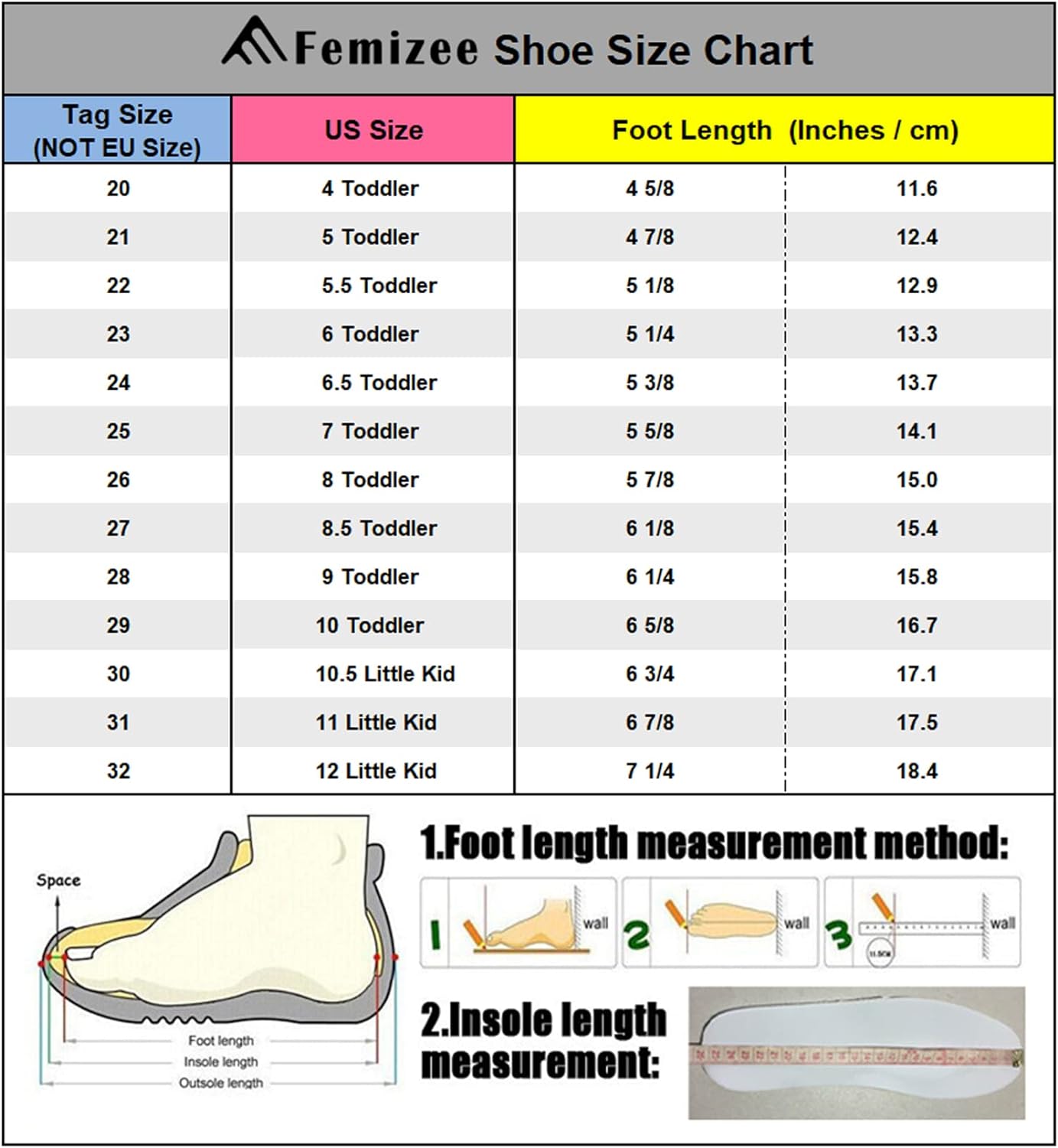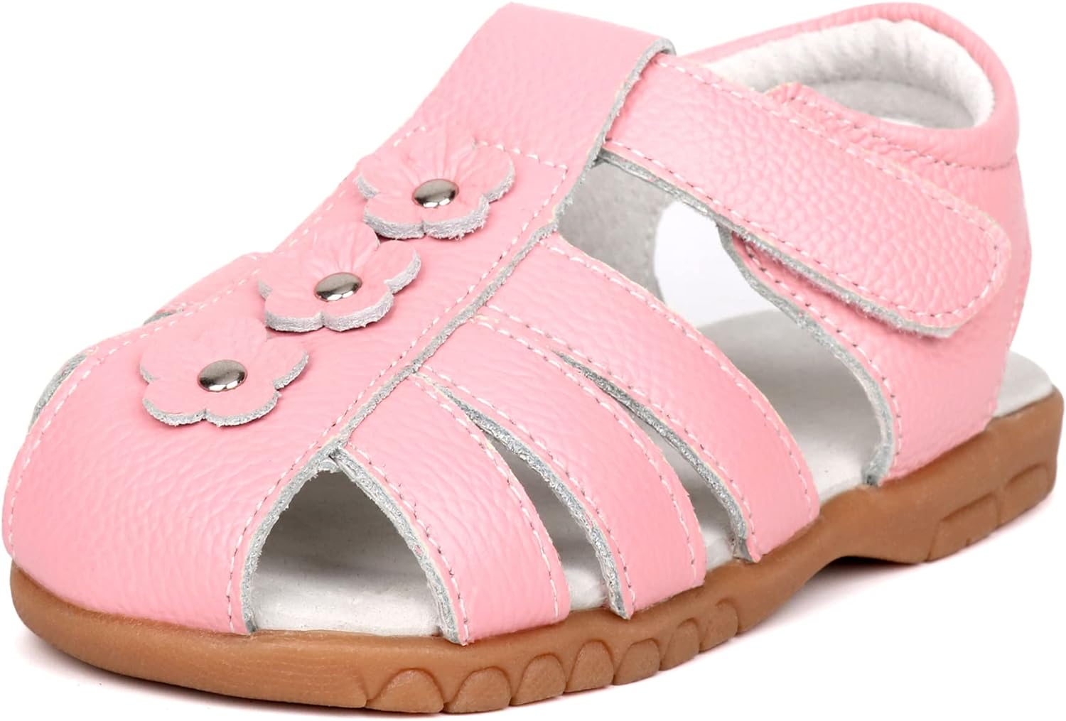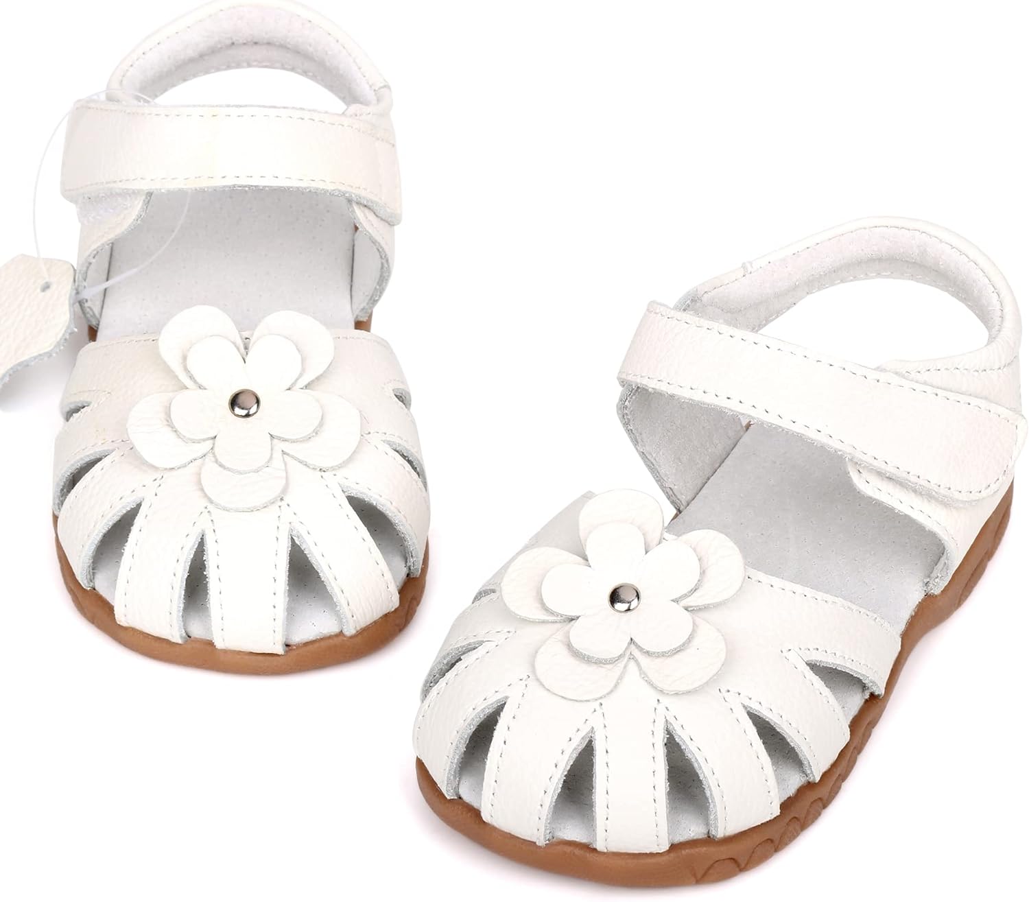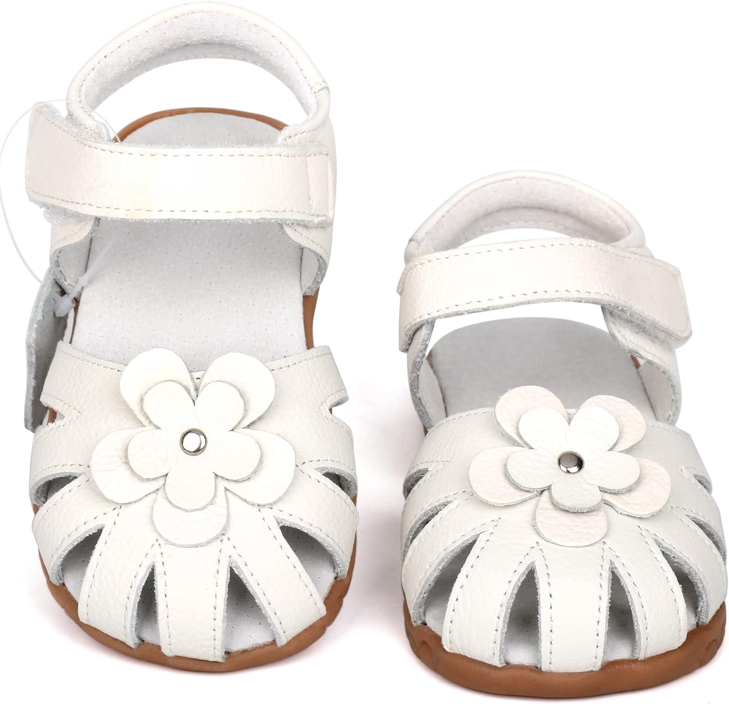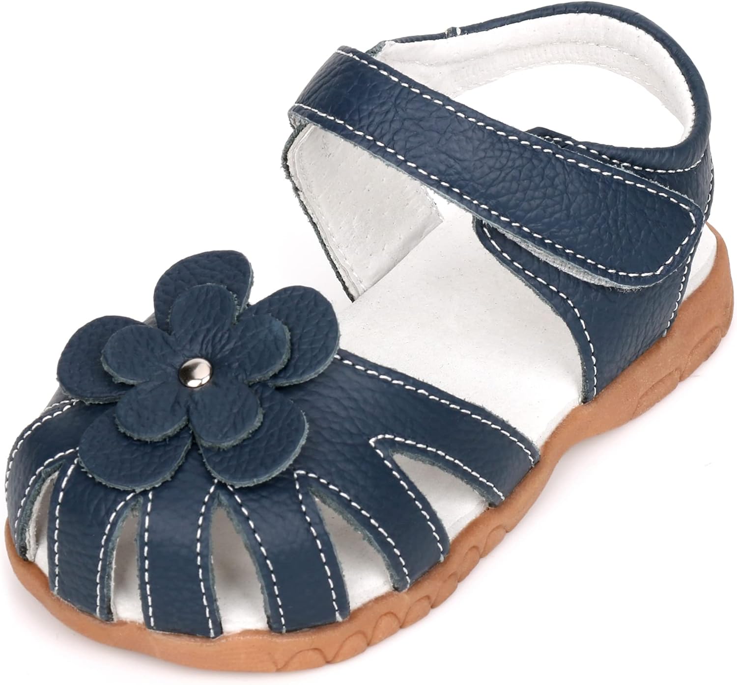 Femizee Girls Genuine Leather Soft Closed Toe Princess Flat Shoes Summer Sandals(Toddler/Little Kid) Casual, Princess, Soft, Lightweight & Comfortable Material: 100% Genuine Leather Upper Pattern: Solid Flower Decor Closure: Hook and Loop Heel Type: Flat Sole: Rubber Style: Toddler Girls Leather Sandals Occasion: School,Outdoor,Holiday,Daily,Wedding... (These Girls Sandals are carry with CN size, We have convert into US size for your selection) CN Size------------US Size---------------Foot Length(IN/CM): 20--------------4 M US Toddler--------------4.69/11.9 21--------------5 M US Toddler--------------4.88/12.4 22--------------5.5 M US Toddler------------5.08/12.9 23--------------6 M US Toddler--------------5.28/13.4 24--------------6.5 M US Toddler------------5.47/13.9 25--------------7 M US Toddler--------------5.67/14.4 26--------------8 M US Toddler--------------5.87/14.9 27--------------8.5 M US Toddler------------6.06/15.4 28--------------9 M US Toddler--------------6.26/15.9 29--------------9.5 M US Toddler------------6.46/16.4 30--------------10 M US Toddler-------------6.65/16.9 31--------------11 M US Little Kid----------6.85/17.4 32--------------11.5 M US Little Kid--------7.05/17.9This Femizee Leather Girls sandals are closed toe designed, with a strap protecting toes from scrapes and stubs, comfortable and durable. Breathable high quality cow leather upper, great for your kids everyday wear, let their little feet stay comfortable and protected all-day long.
