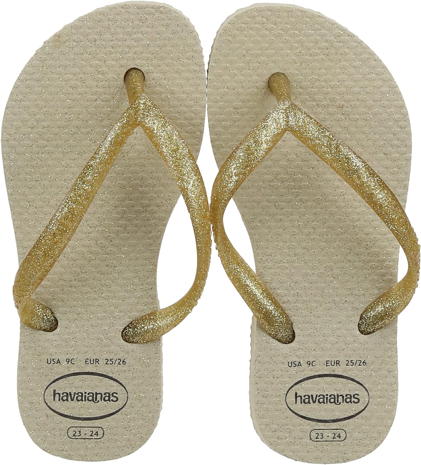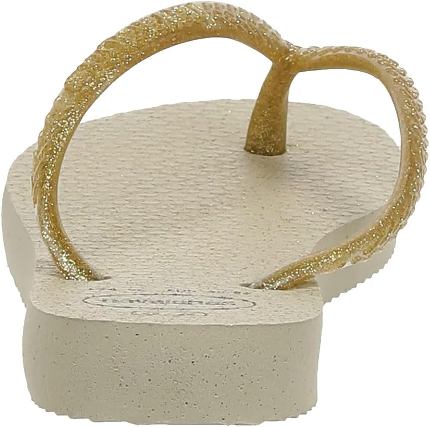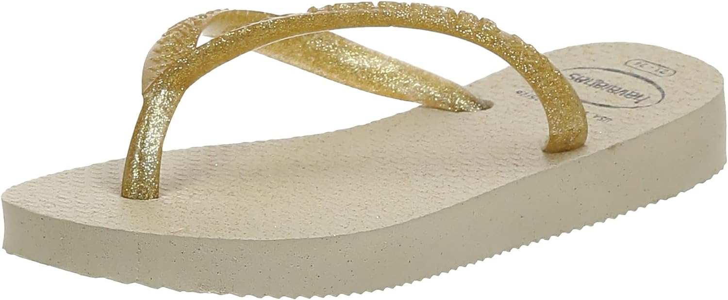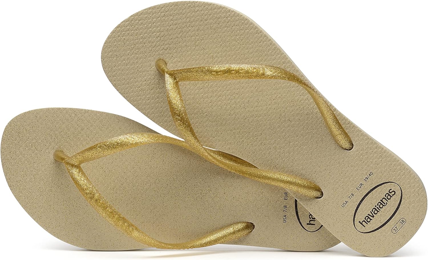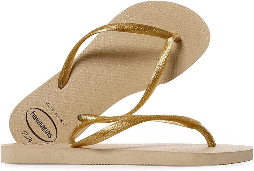 • LET YOUR STEP SPARKLE: The Havaianas Slim Gloss sandal features the iconic Slim collection's feminine silhouette and slim straps and sole. With the glitter-covered soles and an extra injection of glitter into the straps, this sandal is sure to sparkle.