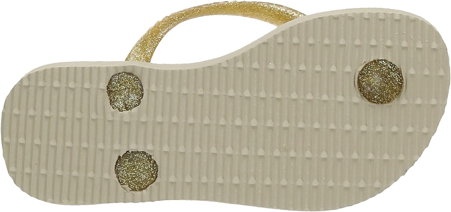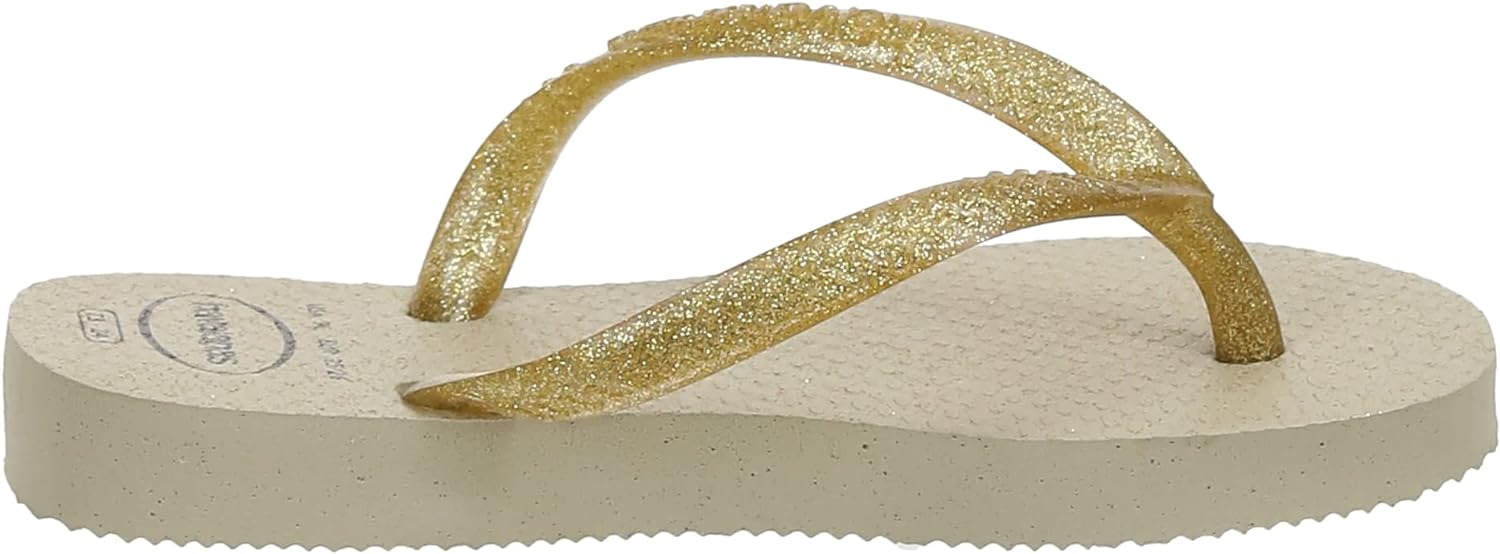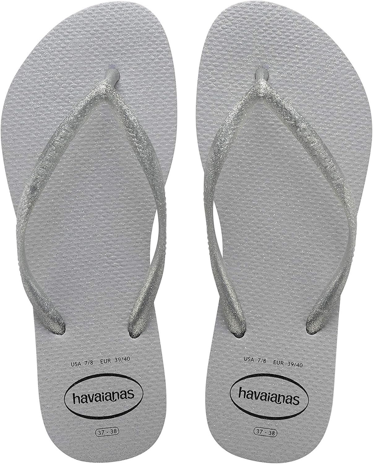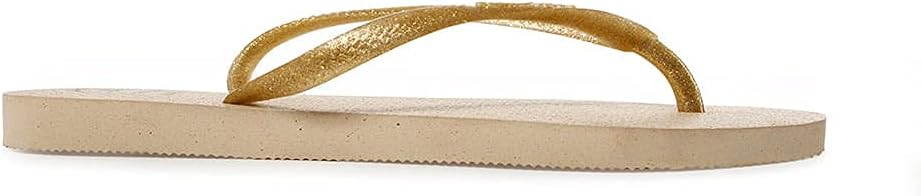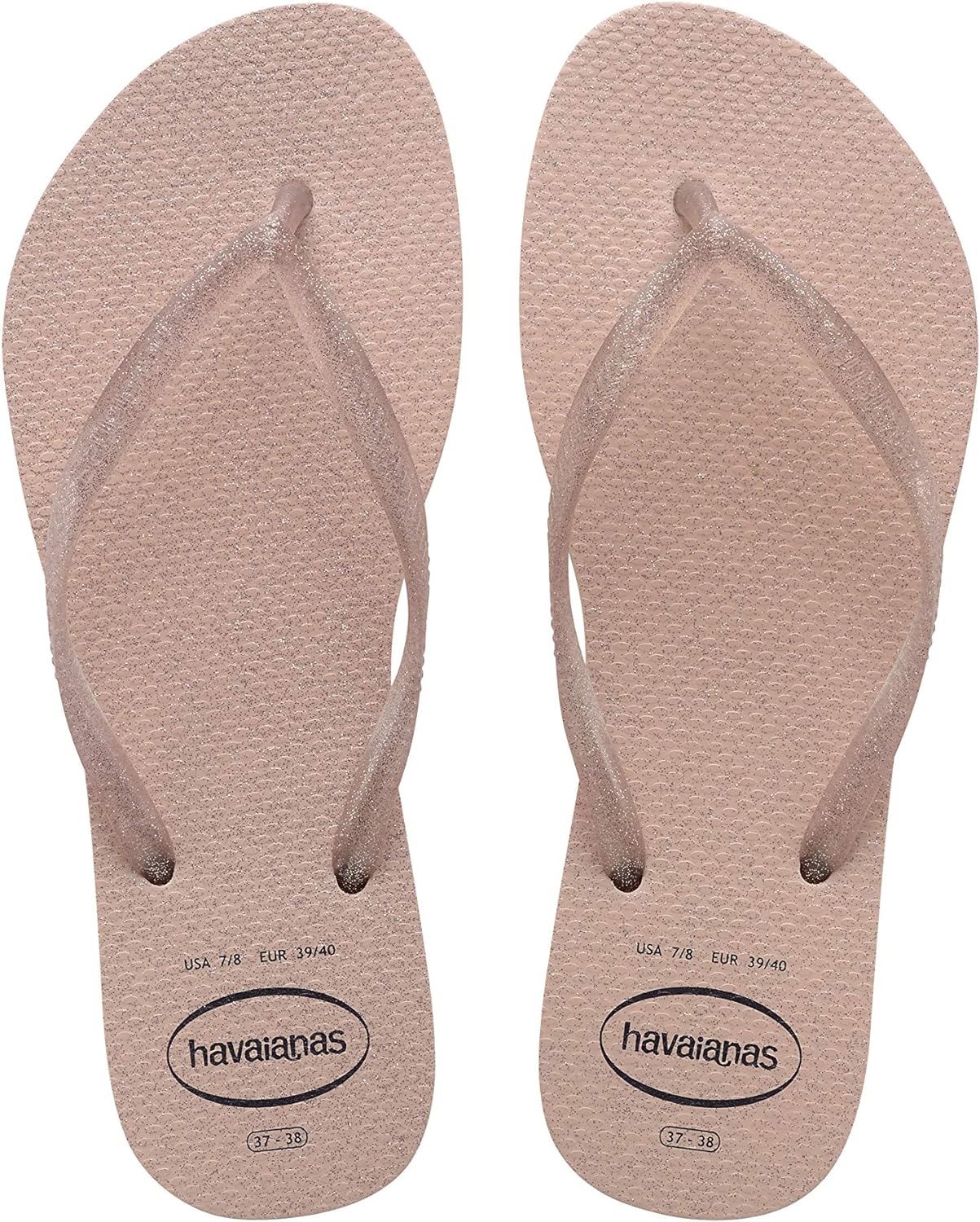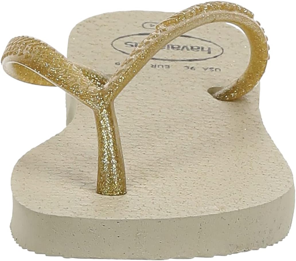 • LET YOUR STEP SPARKLE: The Havaianas Slim Gloss sandal features the iconic Slim collection's feminine silhouette and slim straps and sole. With the glitter-covered soles and an extra injection of glitter into the straps, this sandal is sure to sparkle.